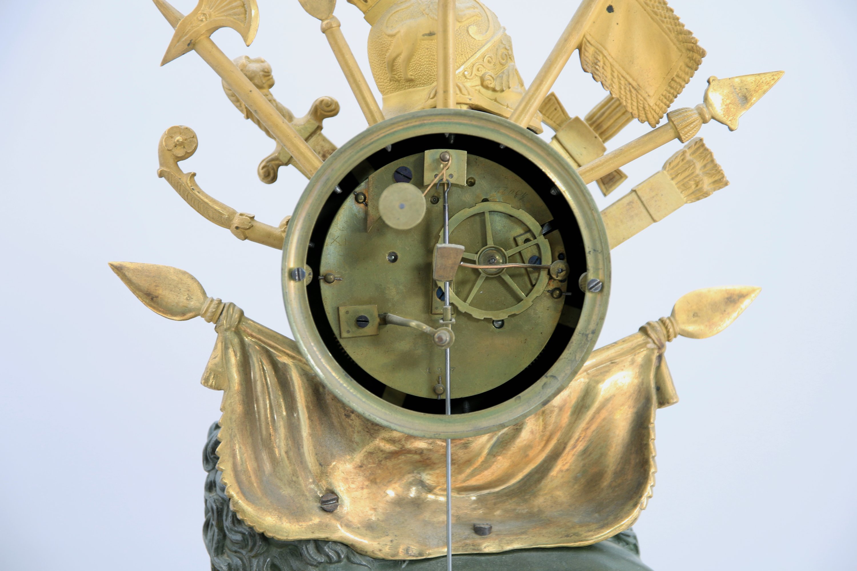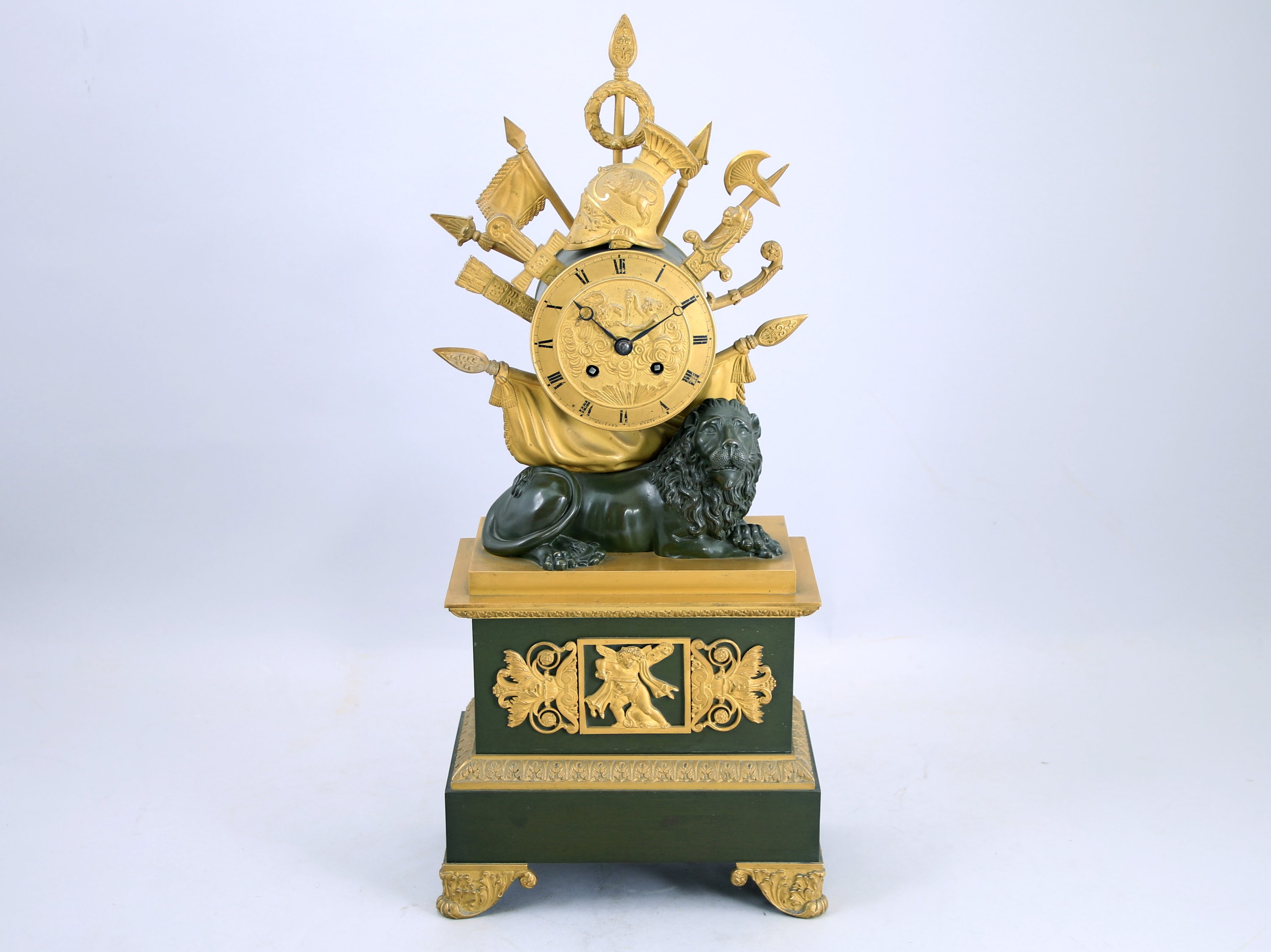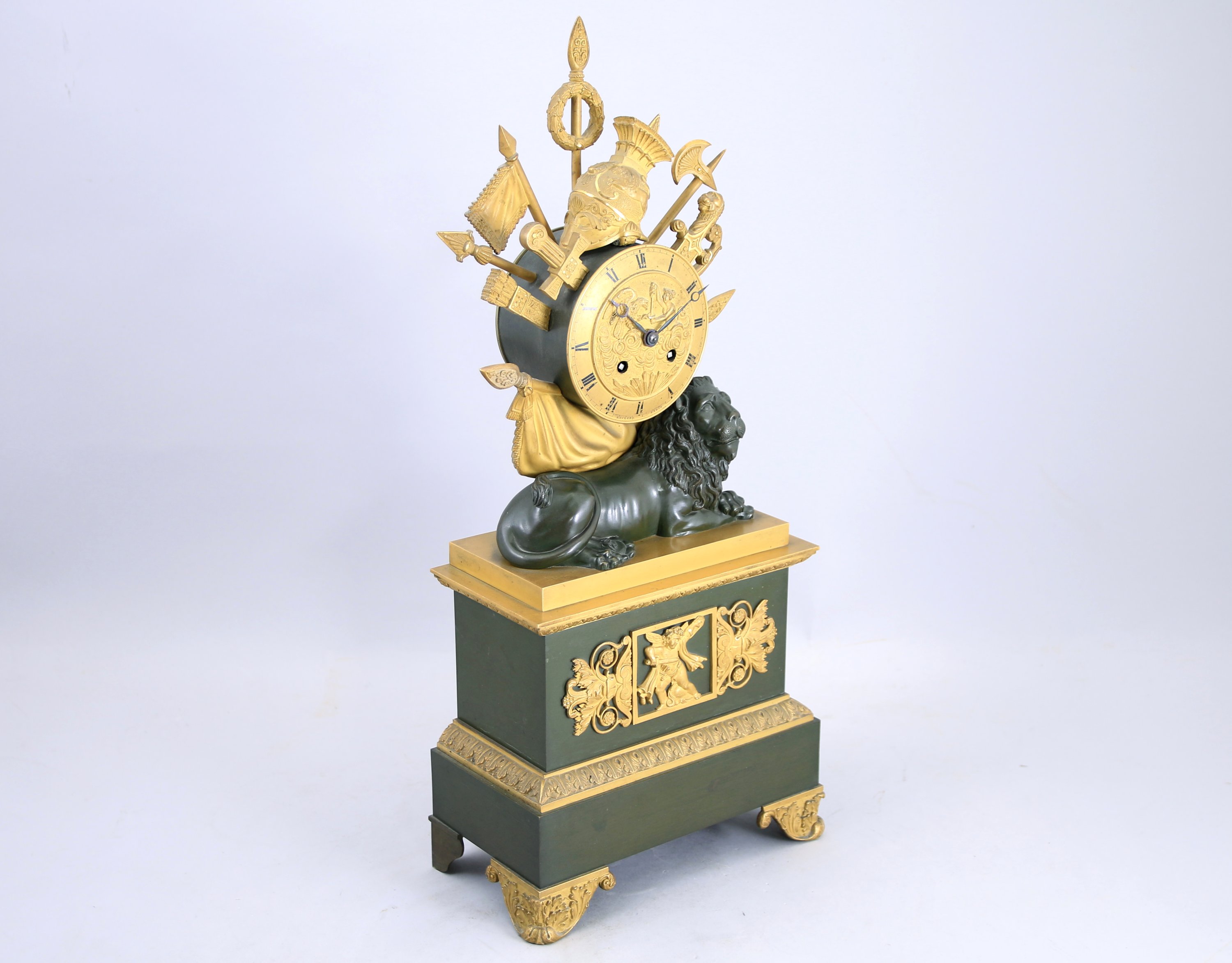 PENDULE AU LION ET TROPHÉES ANTIQUES en bronze doré et bronze à patine verte.