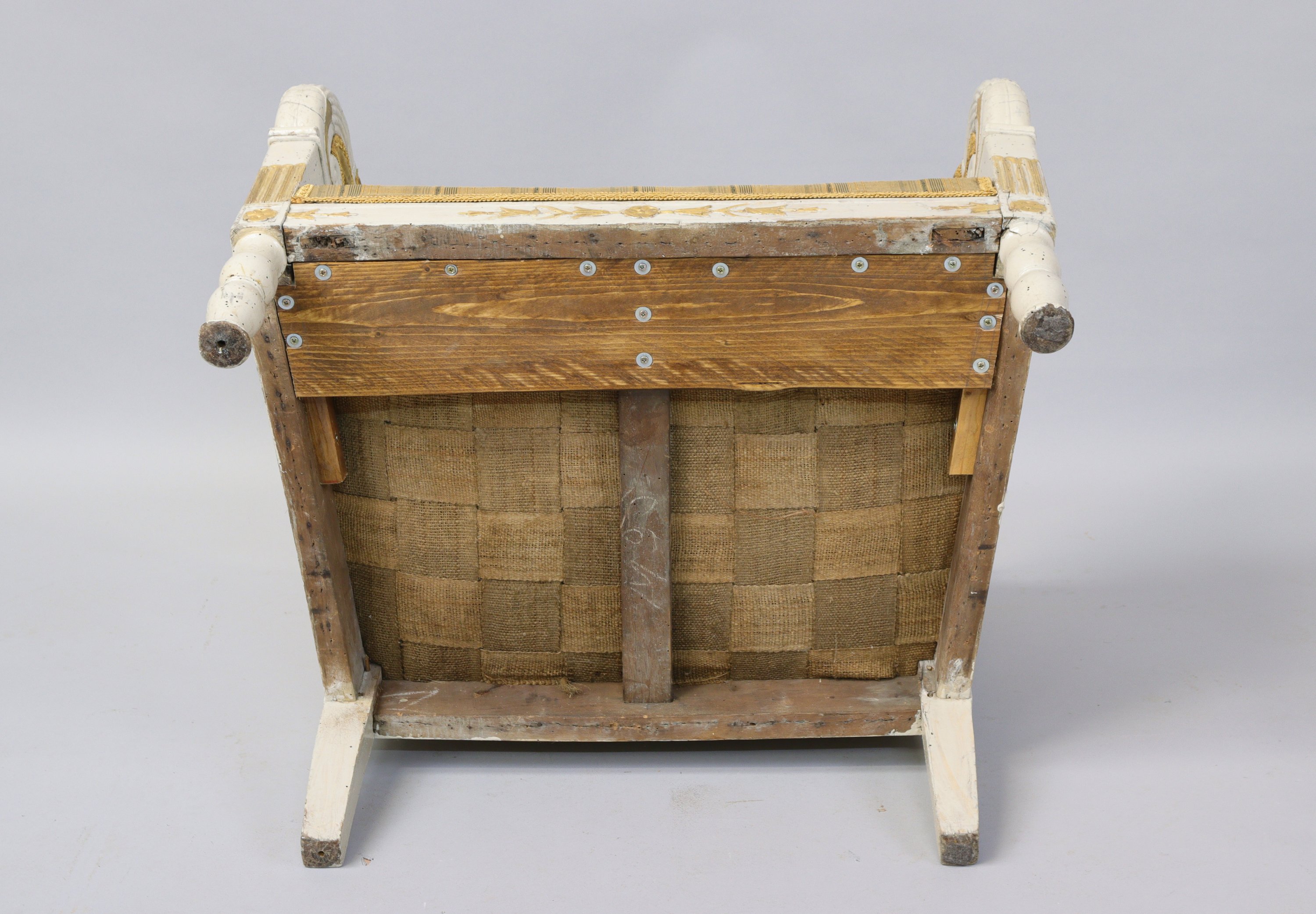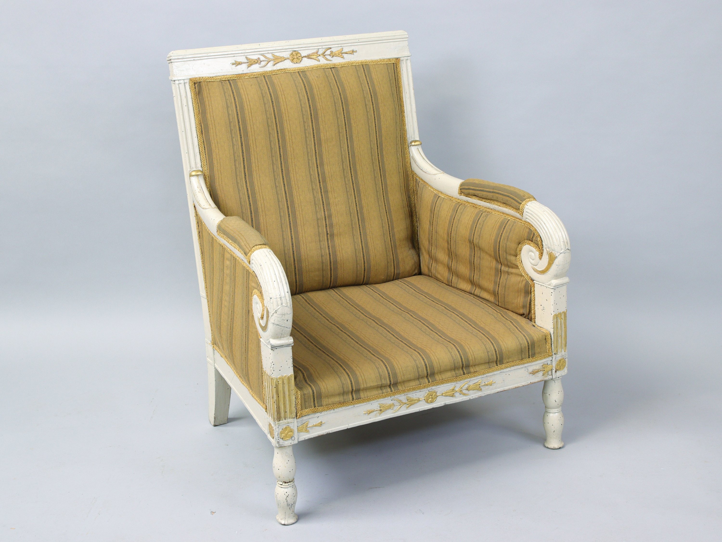 FAUTEUIL à dossier plat en bois laqué mouluré et sculpté, animé en partie haute de fleurettes, accoudoirs à enroulements et pieds arrières en sabre.