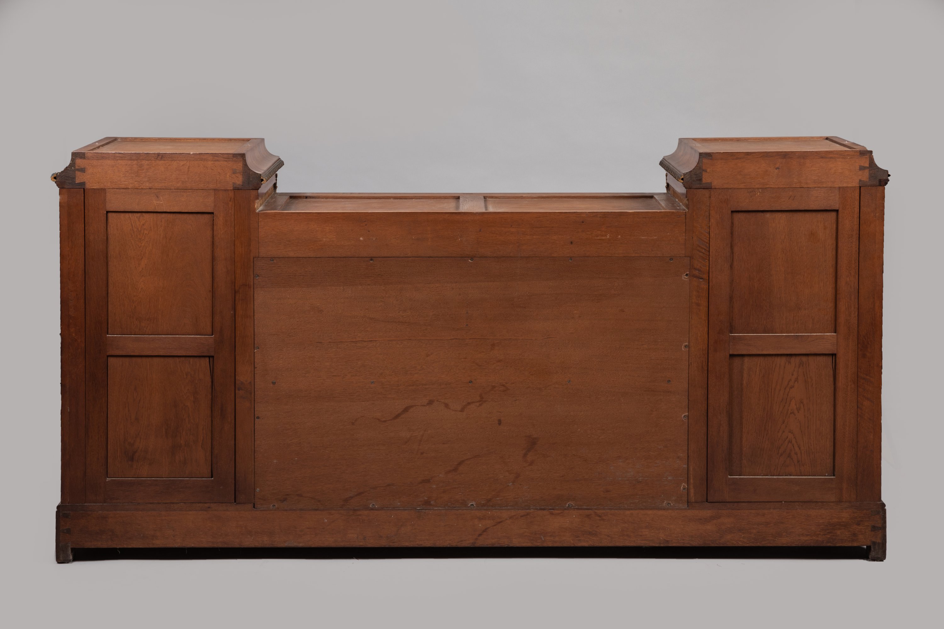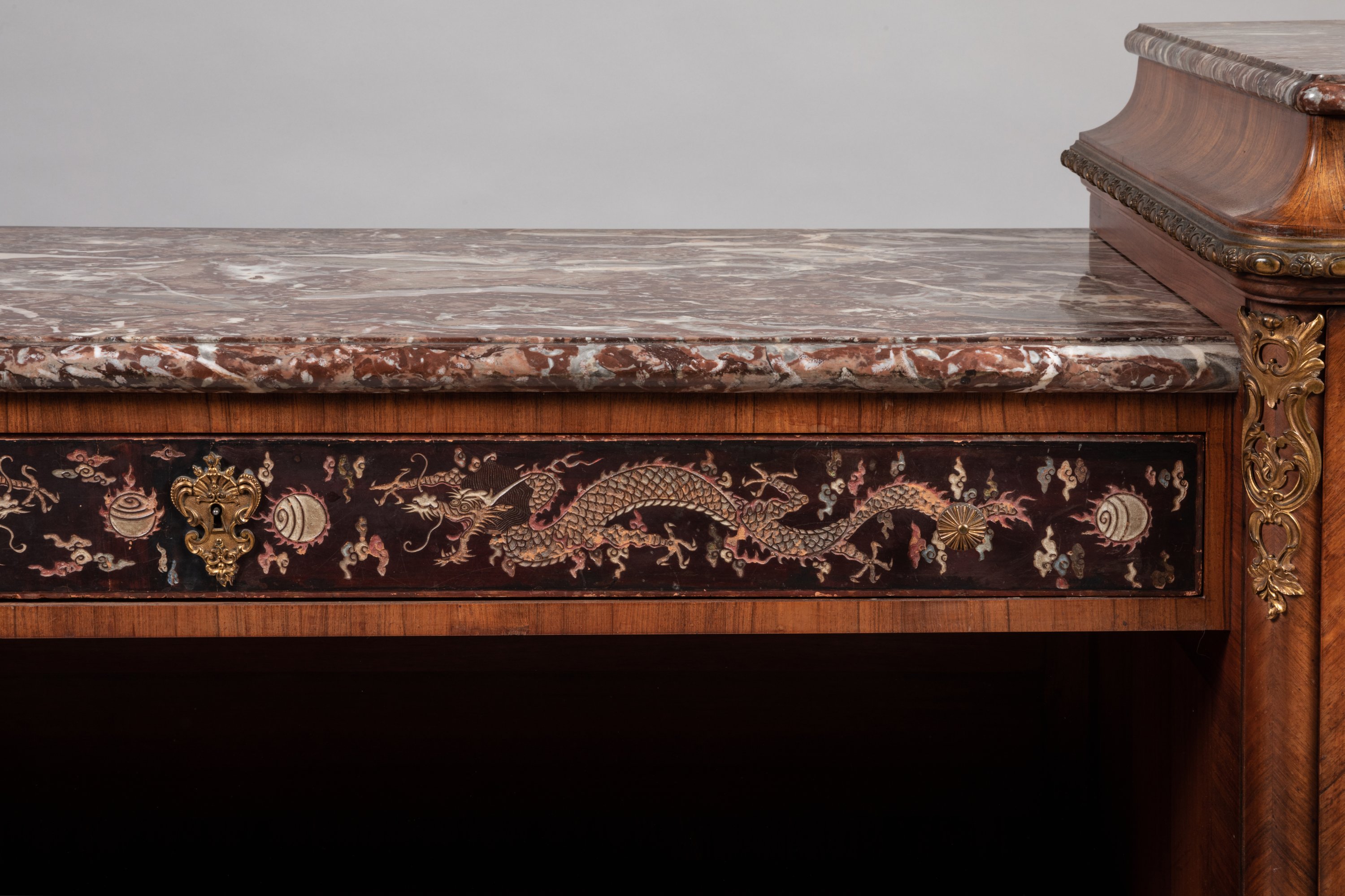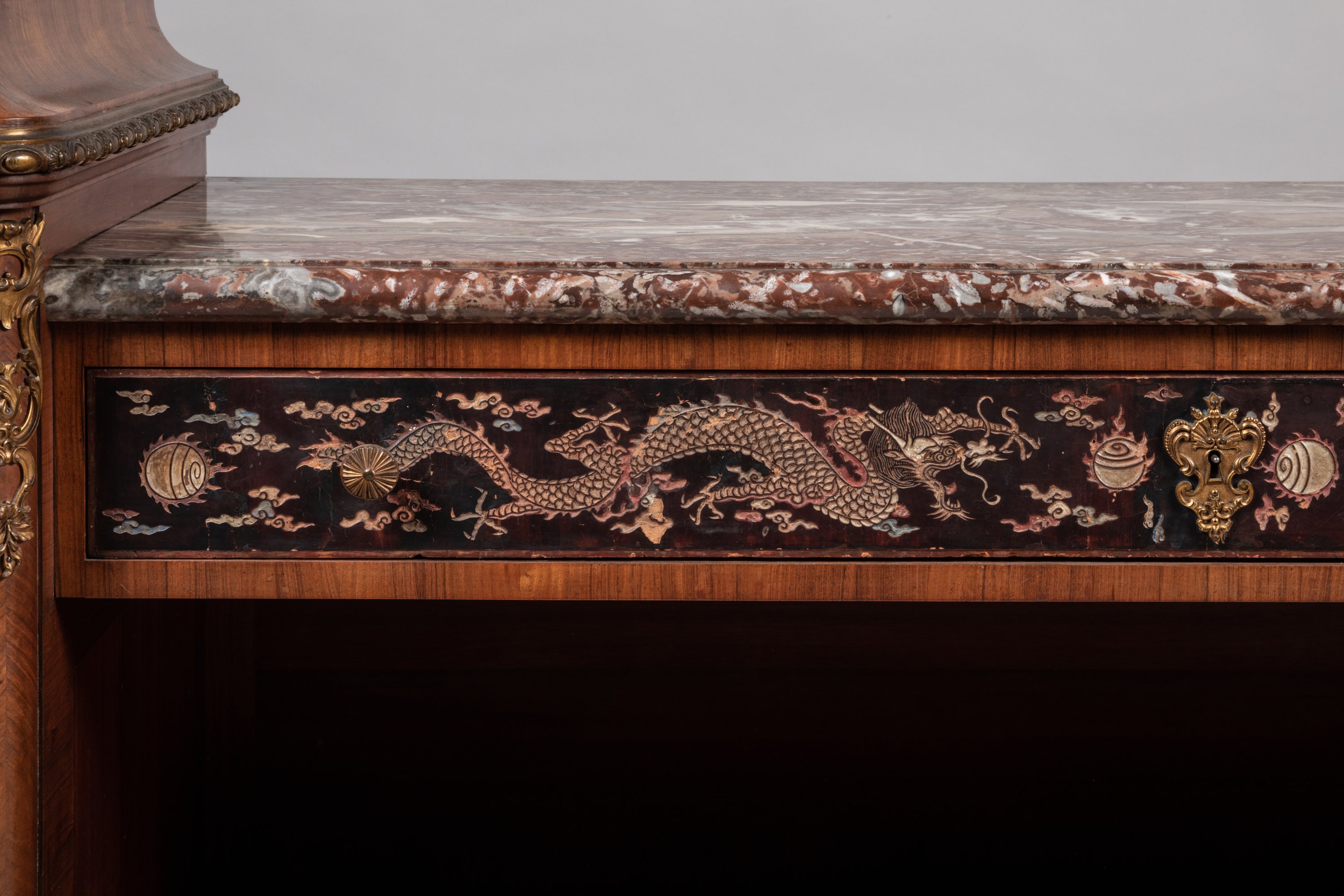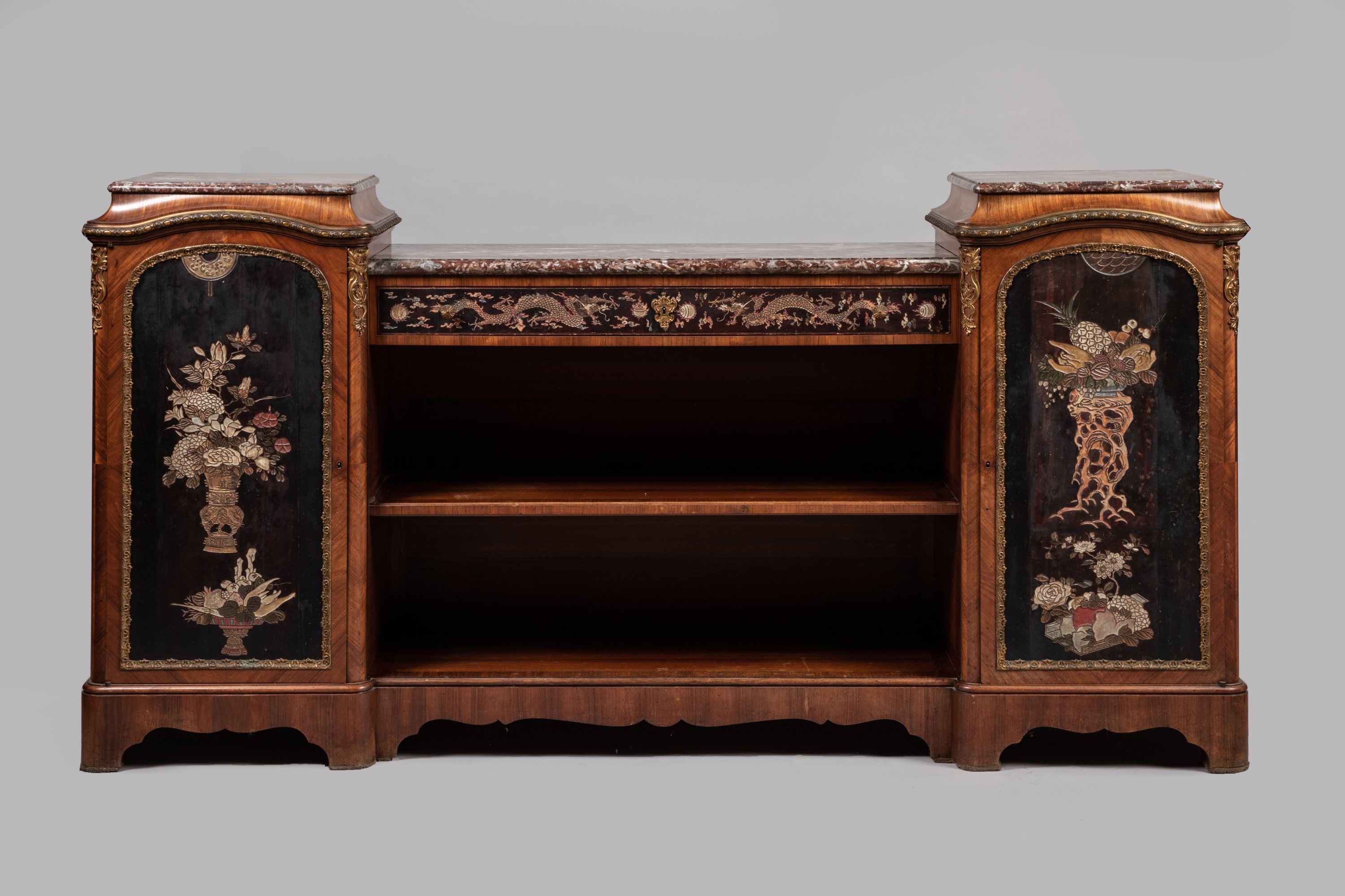 en bois de placage dont bois de violette et palissandre, le meuble est flanqué de deux gaines latérales ouvrant par une porte. La partie centrale en léger retrait présente un tiroir en ceinture et deux étagères. Le tiroir et les deux portes sont ornés de panneaux à la façon des laques de Coromandel. Deux dragons affrontés chassent la perle sacrée sur le tiroir, tandis que les portes présentent un vase à l'antique fleuri ou une corbeille de fruit.