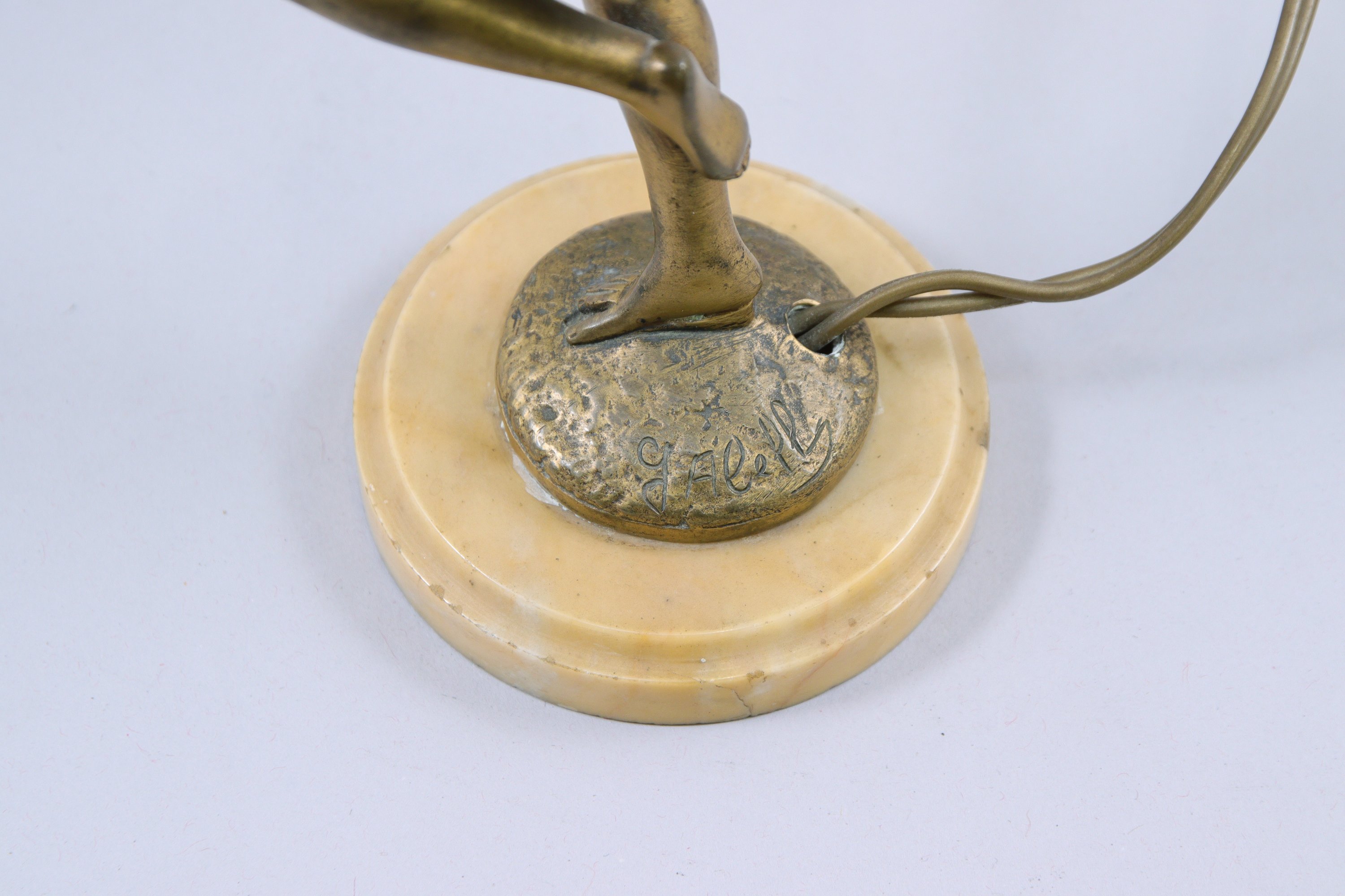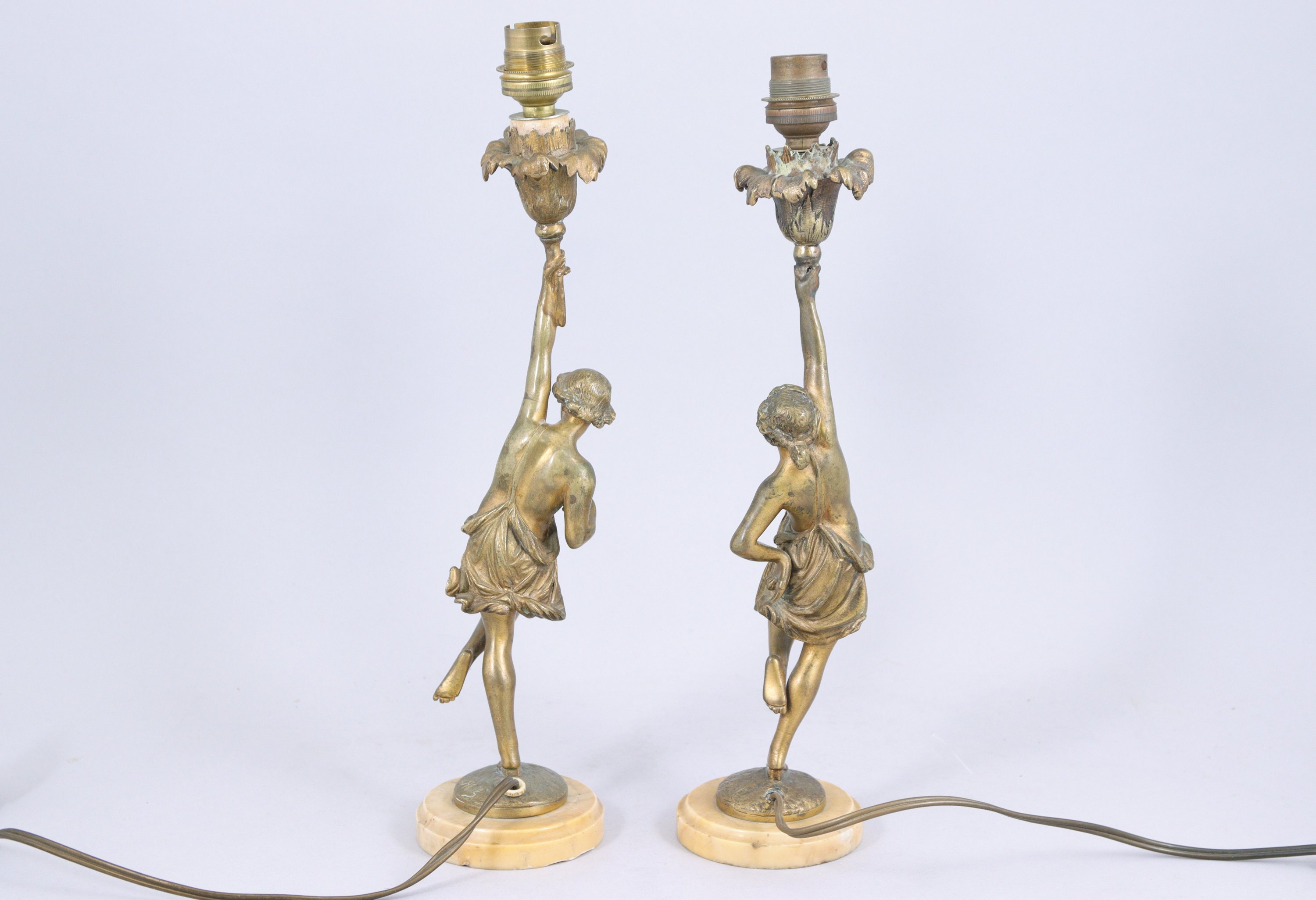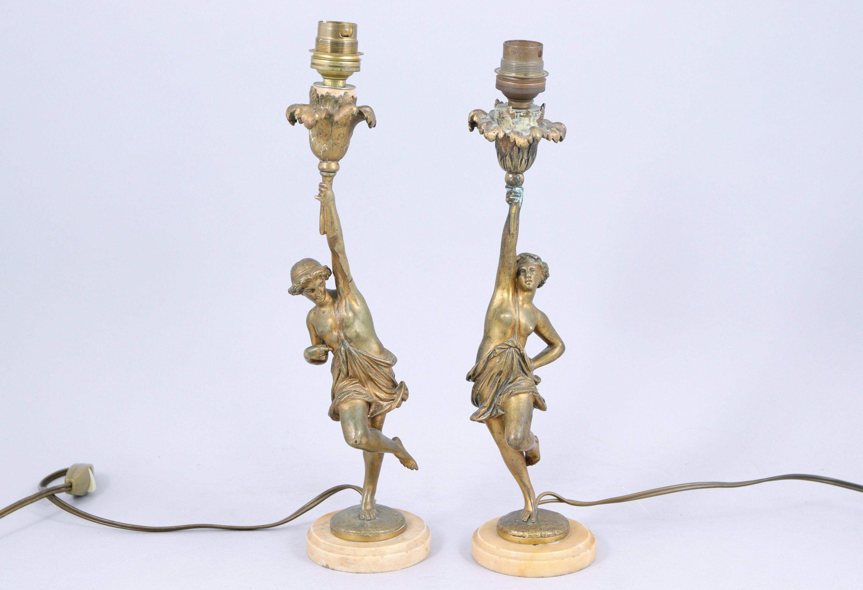 PAIRE DE BOUGEOIRS transformés en PAIRE DE LAMPES figurant un couple à l'Antique.