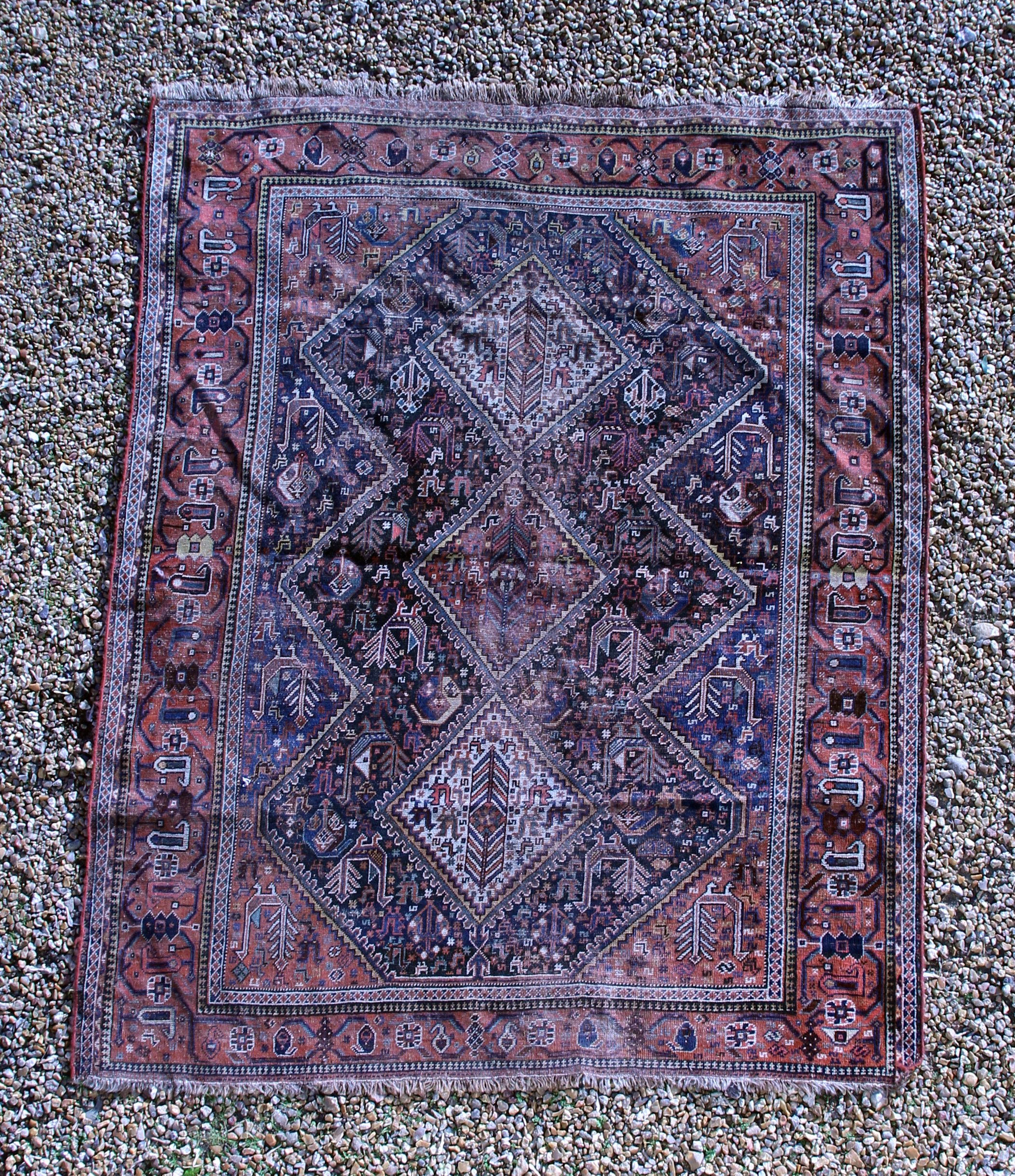 SHIRAZ. TAPIS en laine à fond bleu chargé de fleurs et animaux