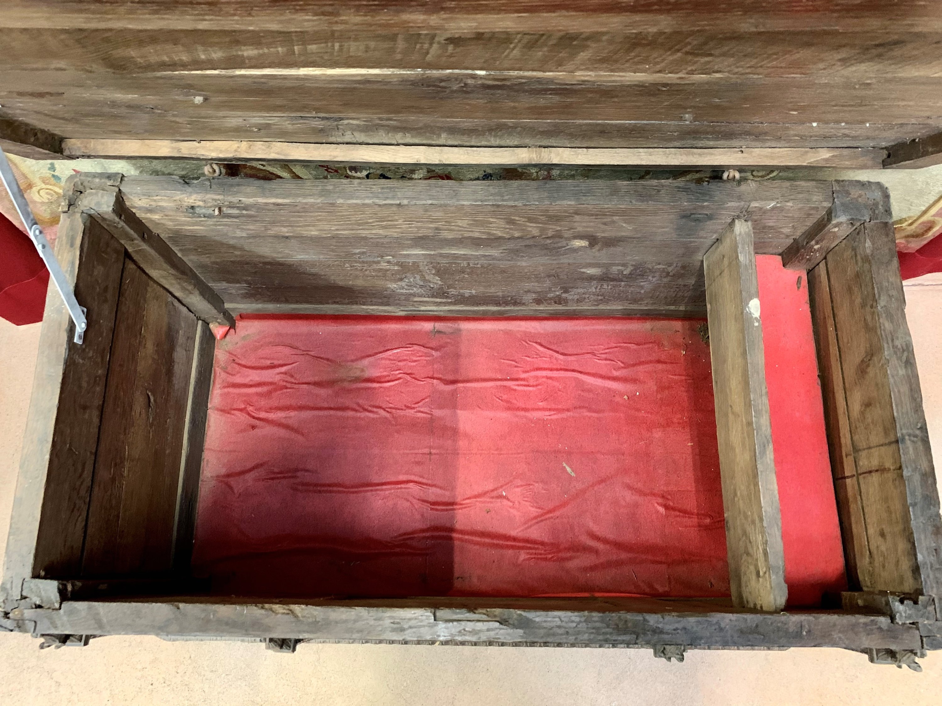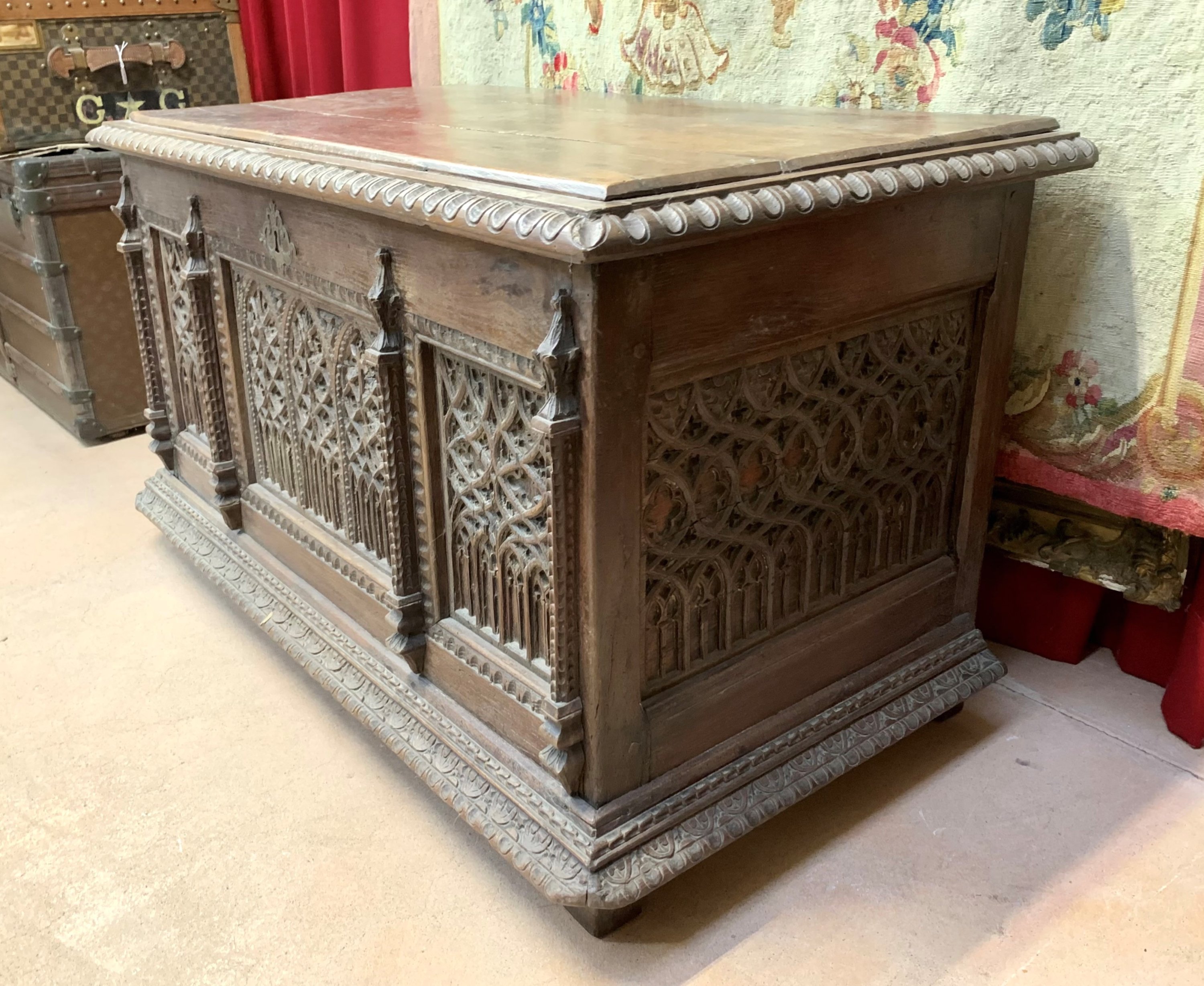COFFRE en chêne, la façade et les côtés sculptés de décors à orbevoie.