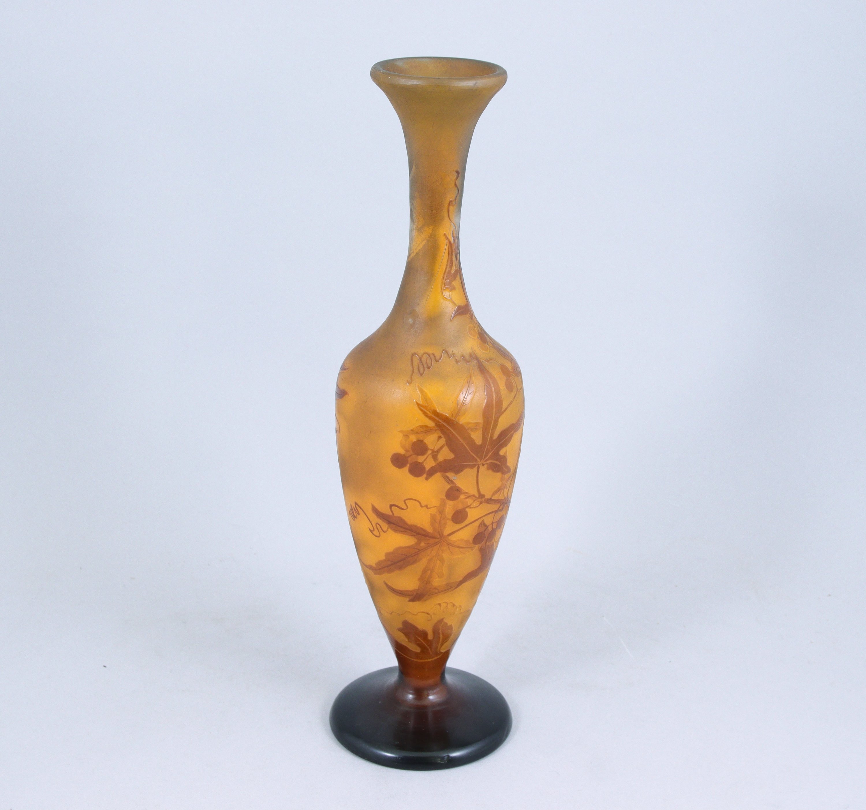 en verre multicolore, gravé à l'acide. Décor d'érable du Japon (?) mauve sur fond orangé.