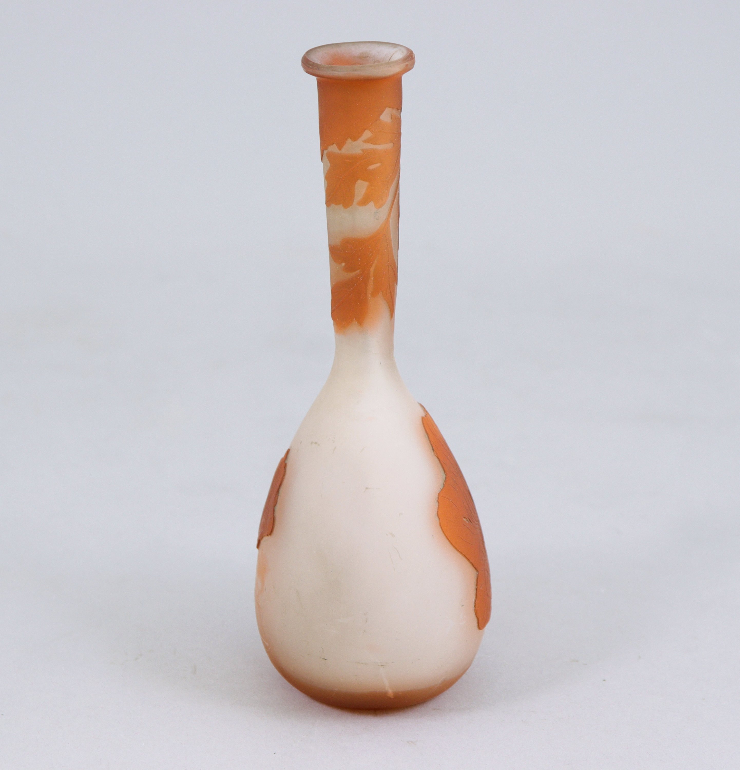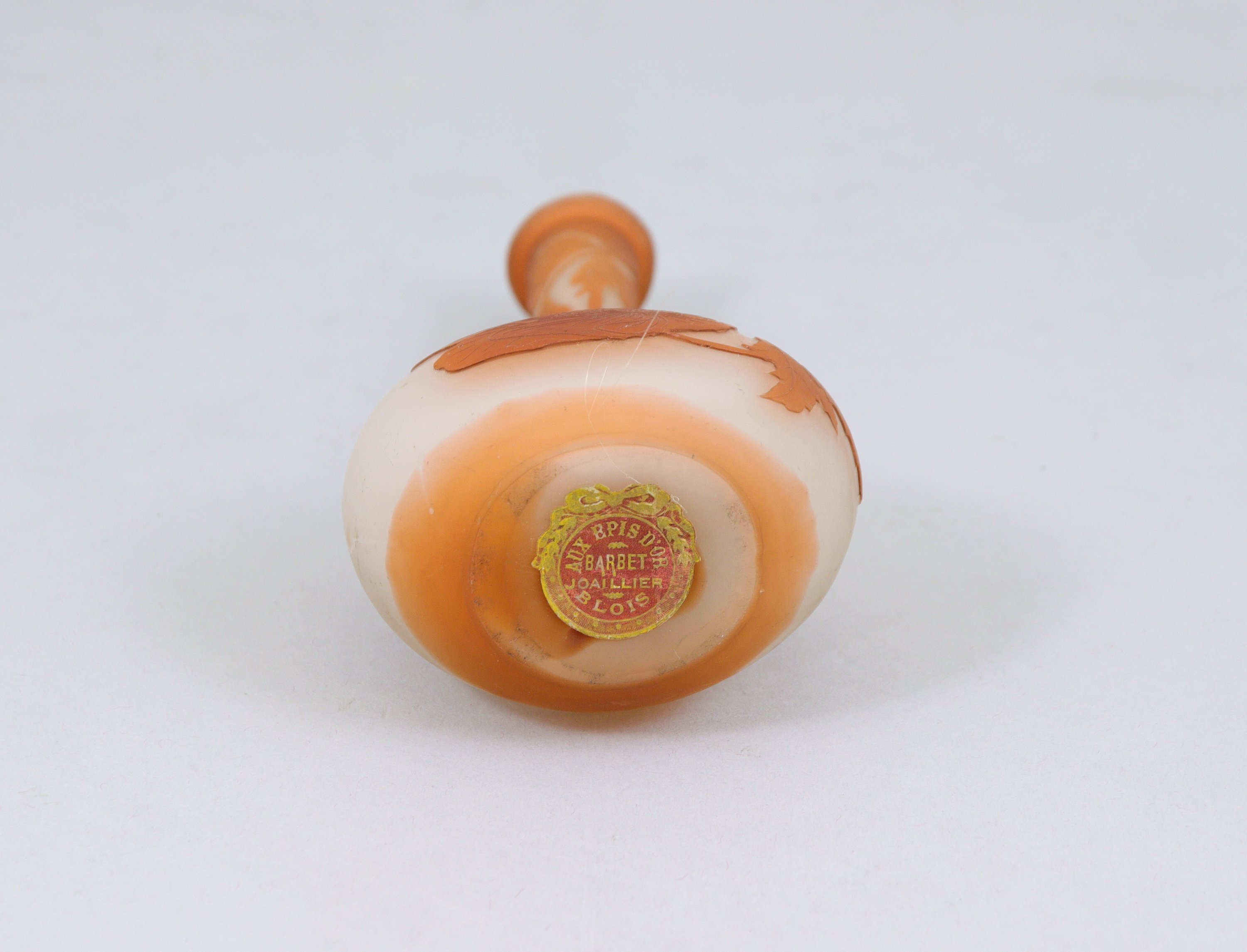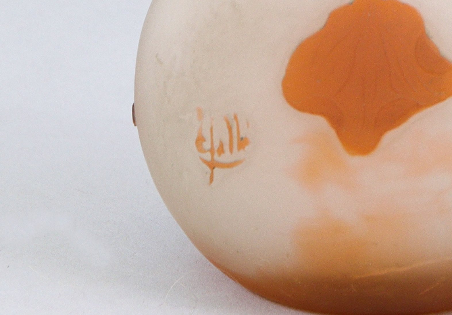 en verre multicolore, gravé à l'acide. Décor de fleur de pavot (?) orangé sur fond clair. Signé.
