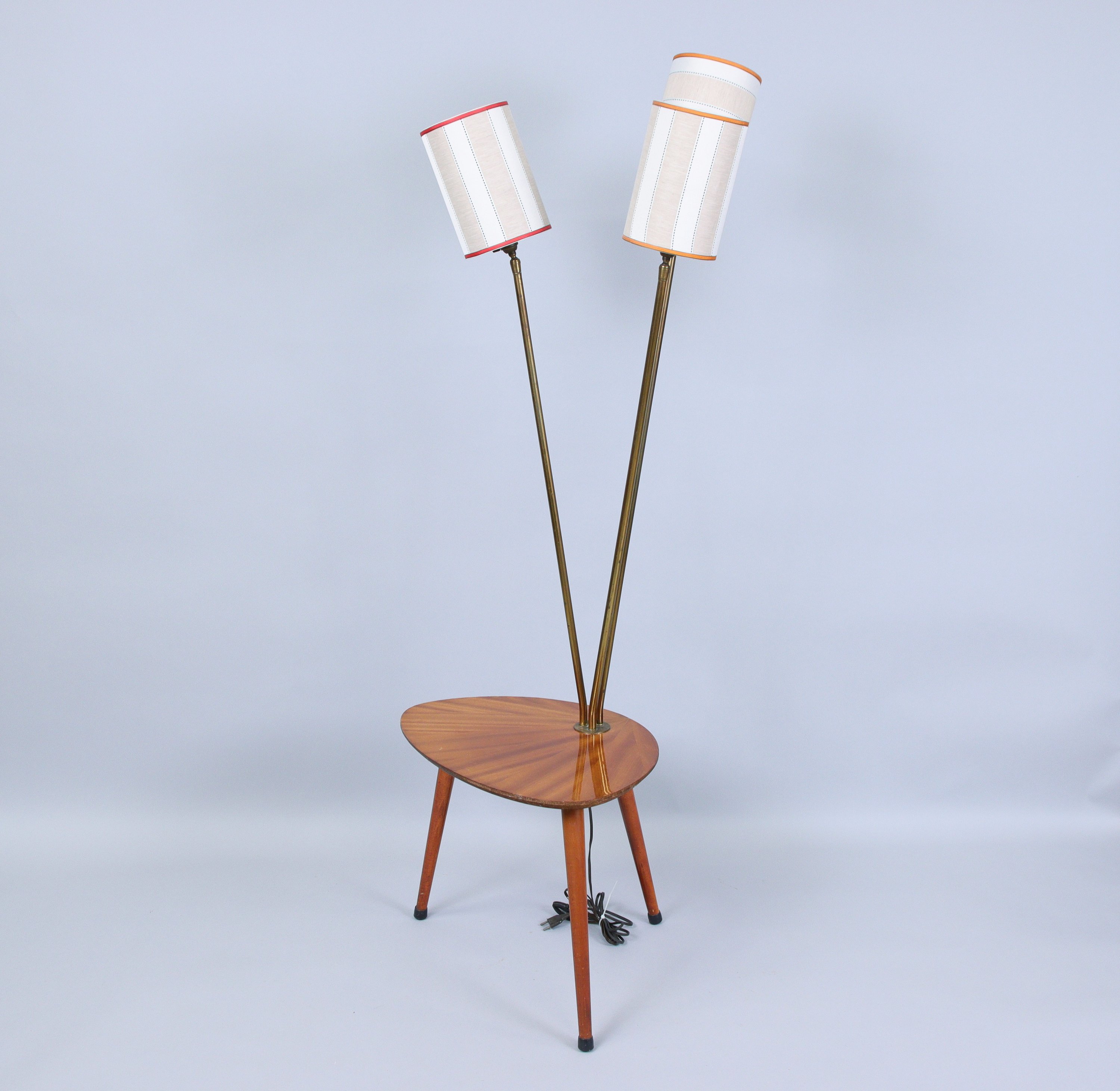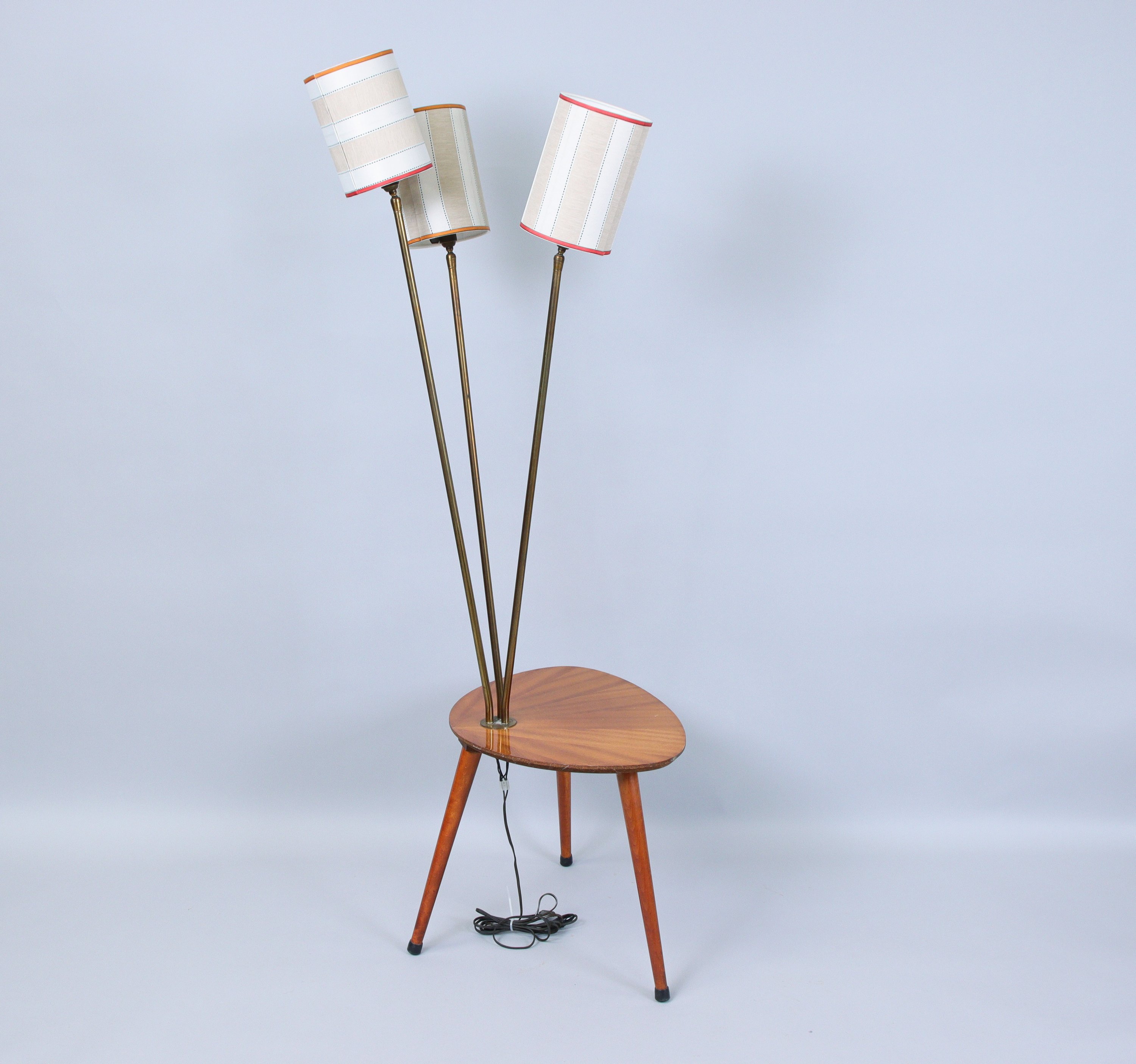 en teck et placage de teck à piétement tripode, électrifiée dans le goût de René MATHIEU par un lampadaire en laiton doré à trois branches.