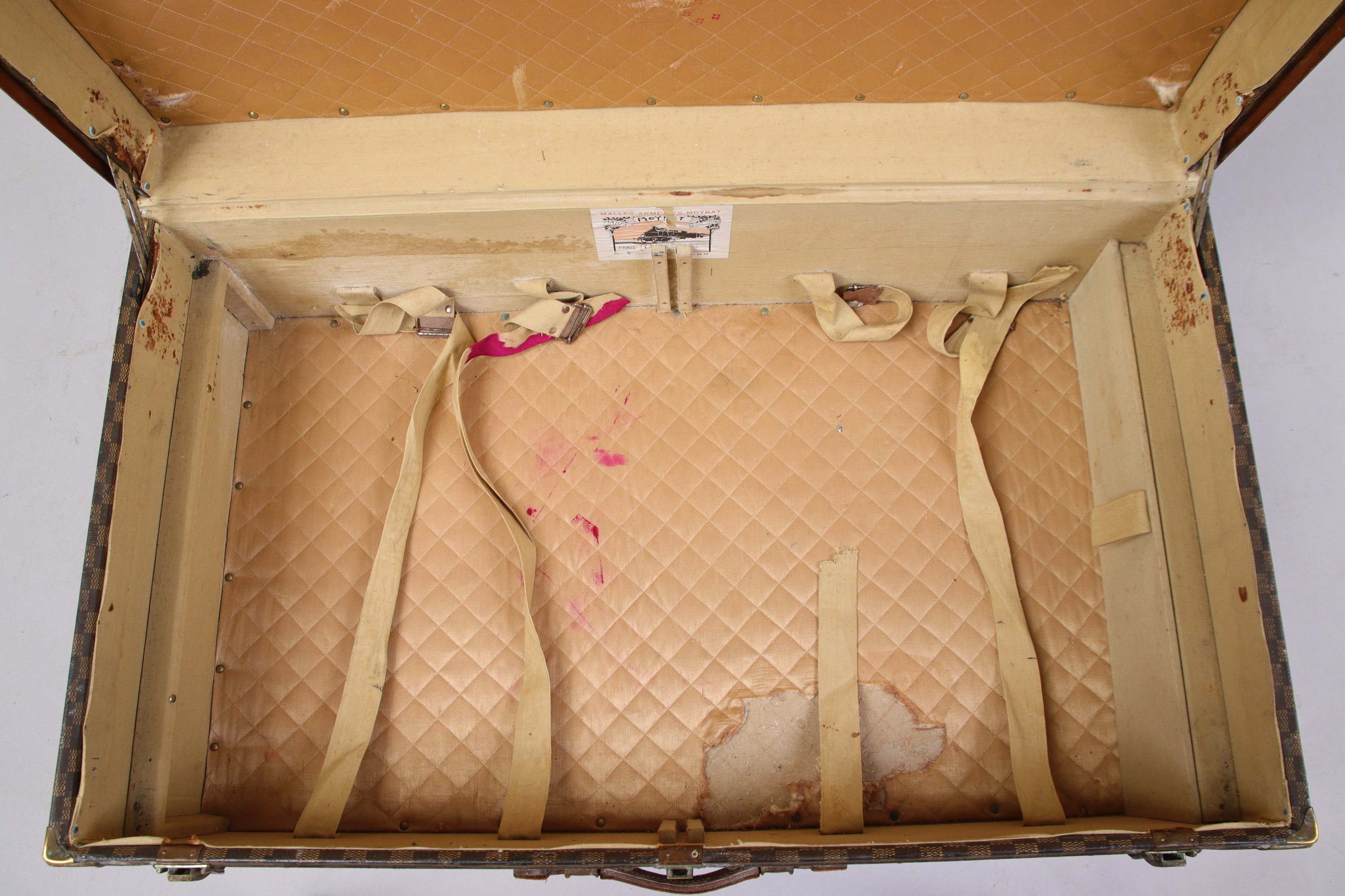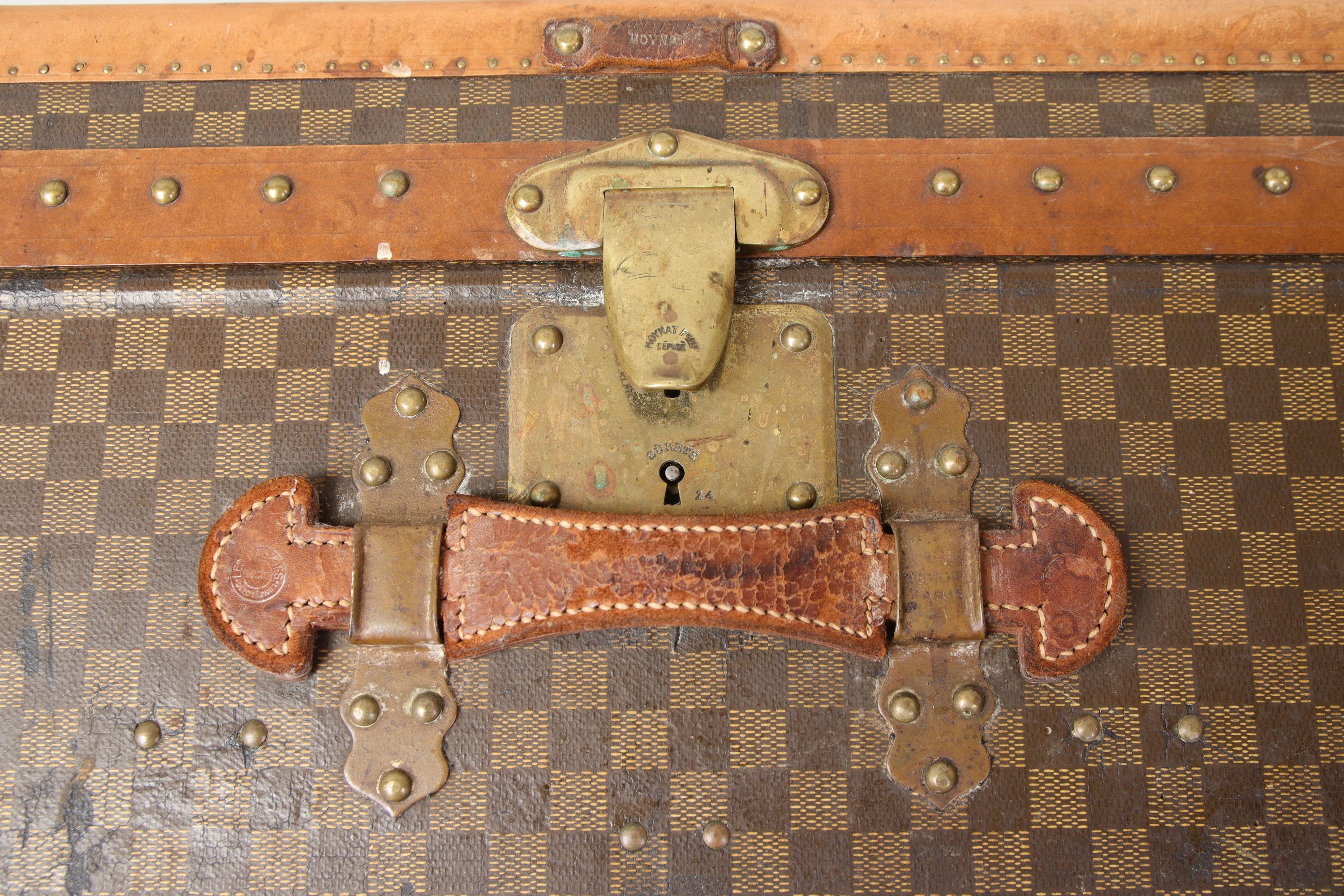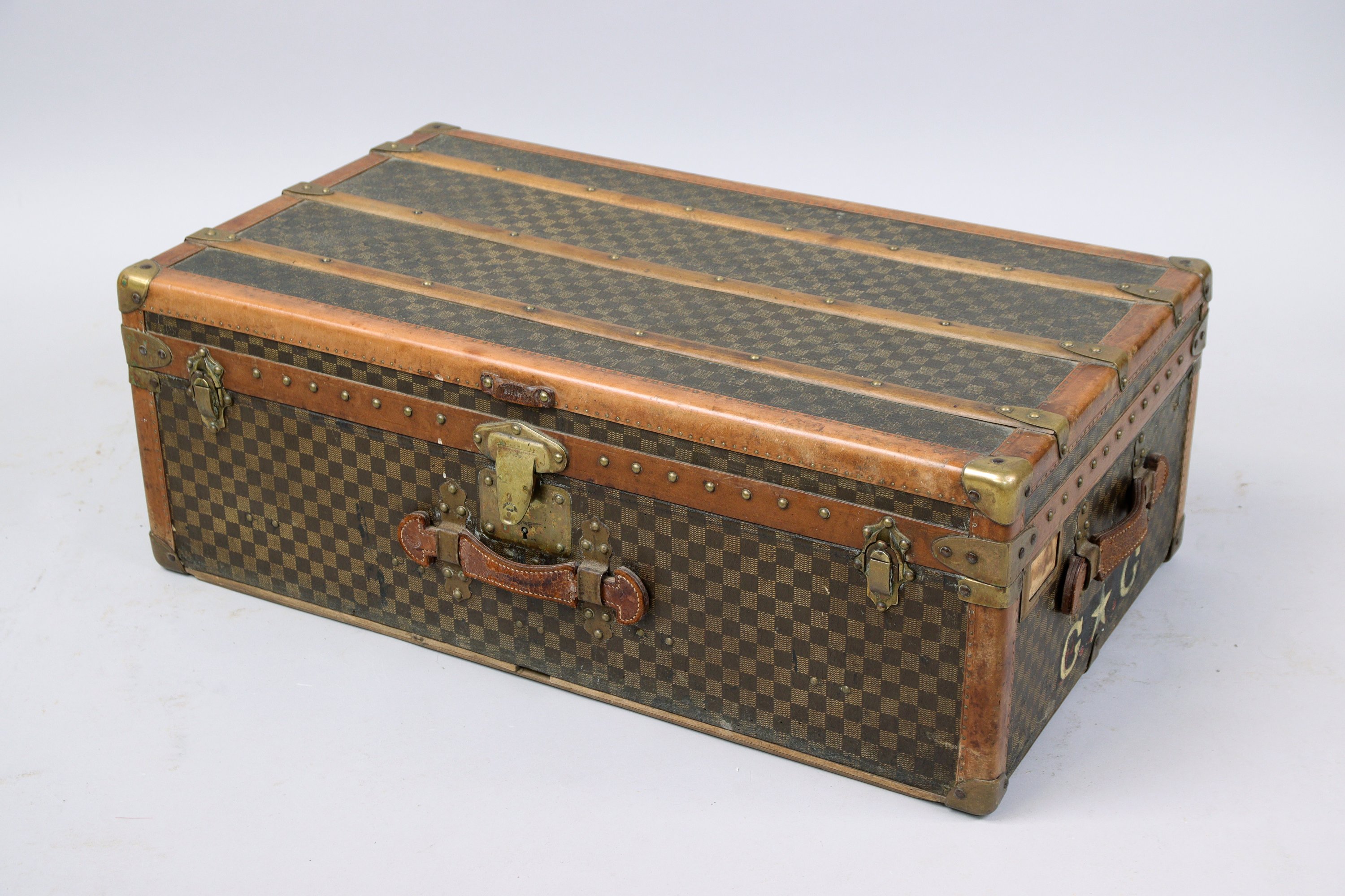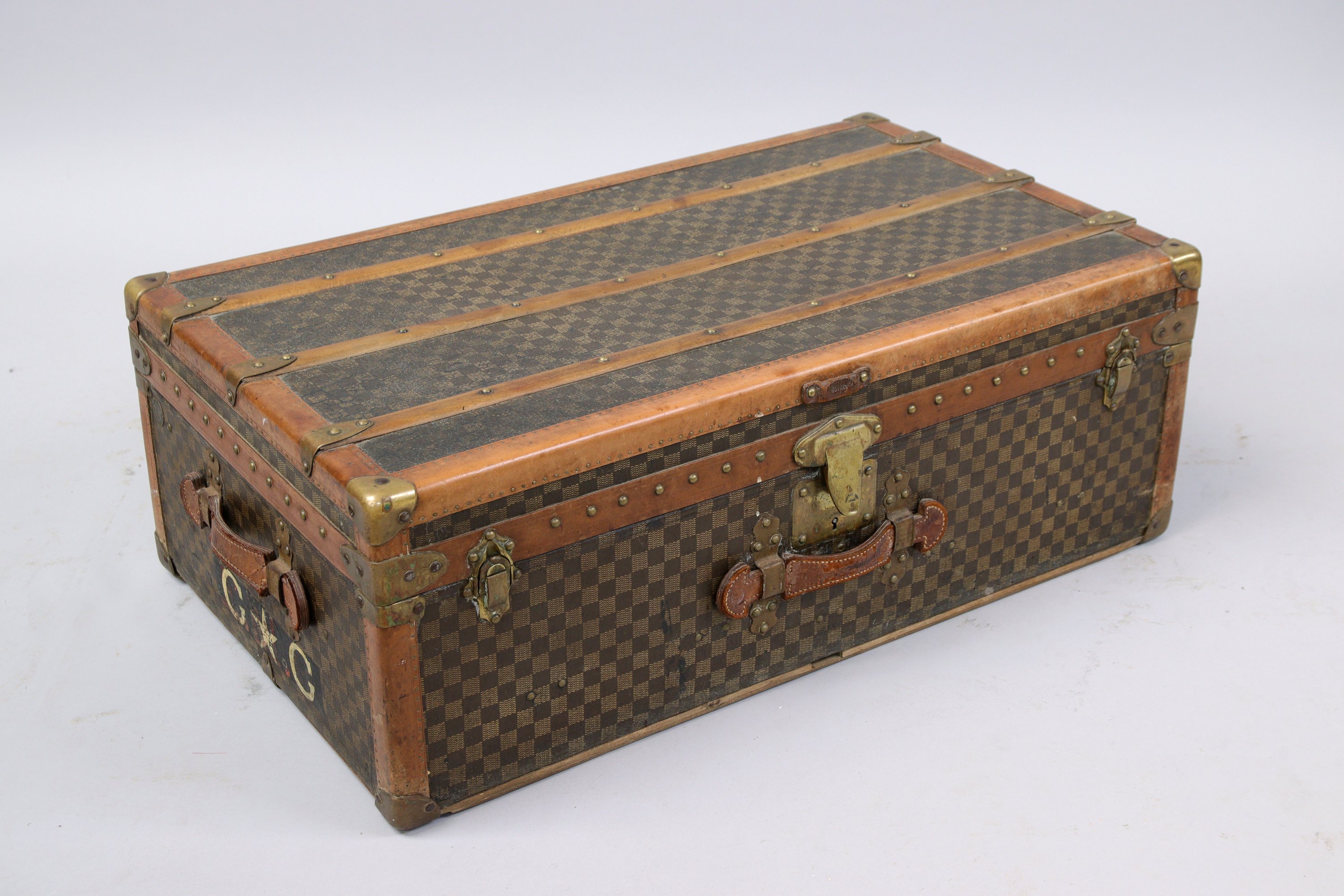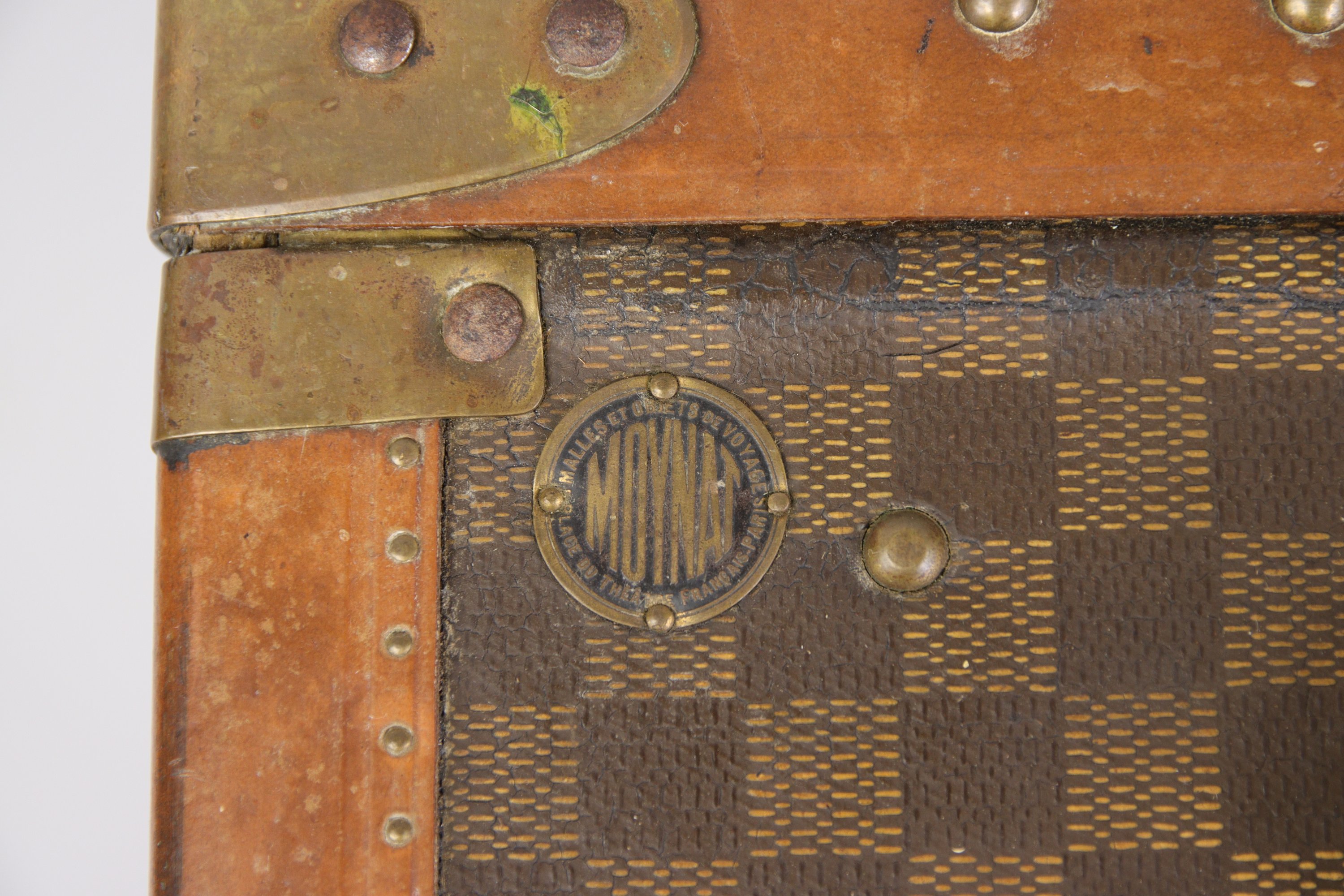 MOYNAT. MALLE DE VOYAGE en toile au damier et renforts en hêtre.