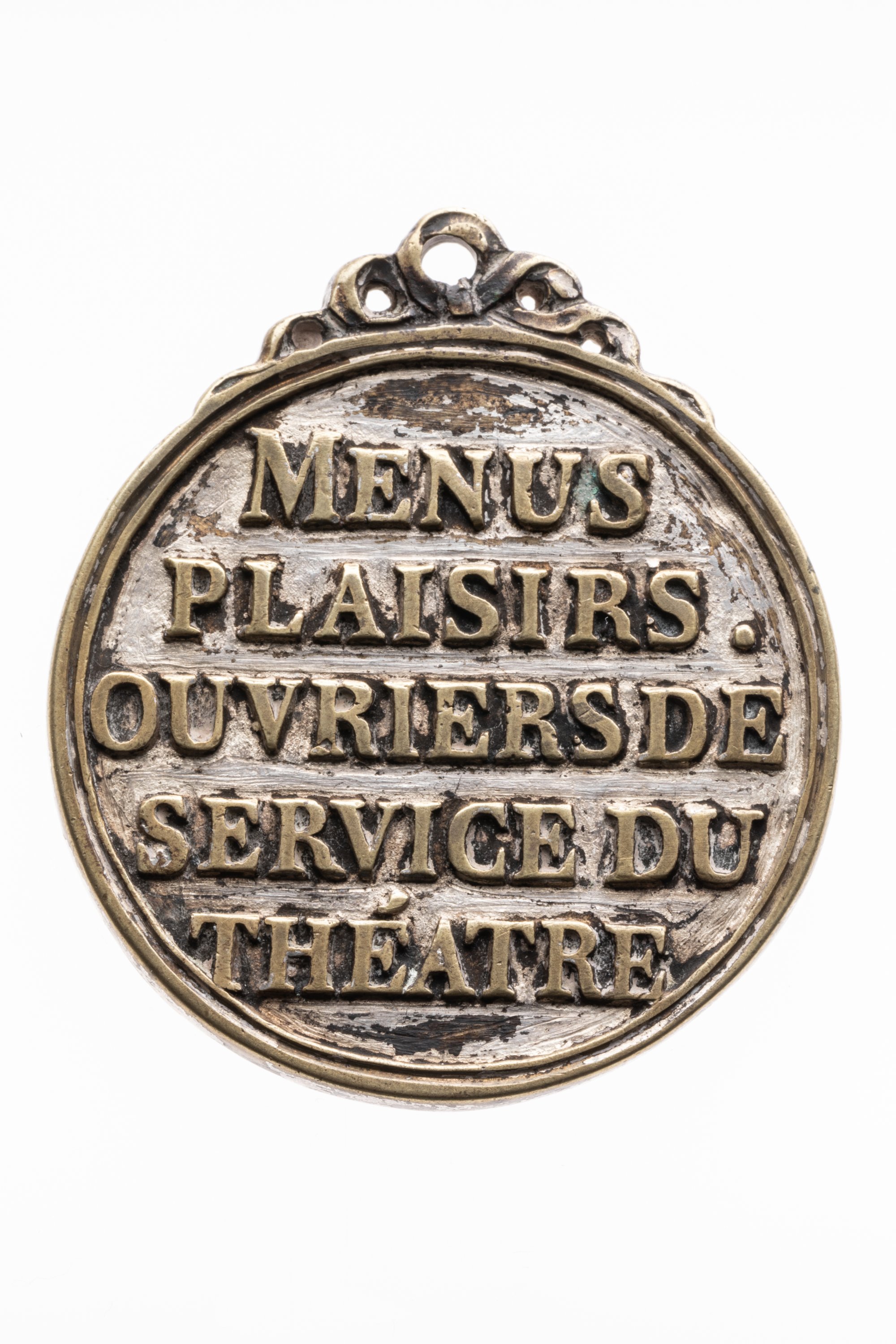 Laissez-passer en laiton argenté pour l'un des ouvriers travaillant sur le chantier du Théâtre Royal de Versailles en prévision du mariage en 1773 de Charles Philippe, comte d'Artois, dernier petit-fils de Louis XV, frère de Louis XVI et de Louis XVIII, futur Charles X, avec Marie Thérèse, princesse de Savoie.