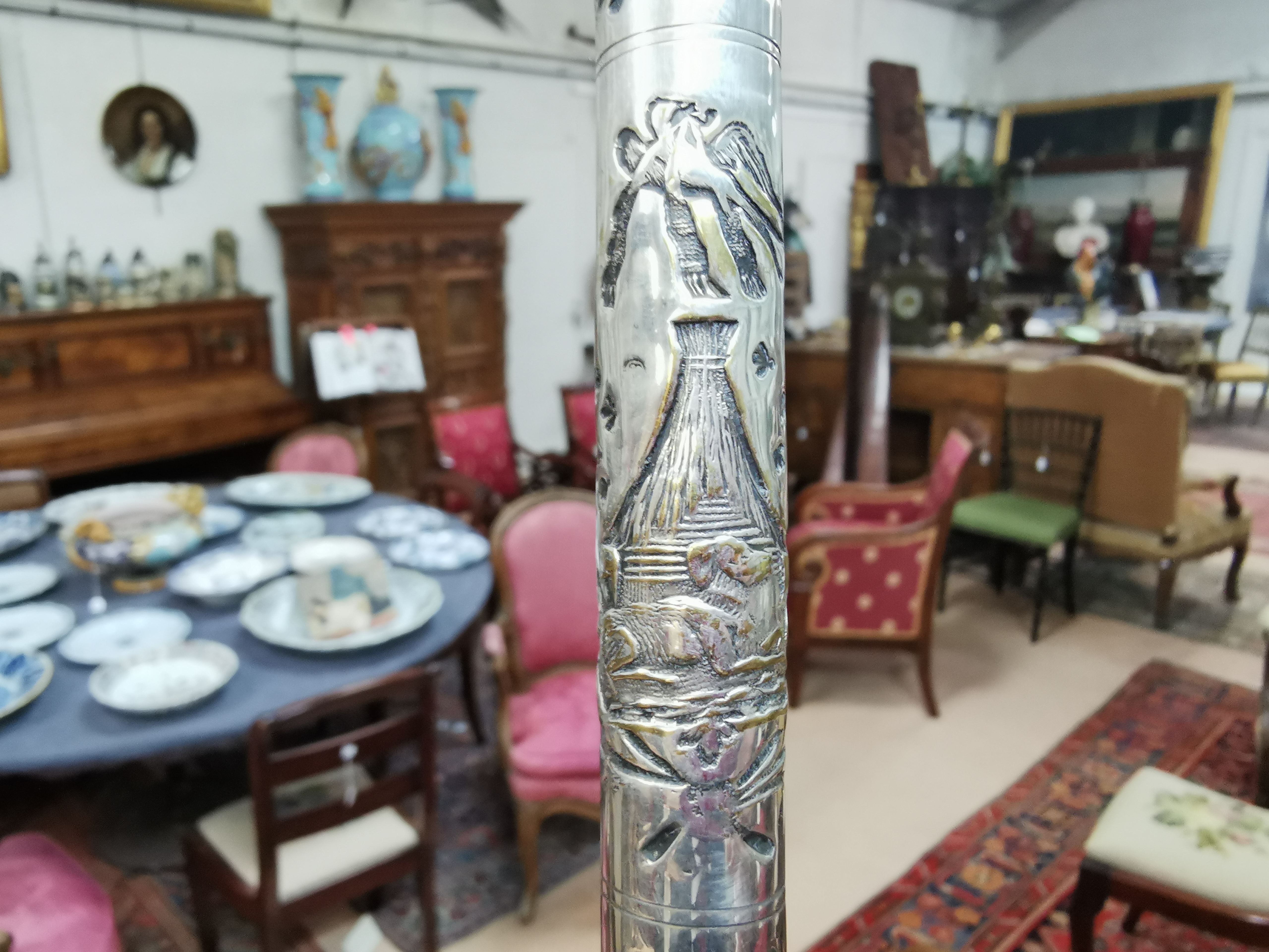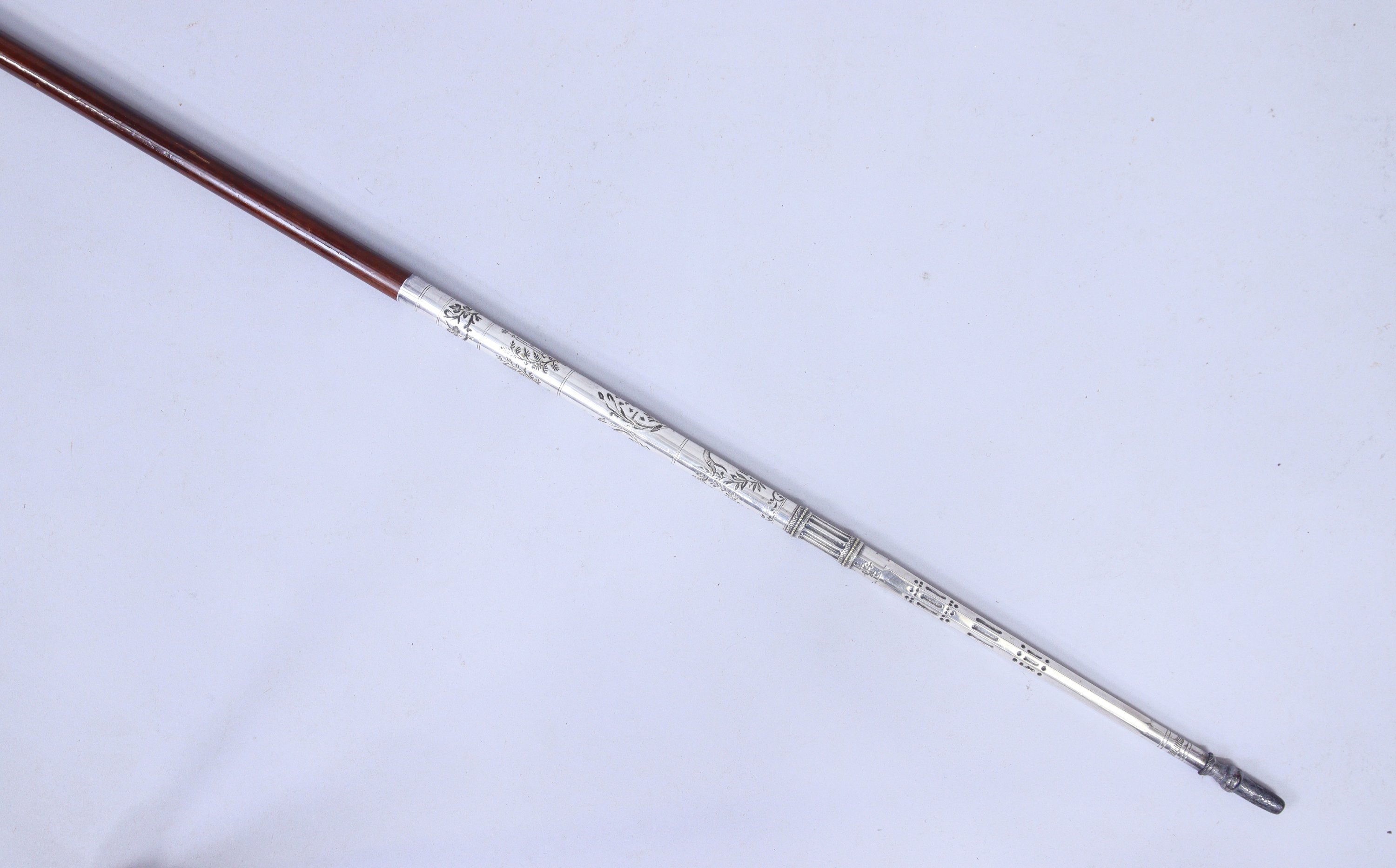 L'extrémité en bronze et métal argenté, gravée de signes compagnonniques, est située et datée "Lyon 1901 déposé". La férule est dévissable.