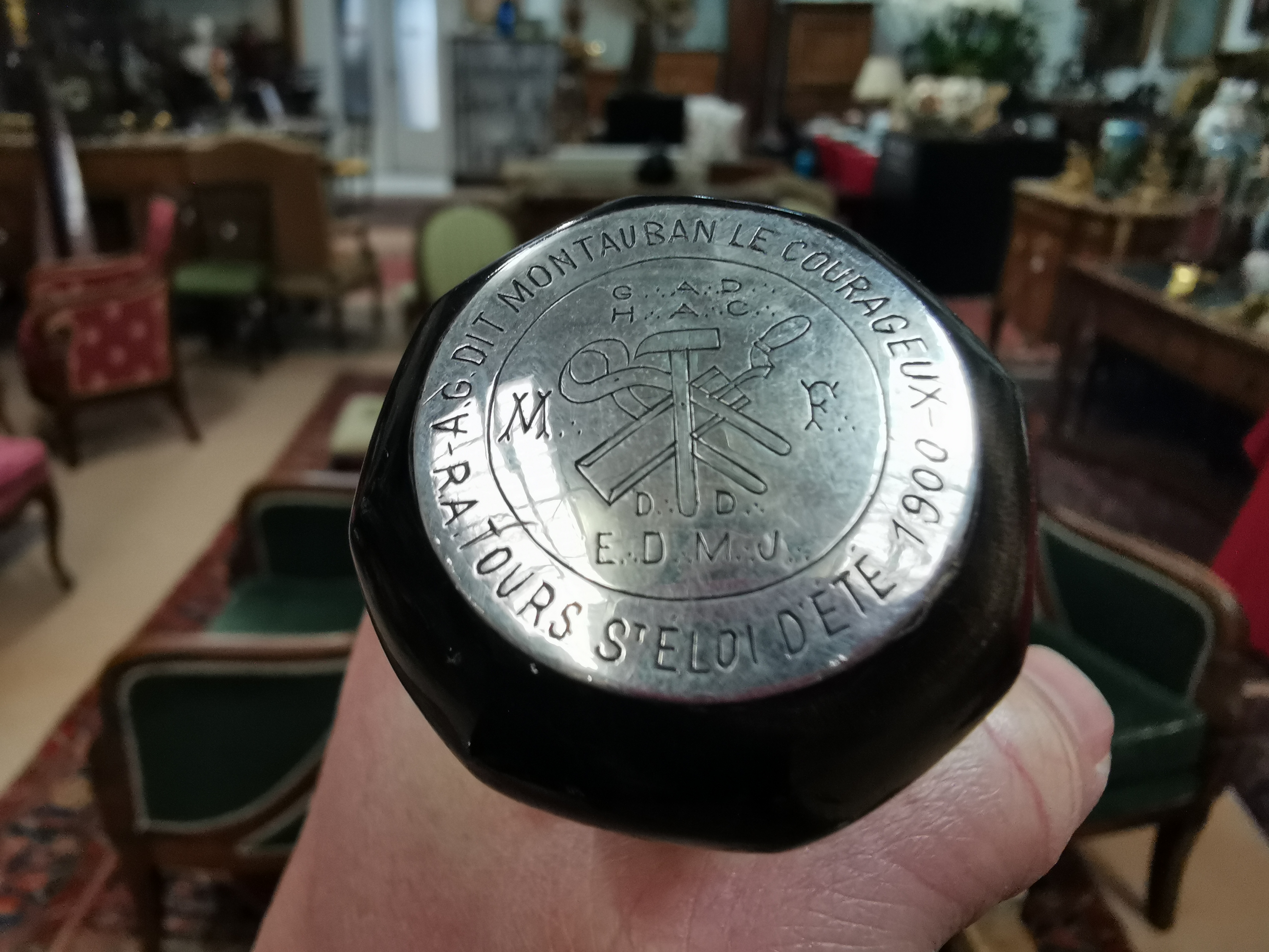 Le pommeau en corne est gravé de motifs géométriques. Sur le sommet, une pastille métallique est gravée "A.G dit Montauban le Courageux, RA Tours St Éloi d'été 1900" et au centre "G. A.D H. A.C MF DD E.D.M.J".