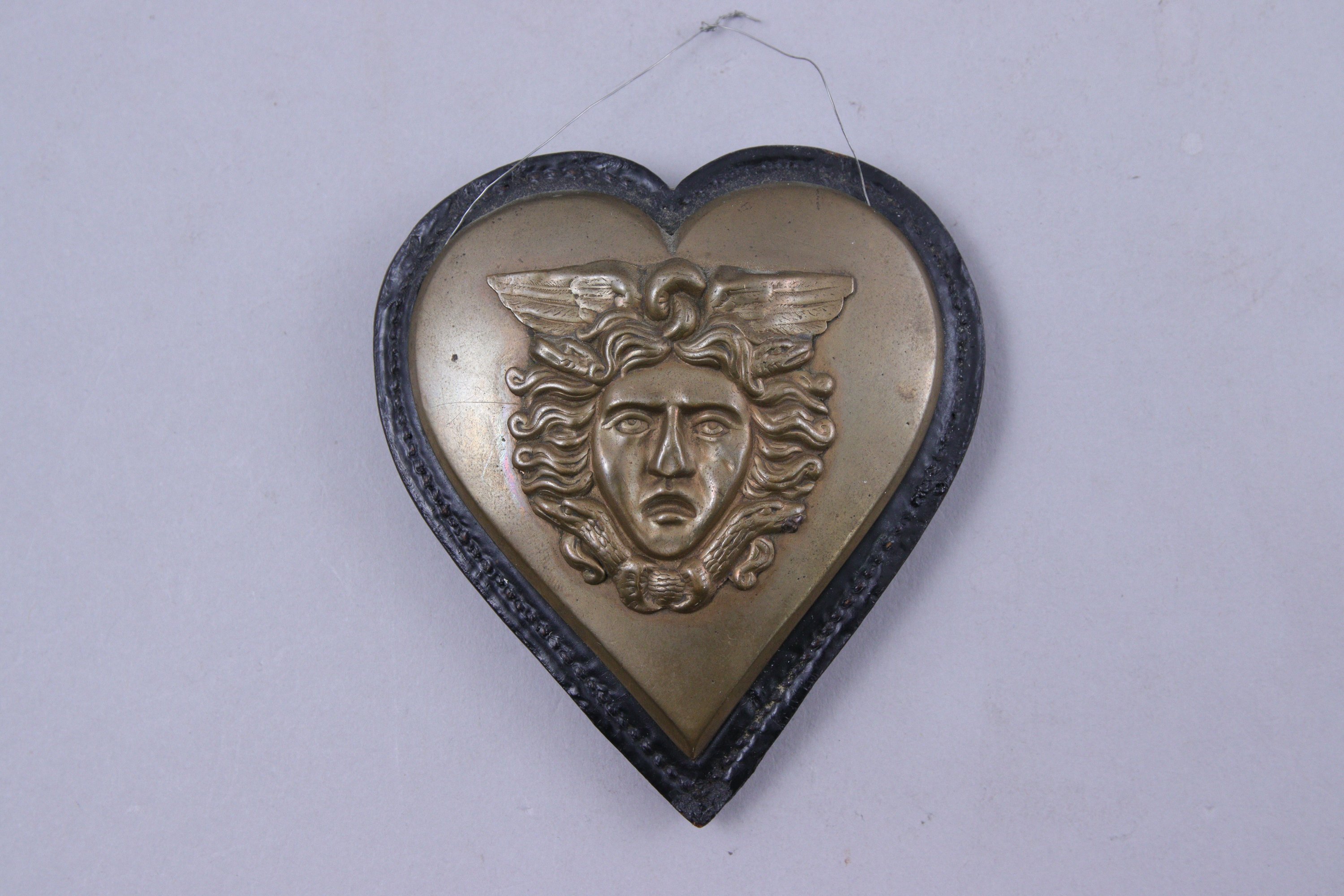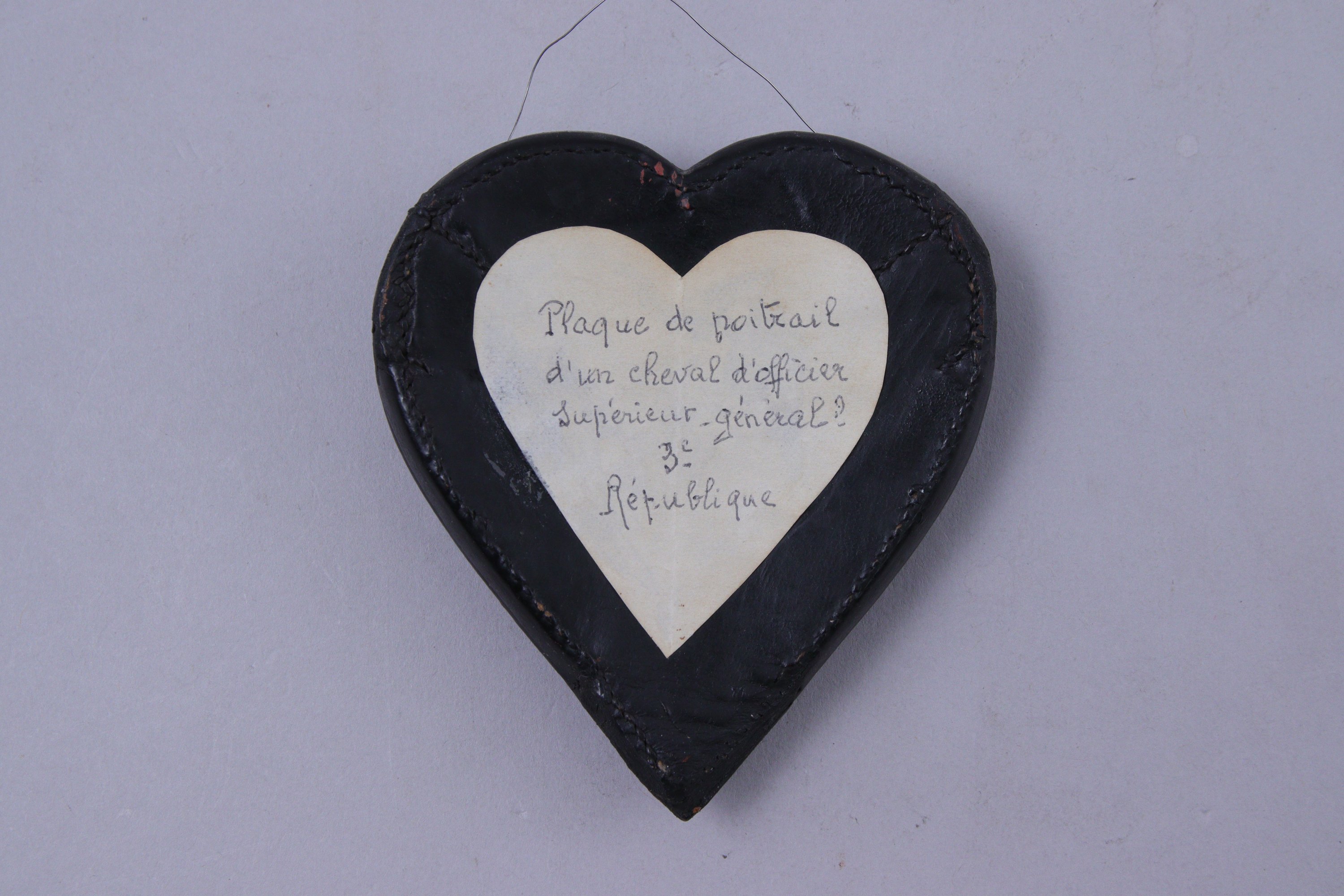 JOINT : PLAQUE de POITRAIL en cuivre d'officier général en forme de cœur et à la tête de Méduse. Modèle 1830. Au revers avec inscription précisant "plaque de poitrail d'un cheval d'officier supérieur-général. 3e République". Haut. 8 cm.