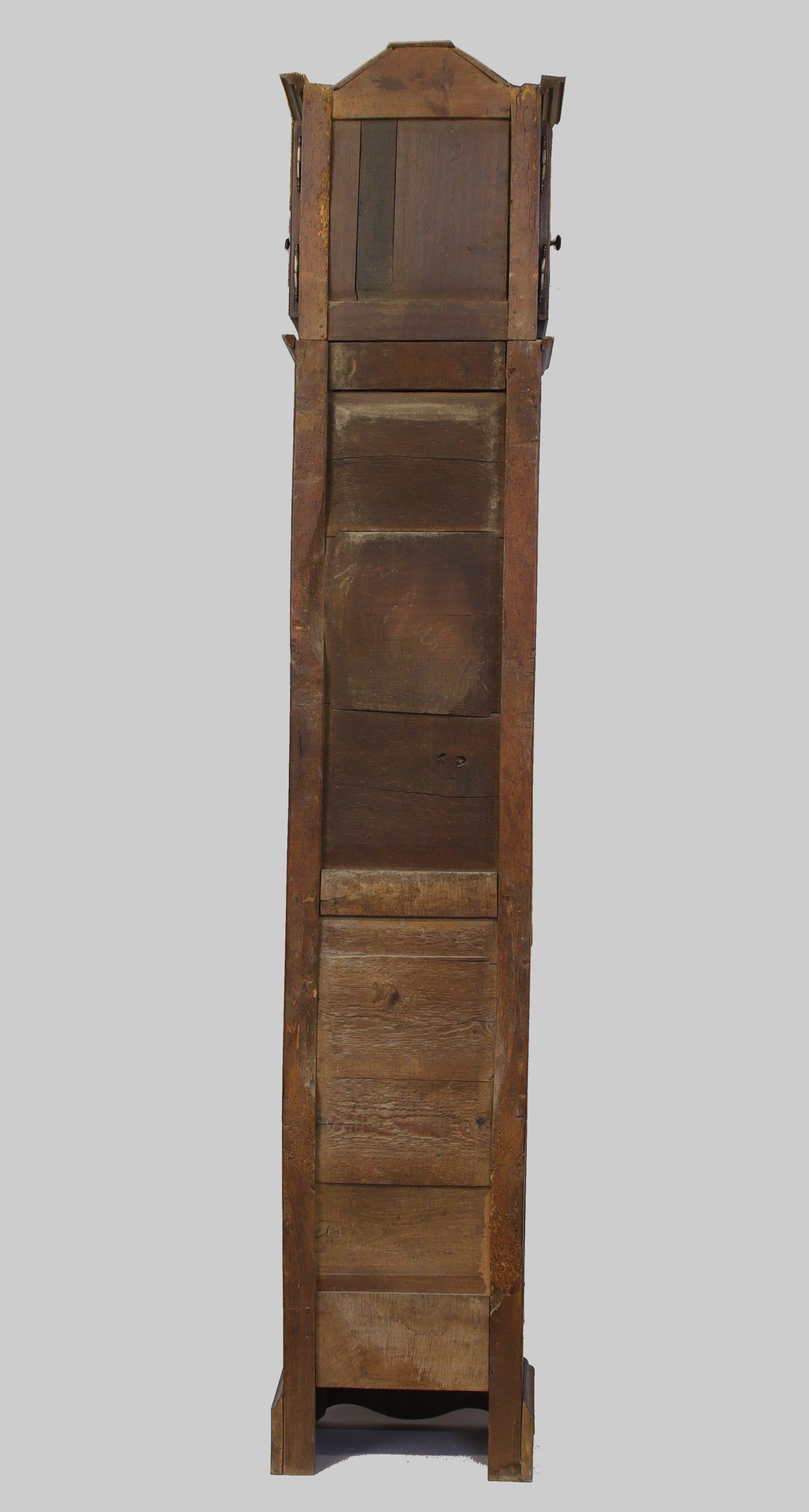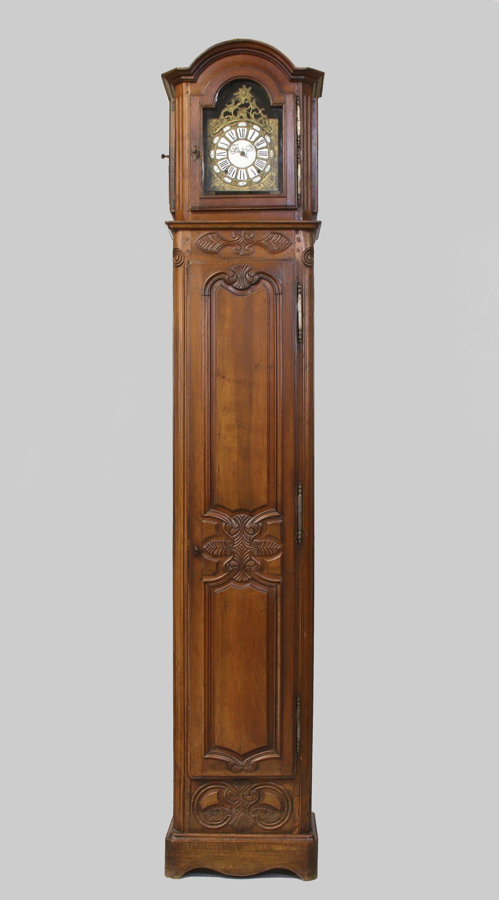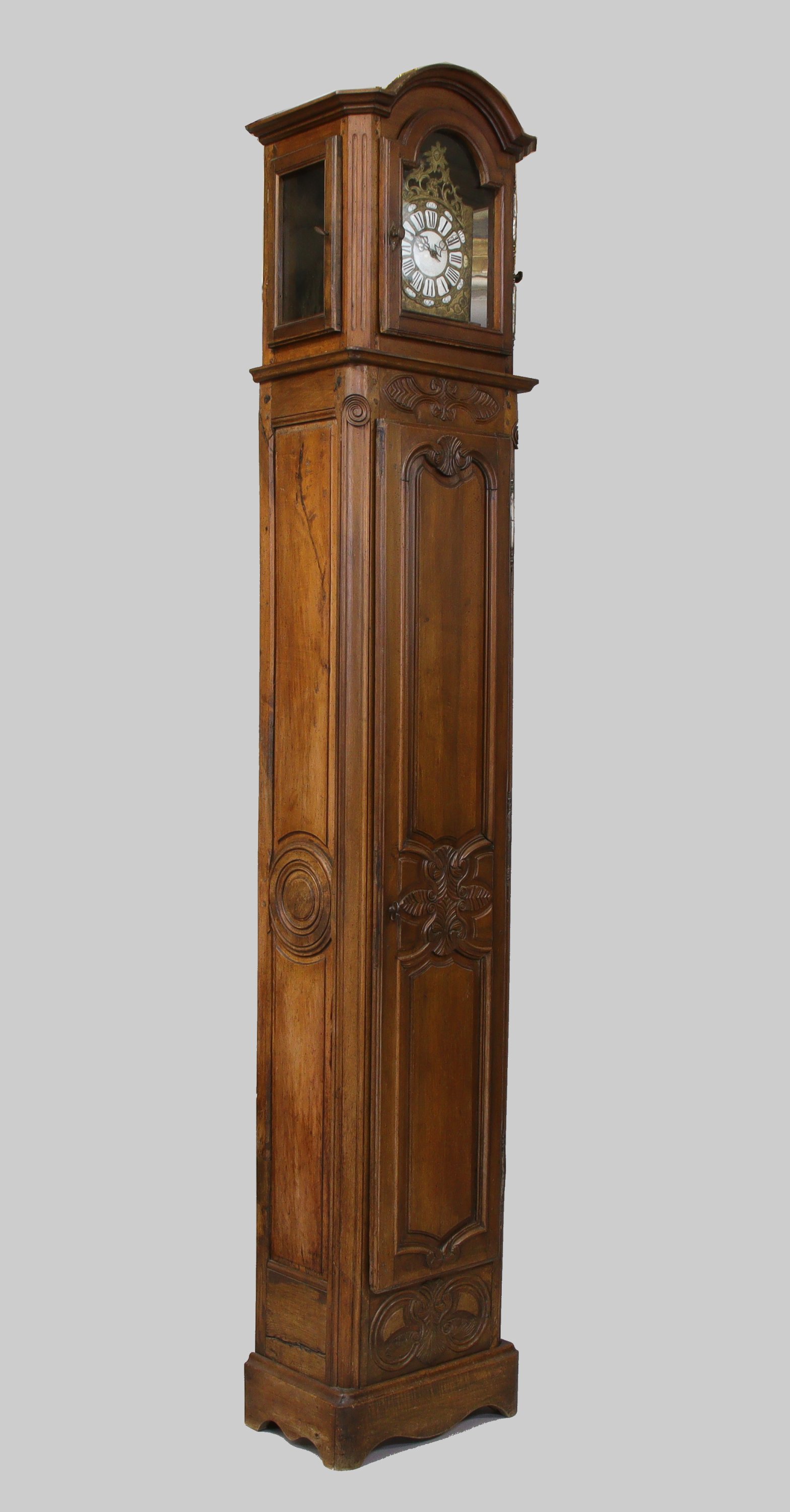 COMTOISE en merisier à décor mouluré de cercles concentriques et sculpté de feuilles à trois reprises. La tête, coiffée d'une corniche cintrée, s'ouvre par trois portes vitrées. La comtoise s'ouvre en façade par une porte fermant à clef. L'ensemble repose sur une base mouvementée. Le mécanisme d'horloger en tôle dorée à motifs de rinceaux et de soleil à face présente des cartouches émaillés figurant les heures en chiffres romains et les minutes en chiffres arabes. Très belles aiguilles ajourées.