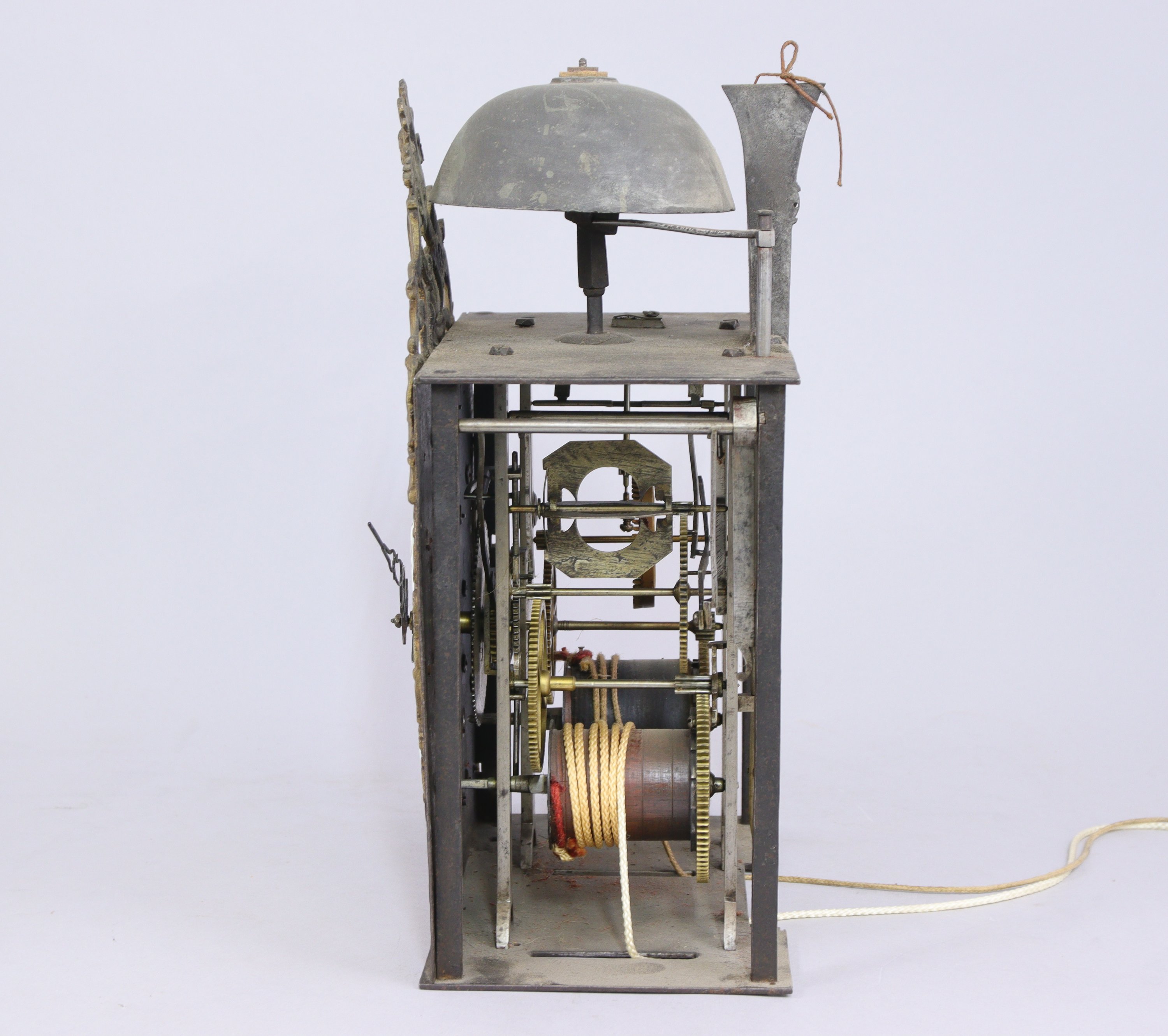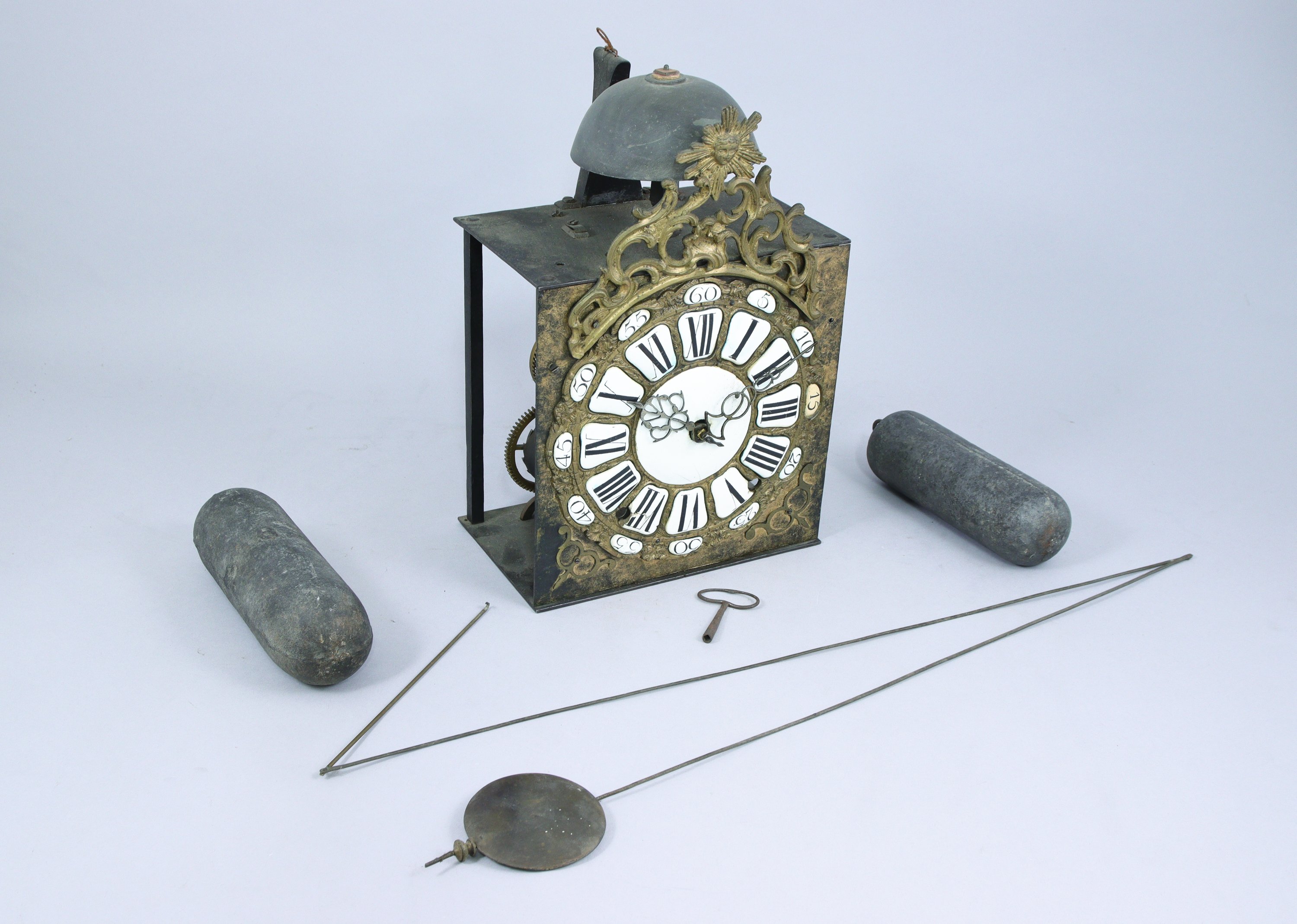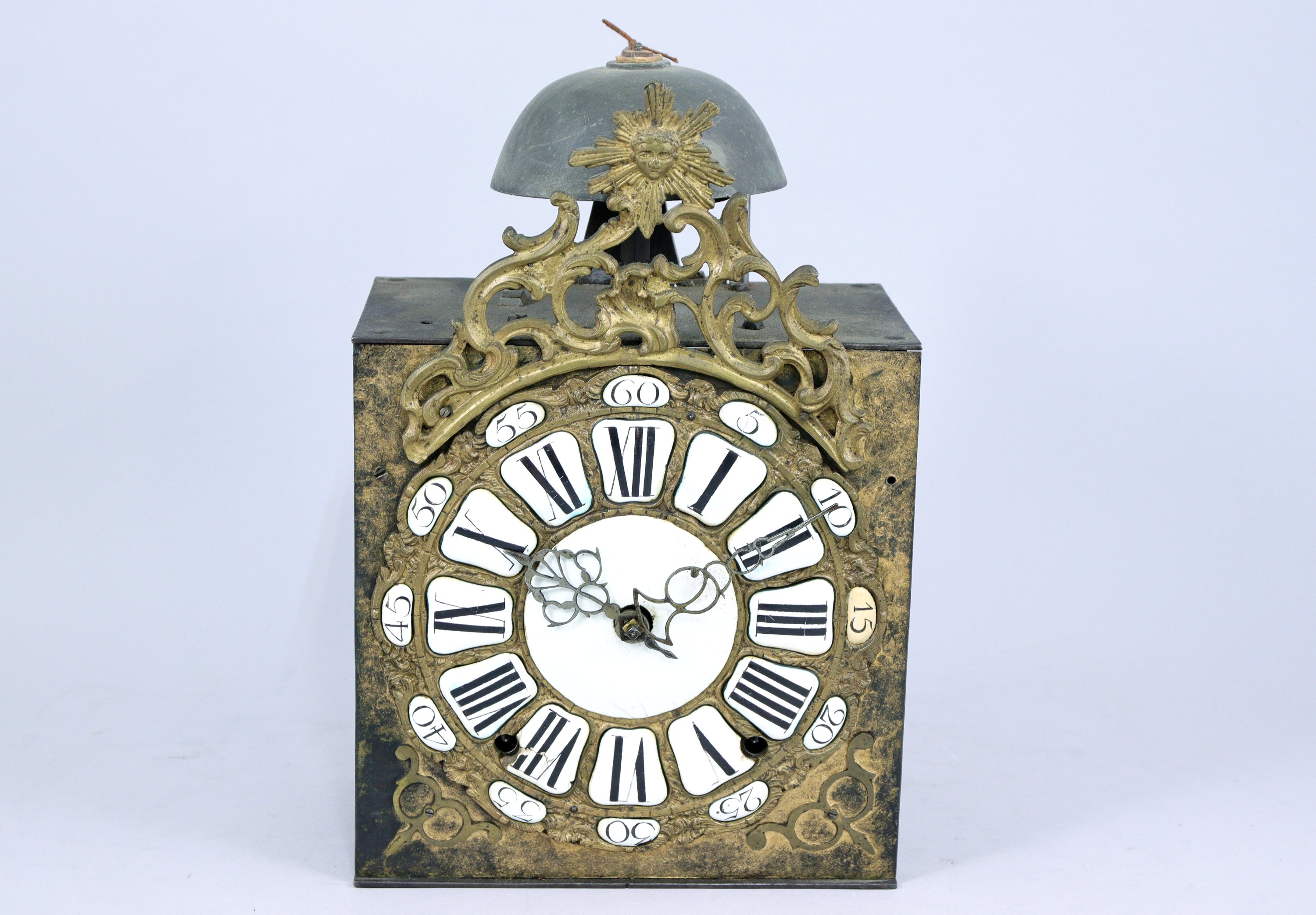 COMTOISE en merisier à décor mouluré de cercles concentriques et sculpté de feuilles à trois reprises. La tête, coiffée d'une corniche cintrée, s'ouvre par trois portes vitrées. La comtoise s'ouvre en façade par une porte fermant à clef. L'ensemble repose sur une base mouvementée. Le mécanisme d'horloger en tôle dorée à motifs de rinceaux et de soleil à face présente des cartouches émaillés figurant les heures en chiffres romains et les minutes en chiffres arabes. Très belles aiguilles ajourées.