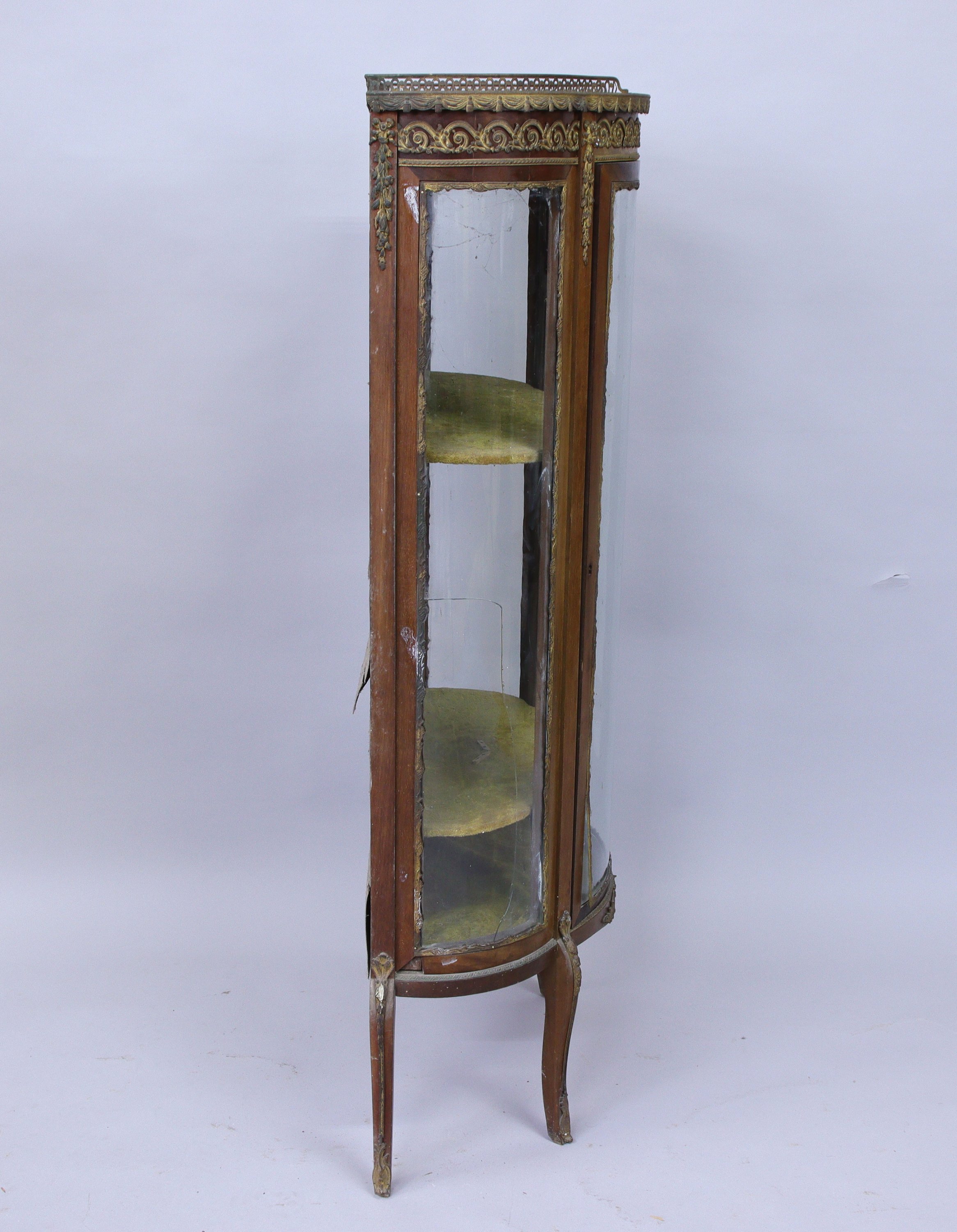VITRINE DEMI-LUNE en placage d'acajou et éléments en bonze. Elle présente une façade galbée en verre divisée à trois parties. La partie centrale s'ouvrant par un ventail. Le piétement est à pieds en gaine.