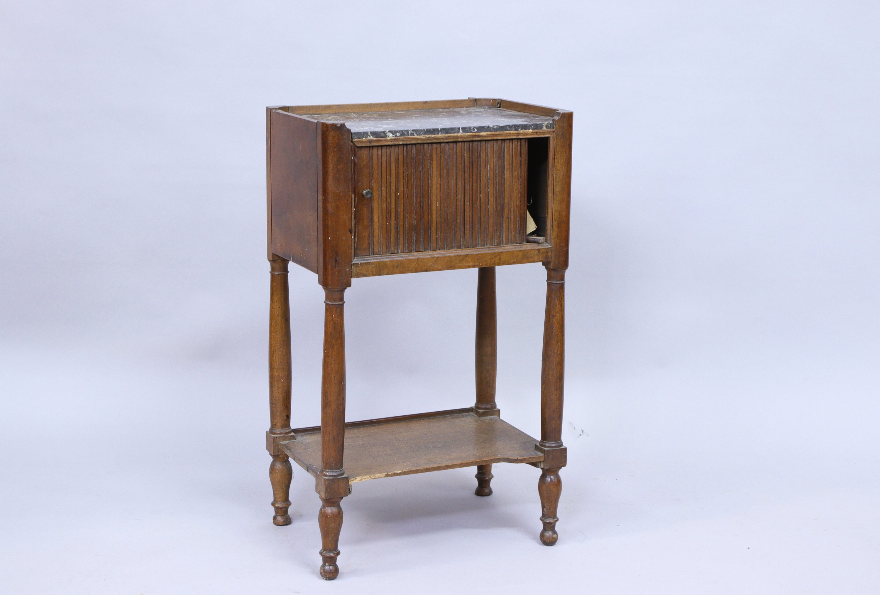 JOINT : CHEVET À RIDEAU en noyer, avec un plateau en marbre gris encastré. Les montants sont renflés sur pieds balustres avec une tablette d'entrejambe. Début XIXe.