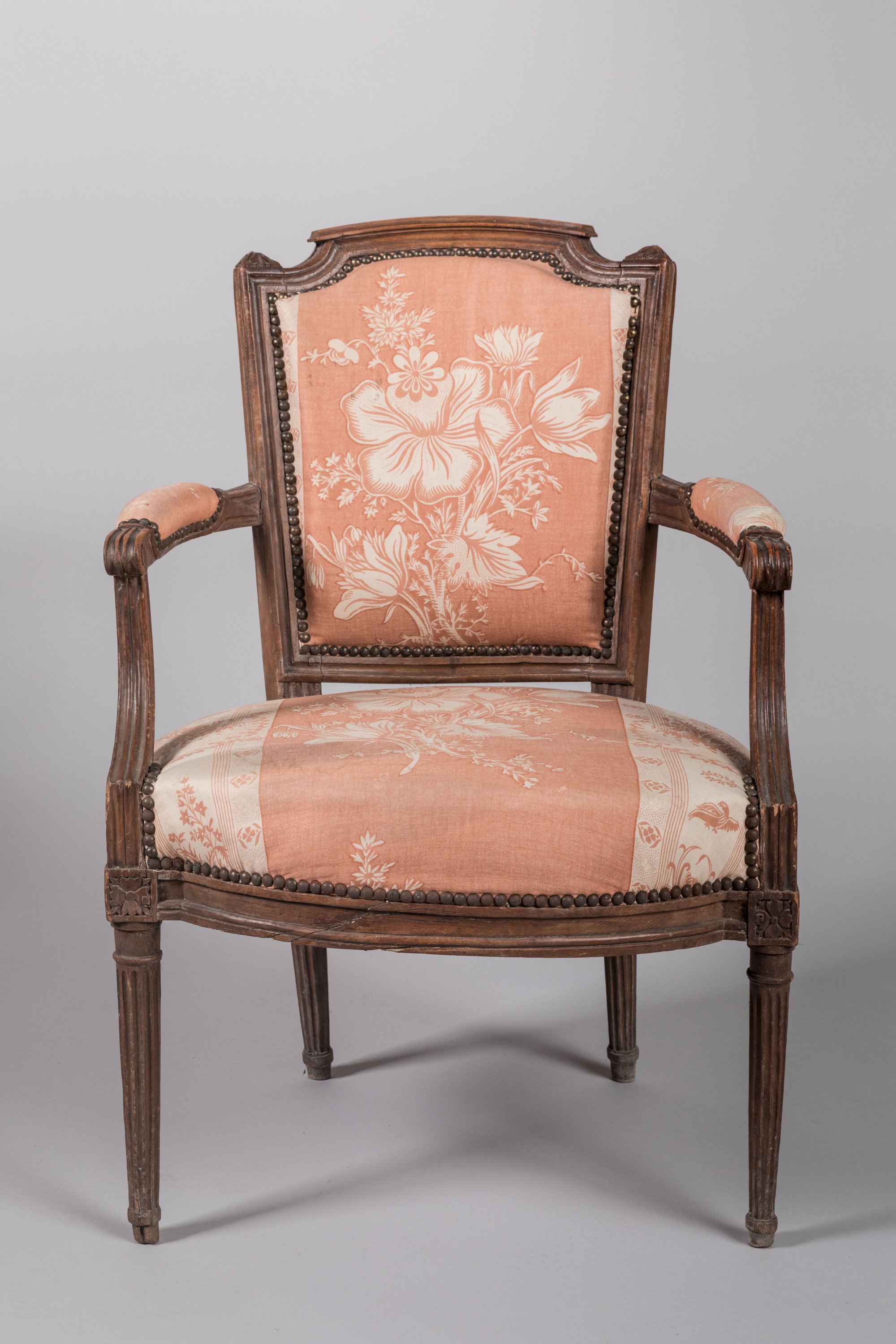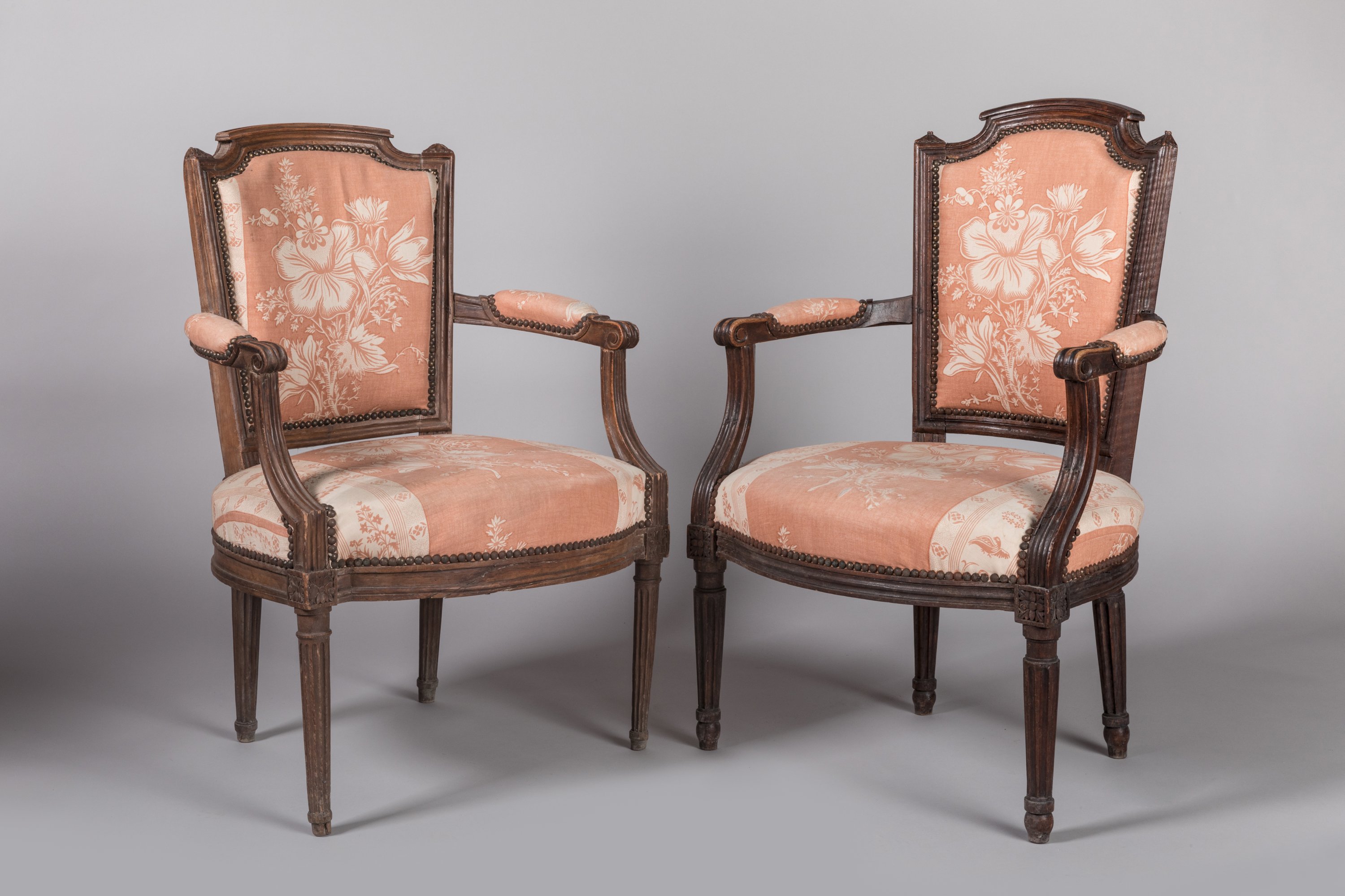 Deux FAUTEUILS CABRIOLETS formant fausse paire, en bois naturel mouluré et sculpté, le dossier en chapeau de gendarme, les accotoirs à manchettes reposant sur des consoles cannelées, la ceinture cintrée, les dés de raccordement à fleurettes. Quatre pieds fuselés et cannelés.