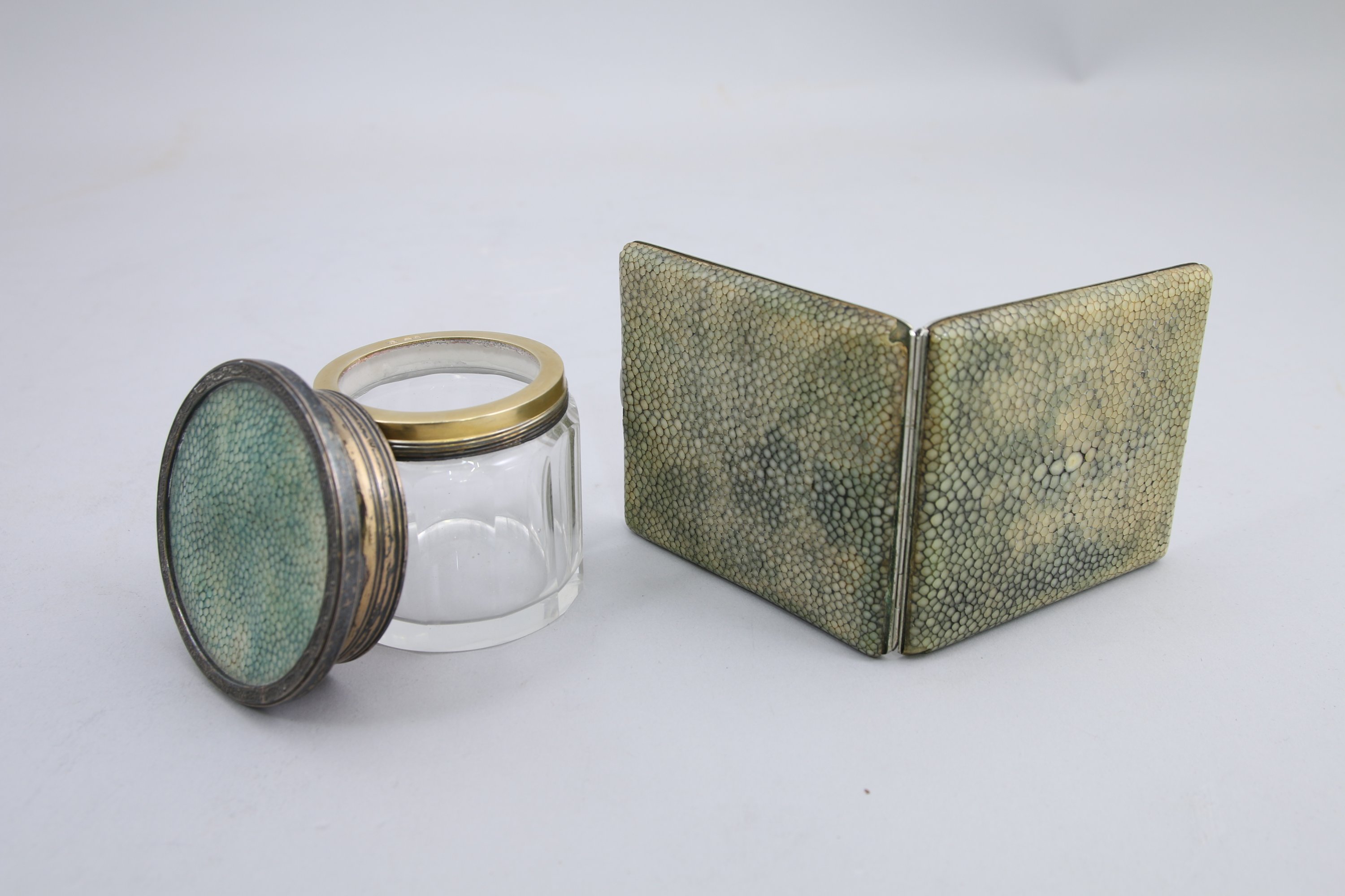 - Un POT à FARD en cristal à pan coupé, le bouchon en argent à motif de guirlandes et nuds entourant un galuchat teinté vert. Haut. 5,5, Diam. 5,7 cm. Poids brut : 255 g.