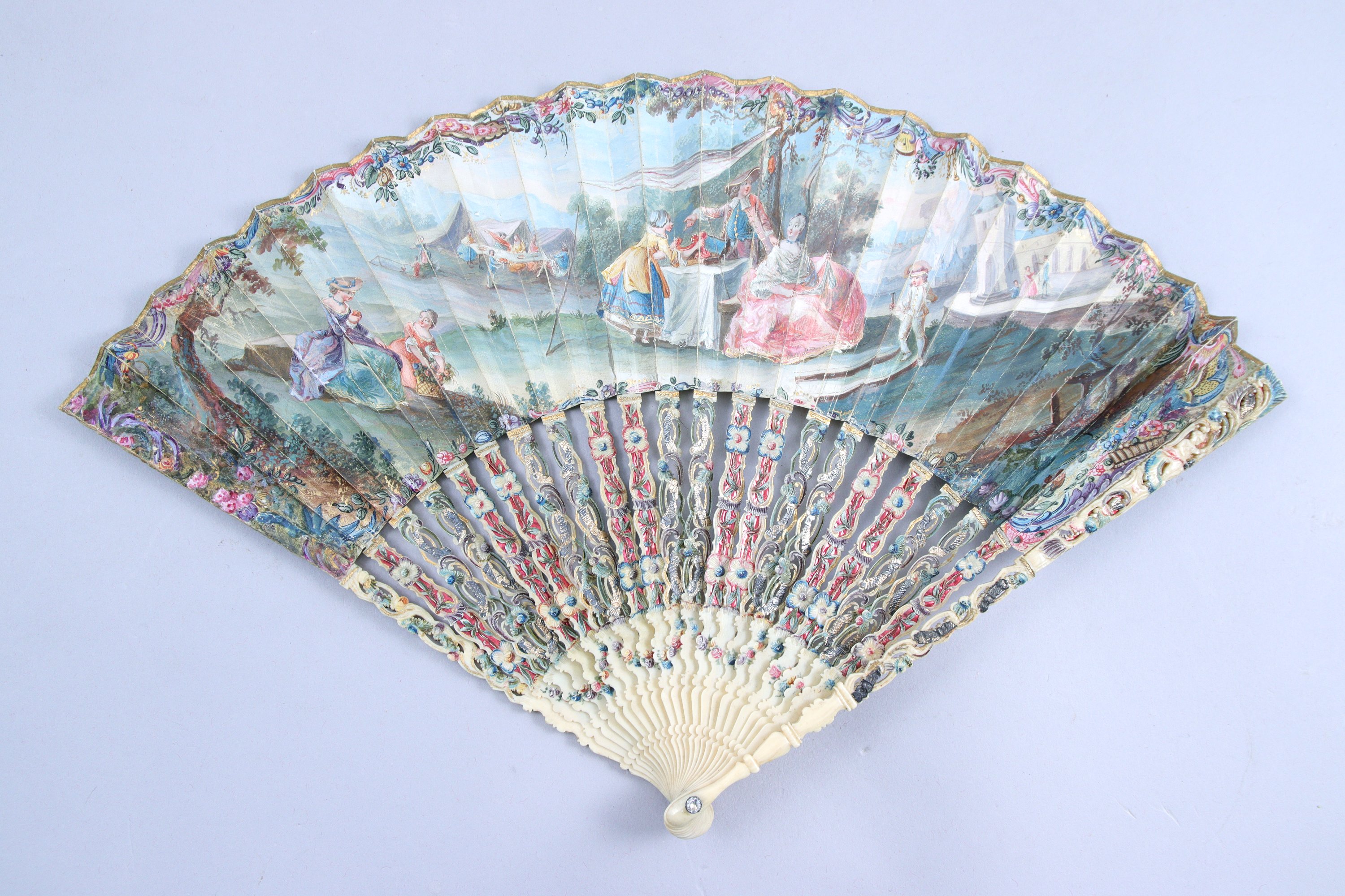 Plié, la feuille double en papier peint à la gouache dune scène champêtre animée de personnages devant des étals de marchands. Revers peint dun couple dans un décor champêtre.