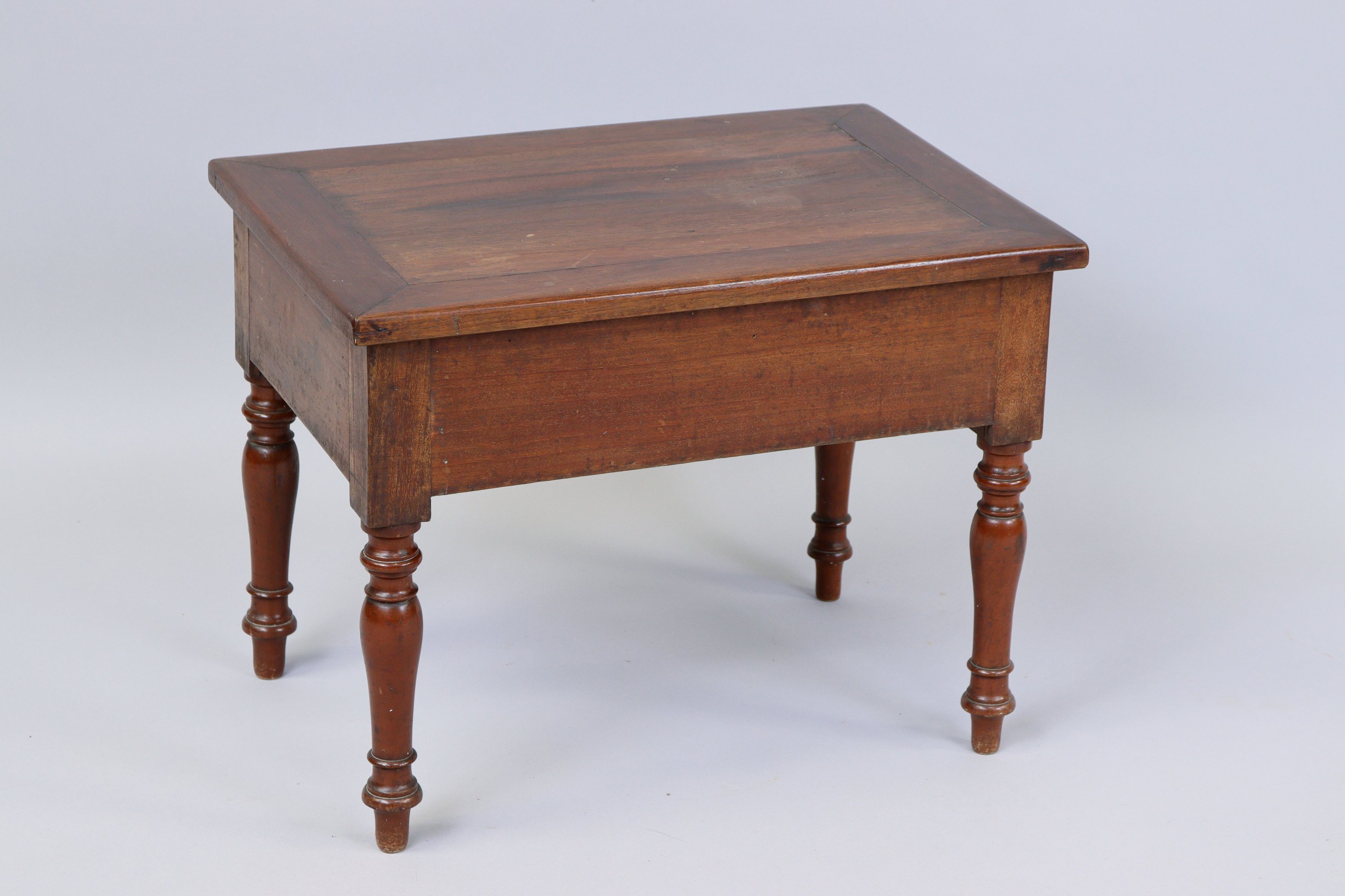TABOURET de forme rectangulaire en placage d'acajou ouvrant par un abattant et reposant sur quatre pieds balustres.