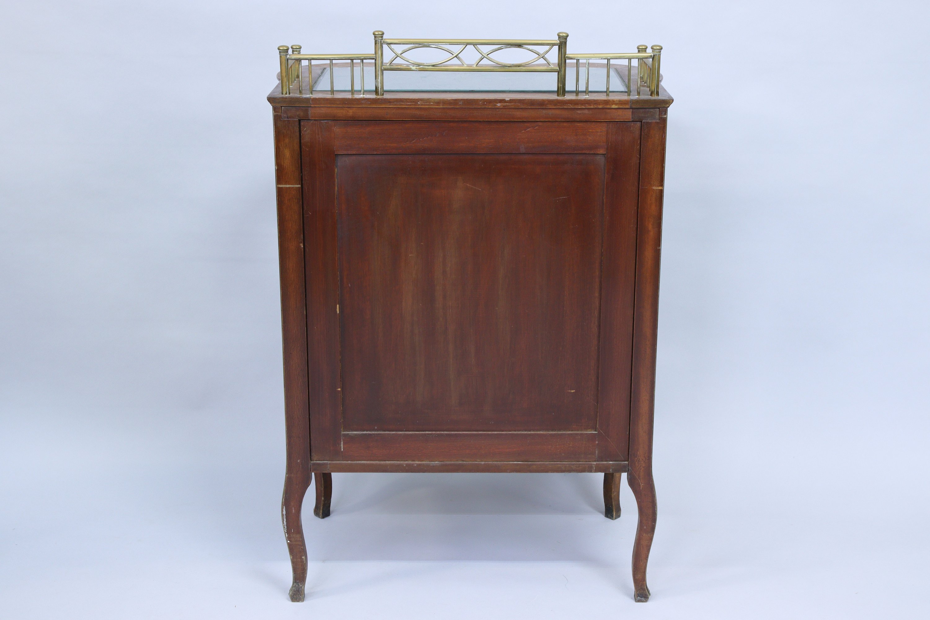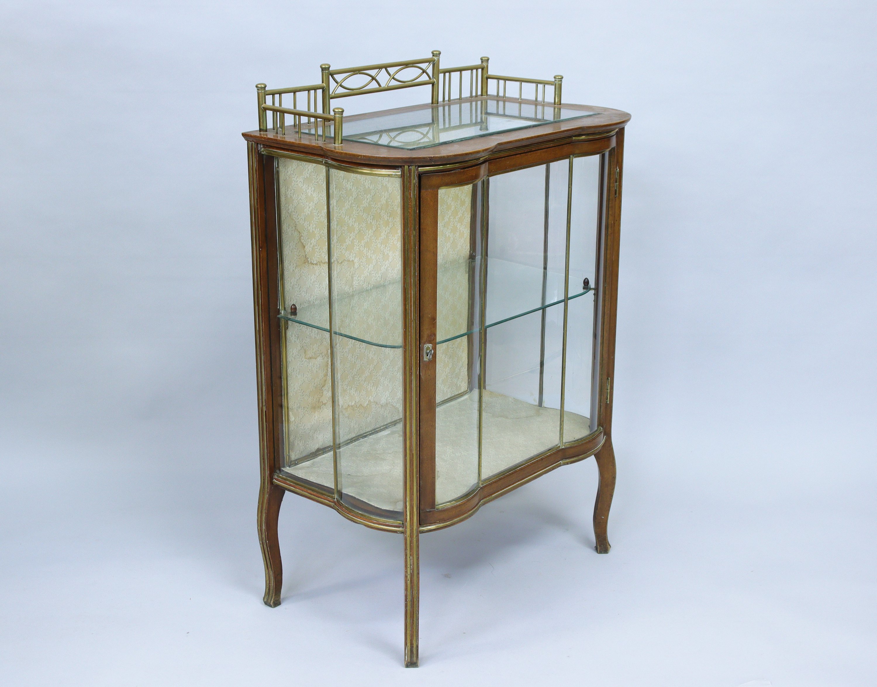 vitrée sur les côtés et le dessus. Elle ouvre par une porte galbée en façade et découvre une étagère en verre. Les côtés pareillement bombés pour partie. La vitrine est sommée d'une galerie en cuivre. Des lingotières en cuivre ornent les montants, les pieds et le contour des vitres. Piètement contourné. L'intérieur tapissé.