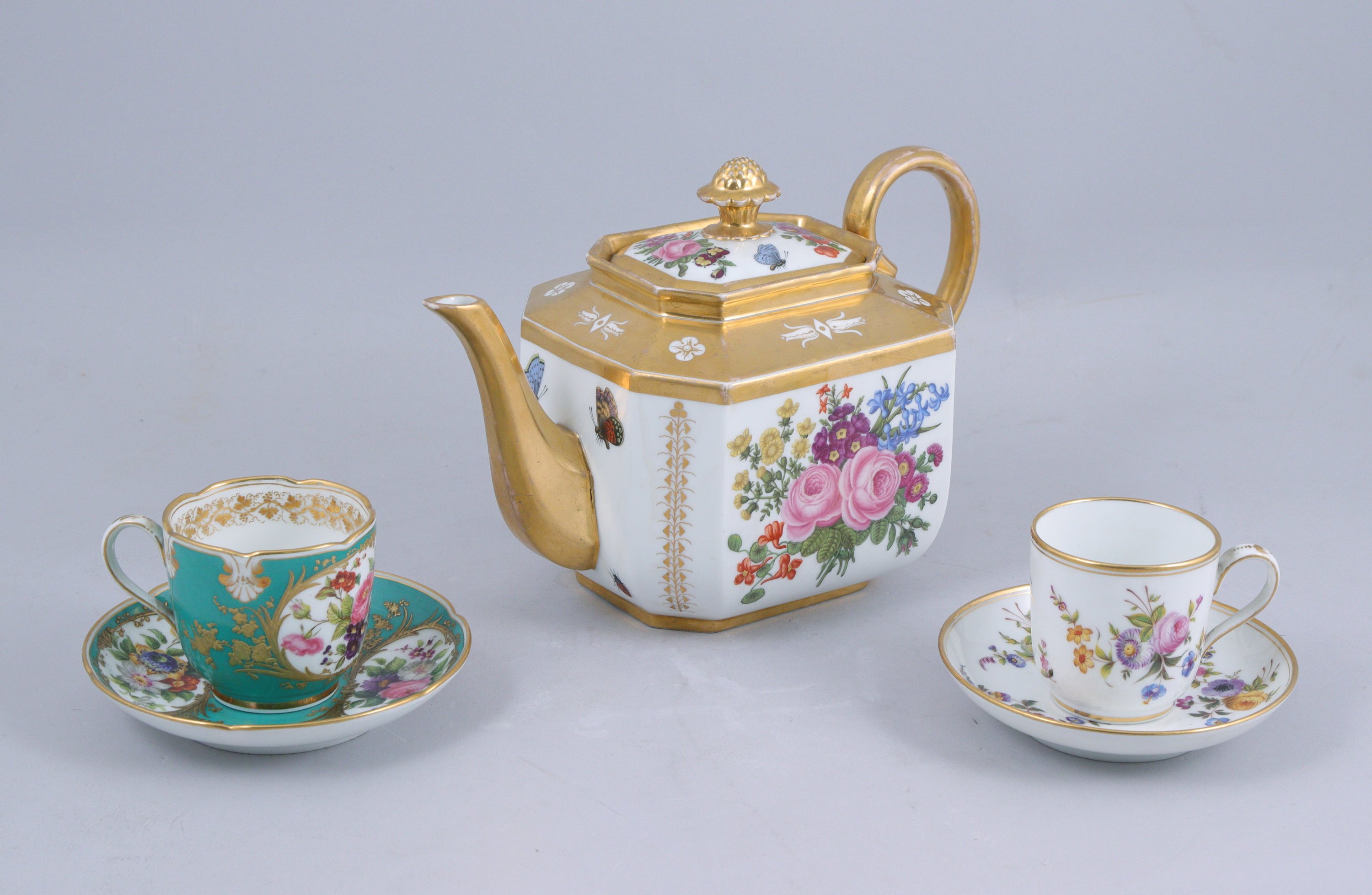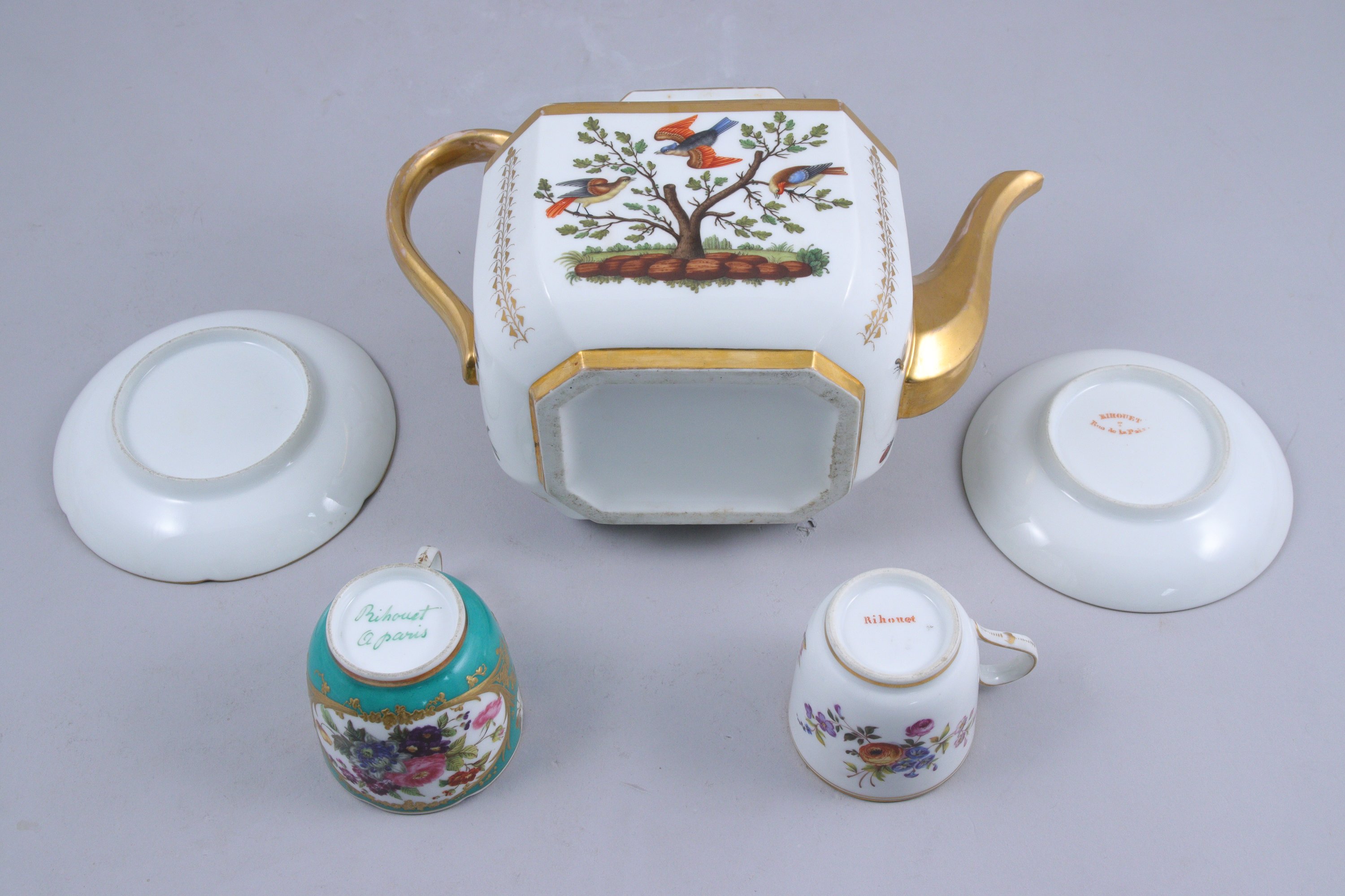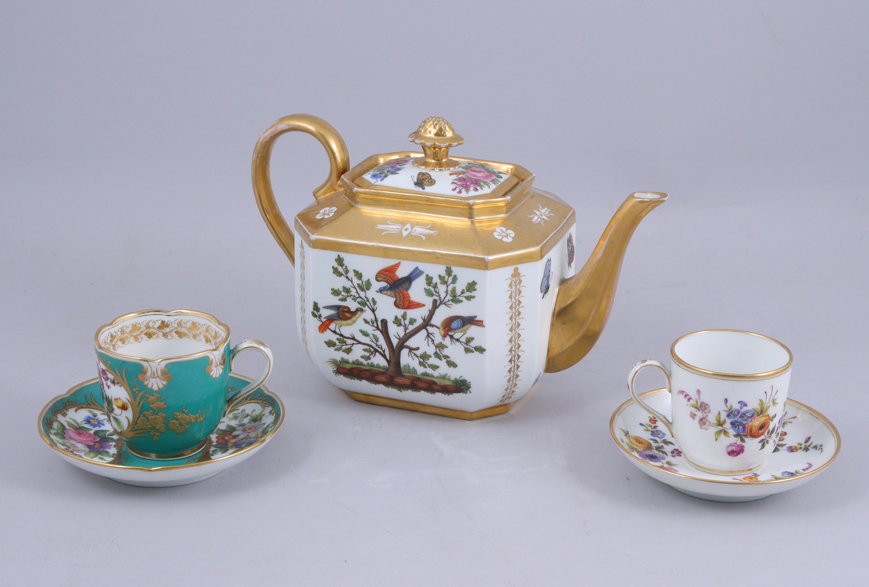 - THÉIÈRE à fond blanc et or à décor sur une face d'oiseaux perchés sur un arbre, sur l'autre d'un bouquet de fleurs. Le fretel en forme de fleur épanouie reposant sur un couvercle orné de papillons et fleurs. Haut. 17 cm (usures à l'or).