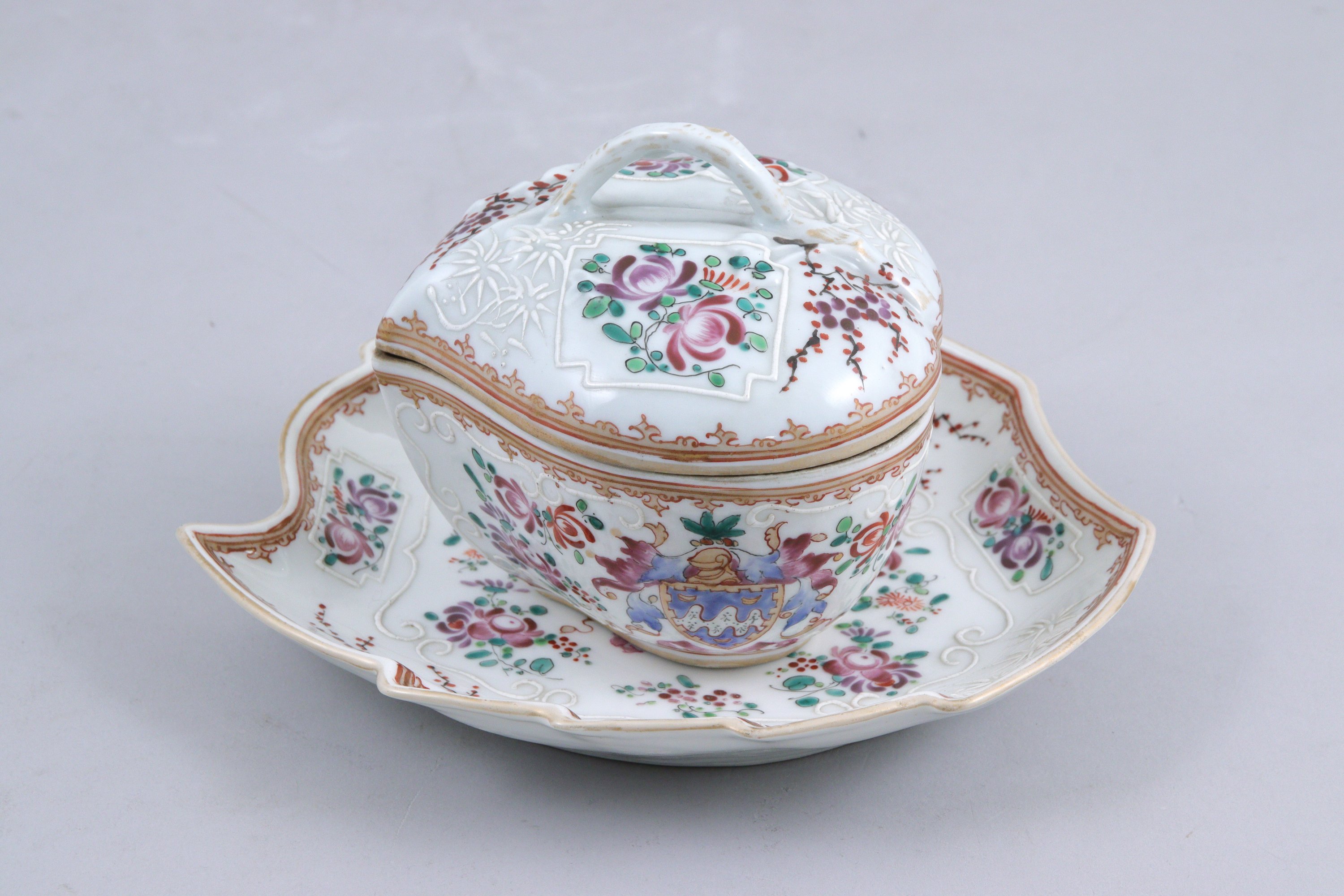 Joint : Petit pot couvert et son assiette en porcelaine blanche en forme de coeur. Décor de branches de cerisier en fleur, bouquets et armoirie au centre de l'assiette. Marques en rouge et bleu.