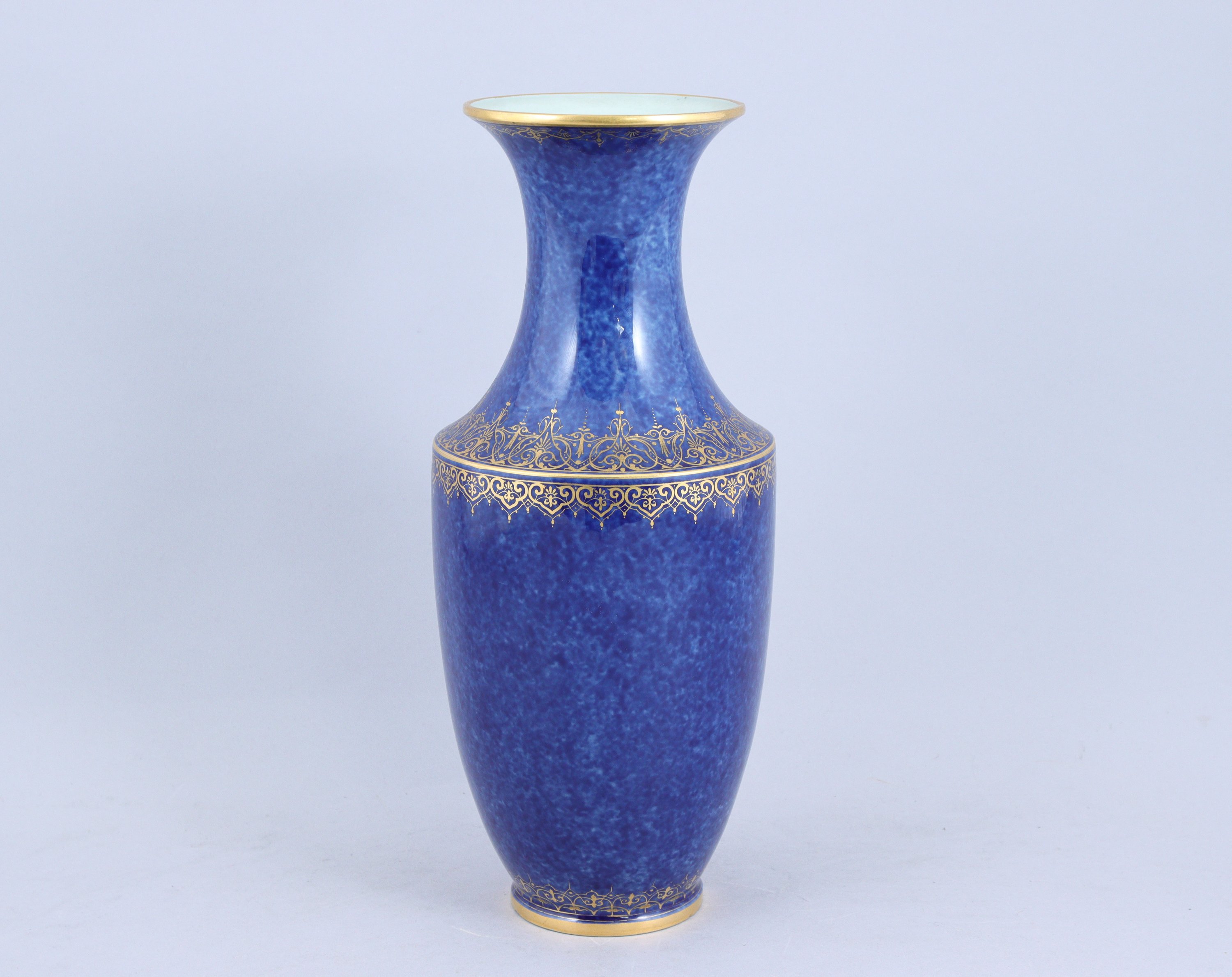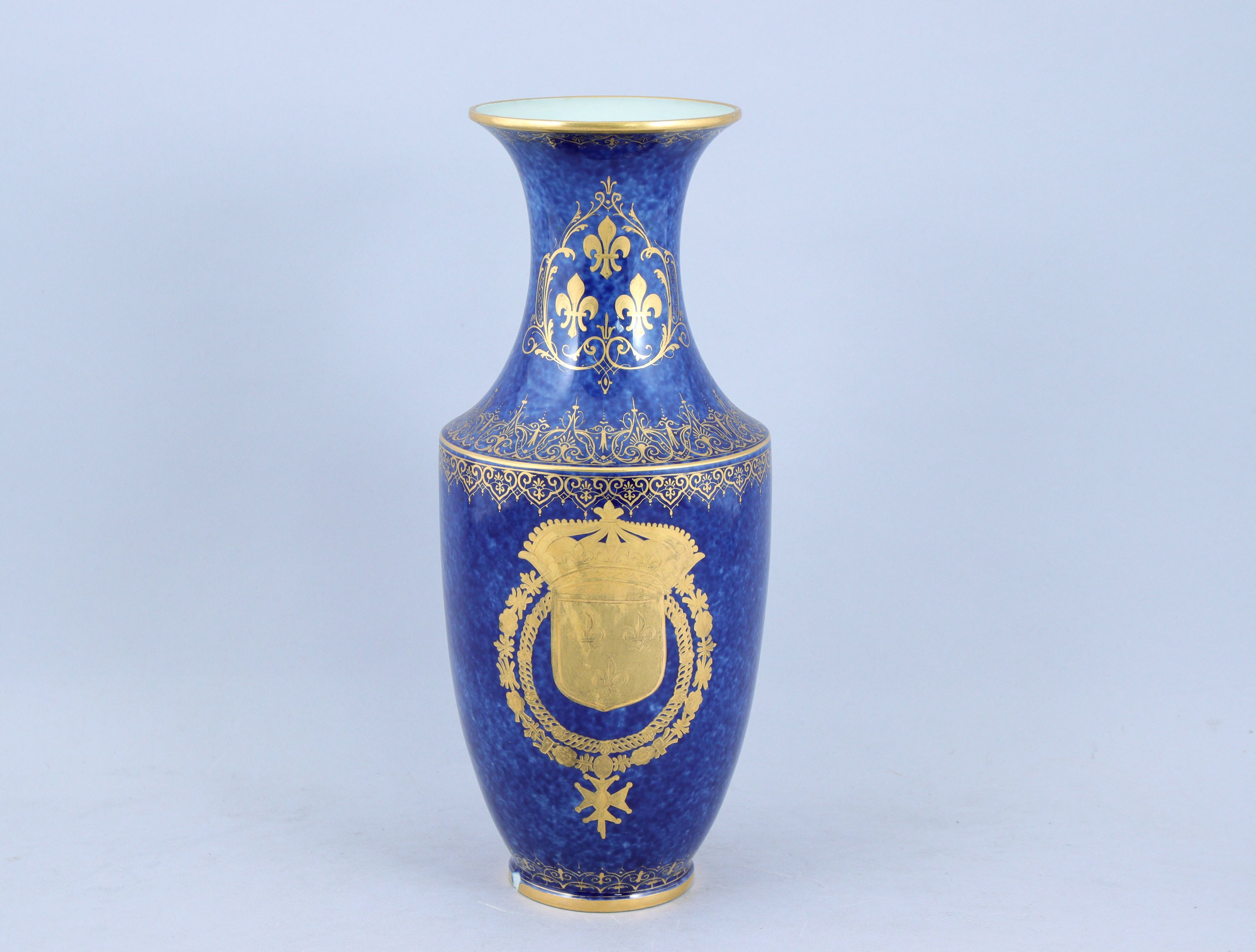 SÈVRES. VASE BALUSTRE en porcelaine au décor à l'or, éventuellement rapporté en l'honneur du comte de Chambord, des grandes armes de France sur un fond bleu marbré avec des frises festonnées.