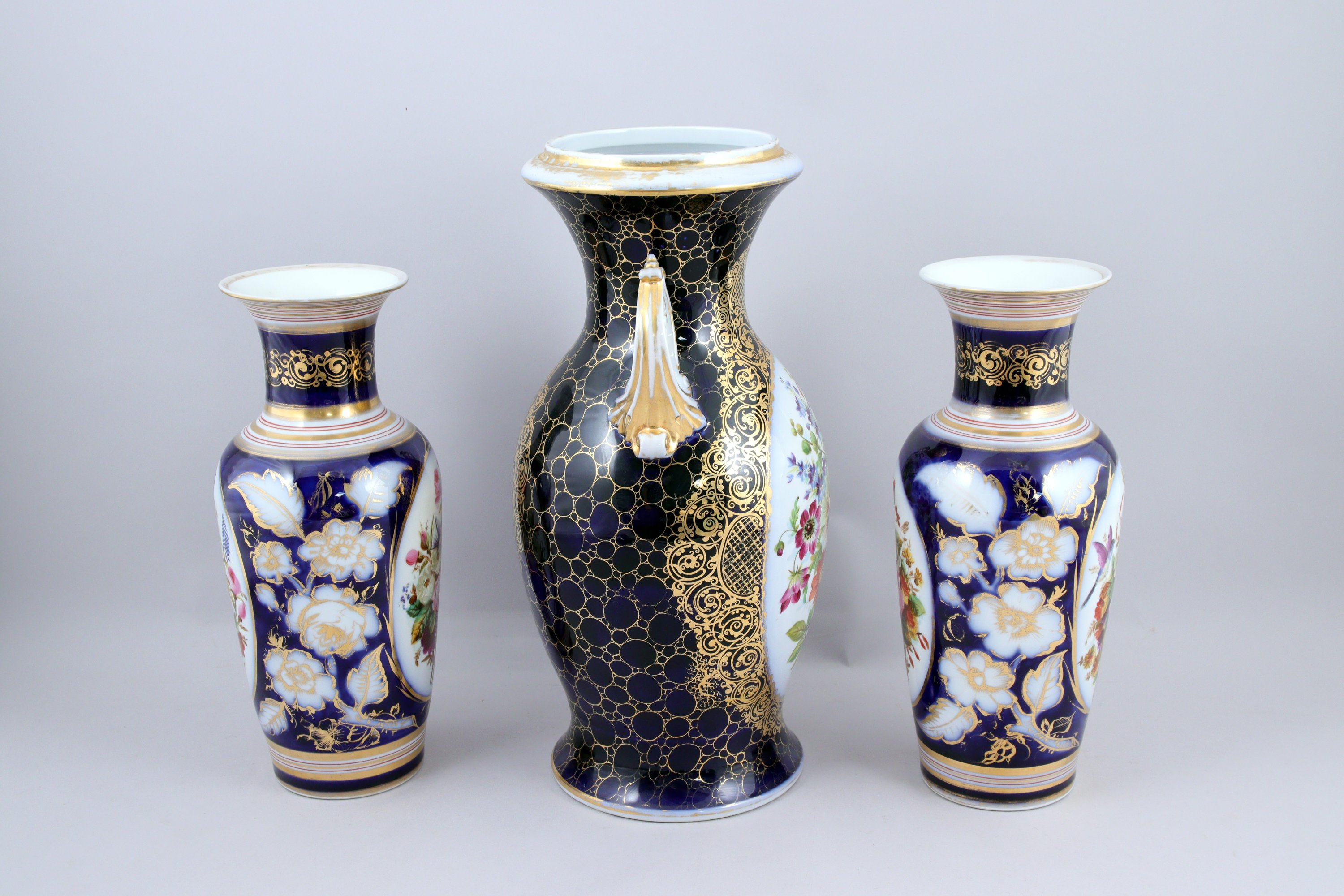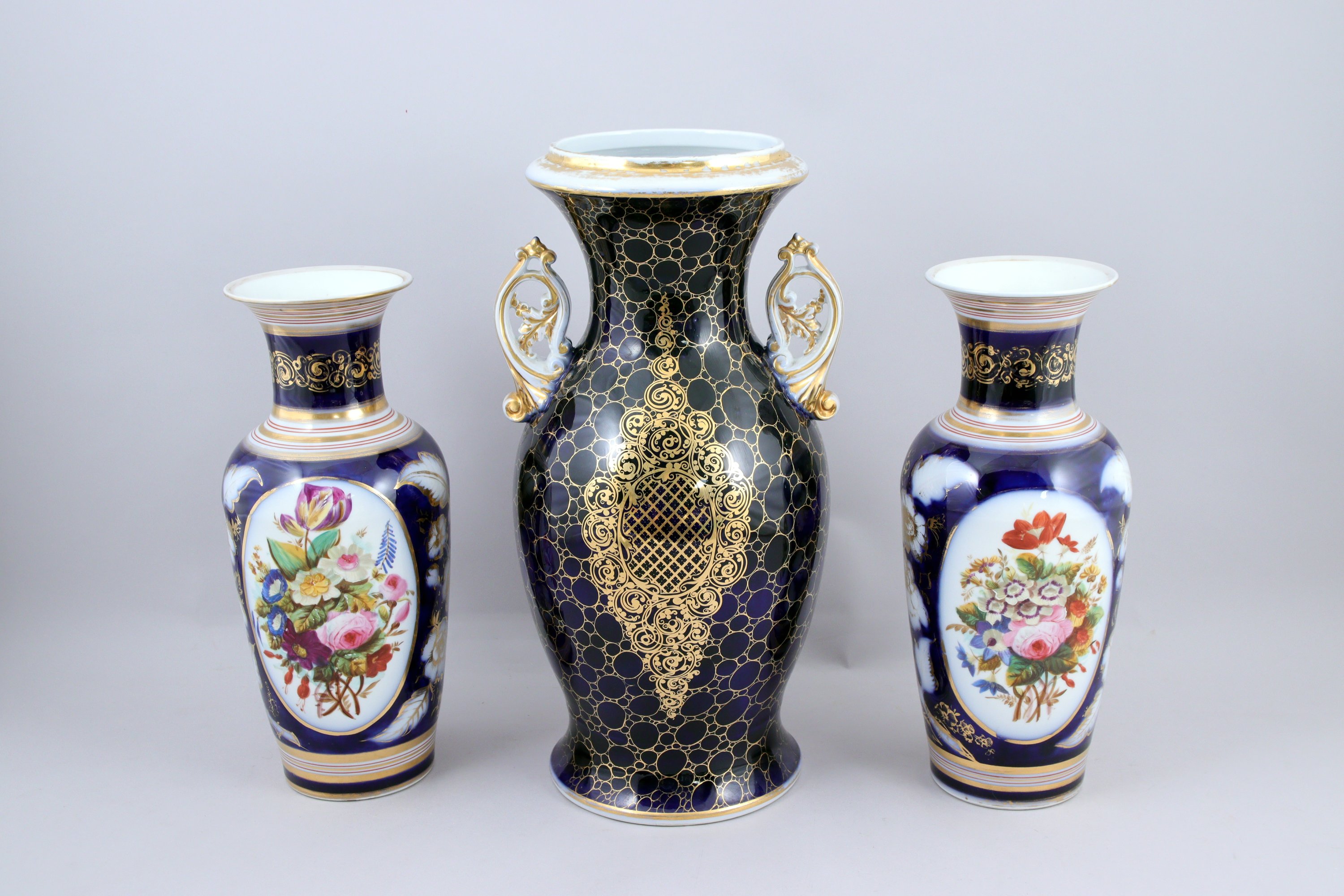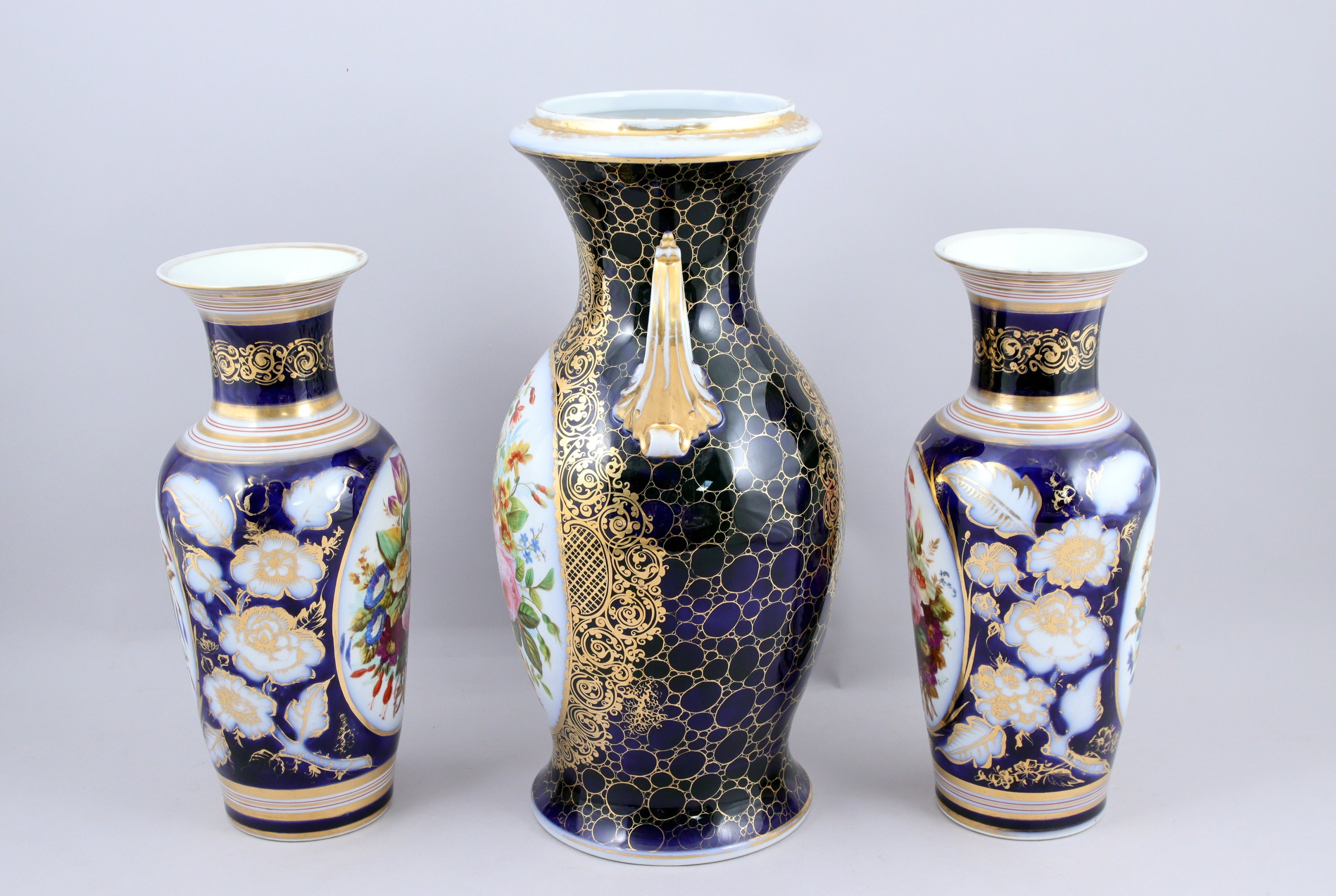 à décor de bouquets de fleurs dans des médaillons sur fond bleu rehaussé à l'or. Le plus grand vase est orné de deux anses feuillagées.