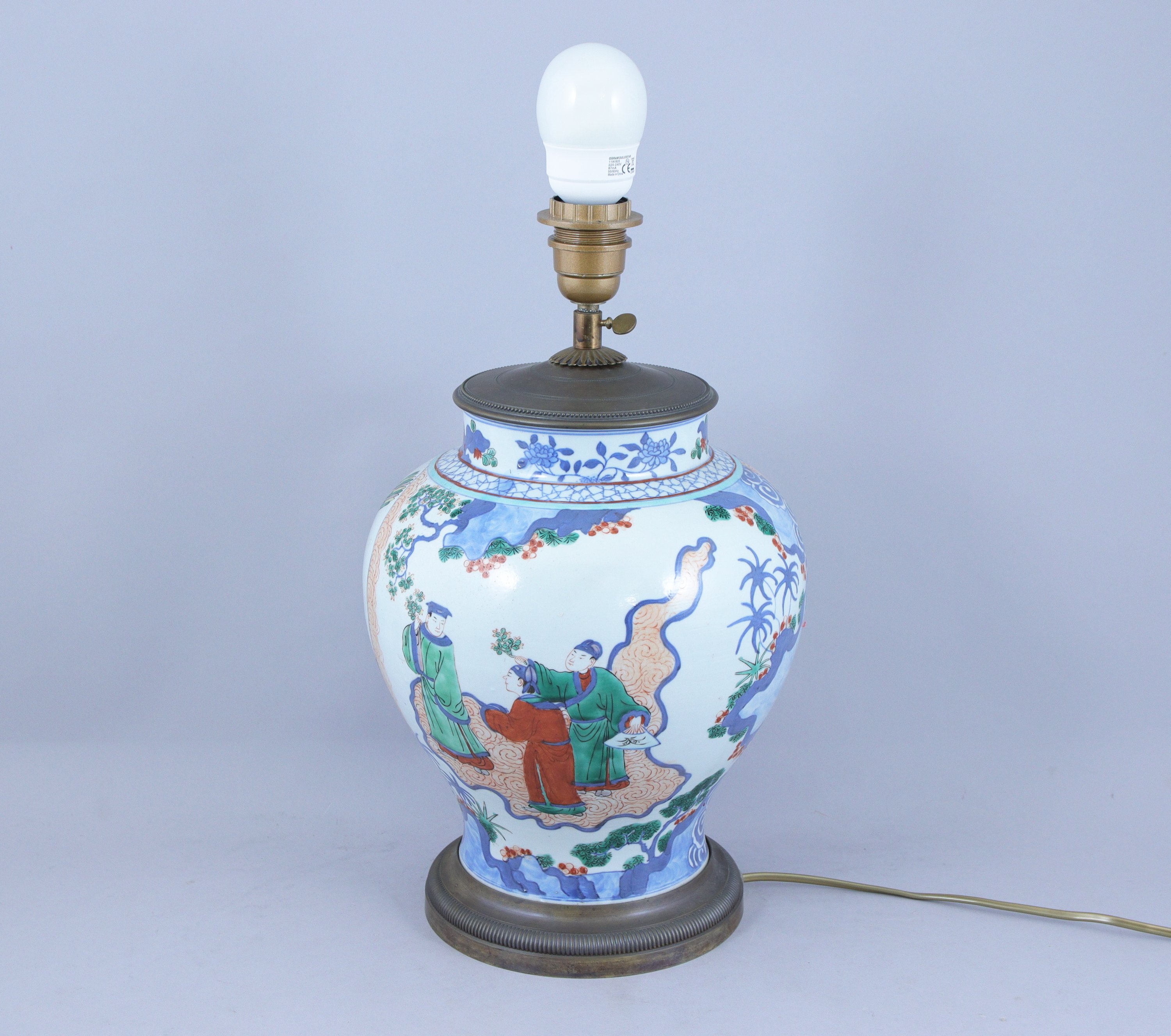 POTICHE en porcelaine polychrome à décor de personnages dans un paysage. Monture en bronze doré, ornée d'une frise de godrons.