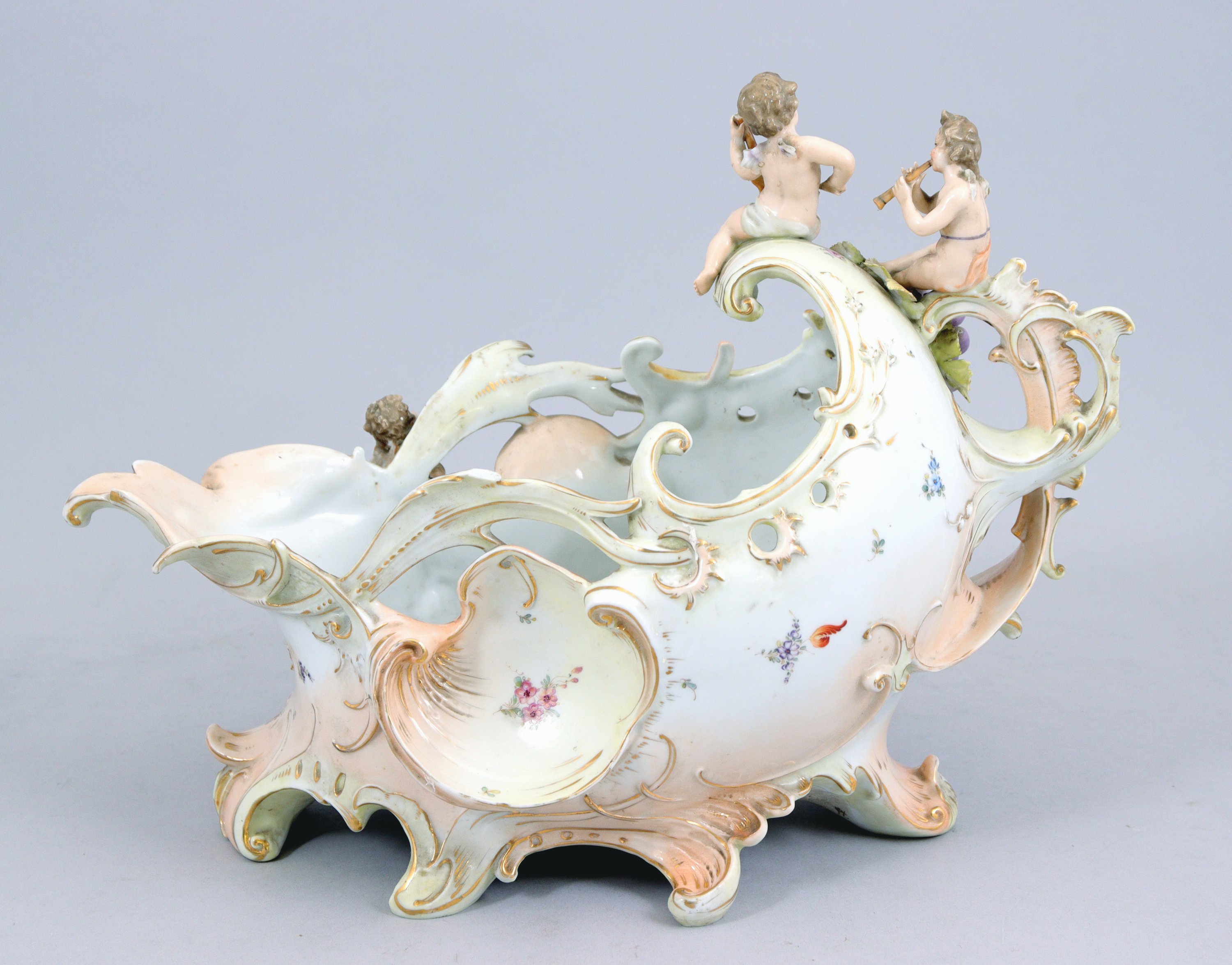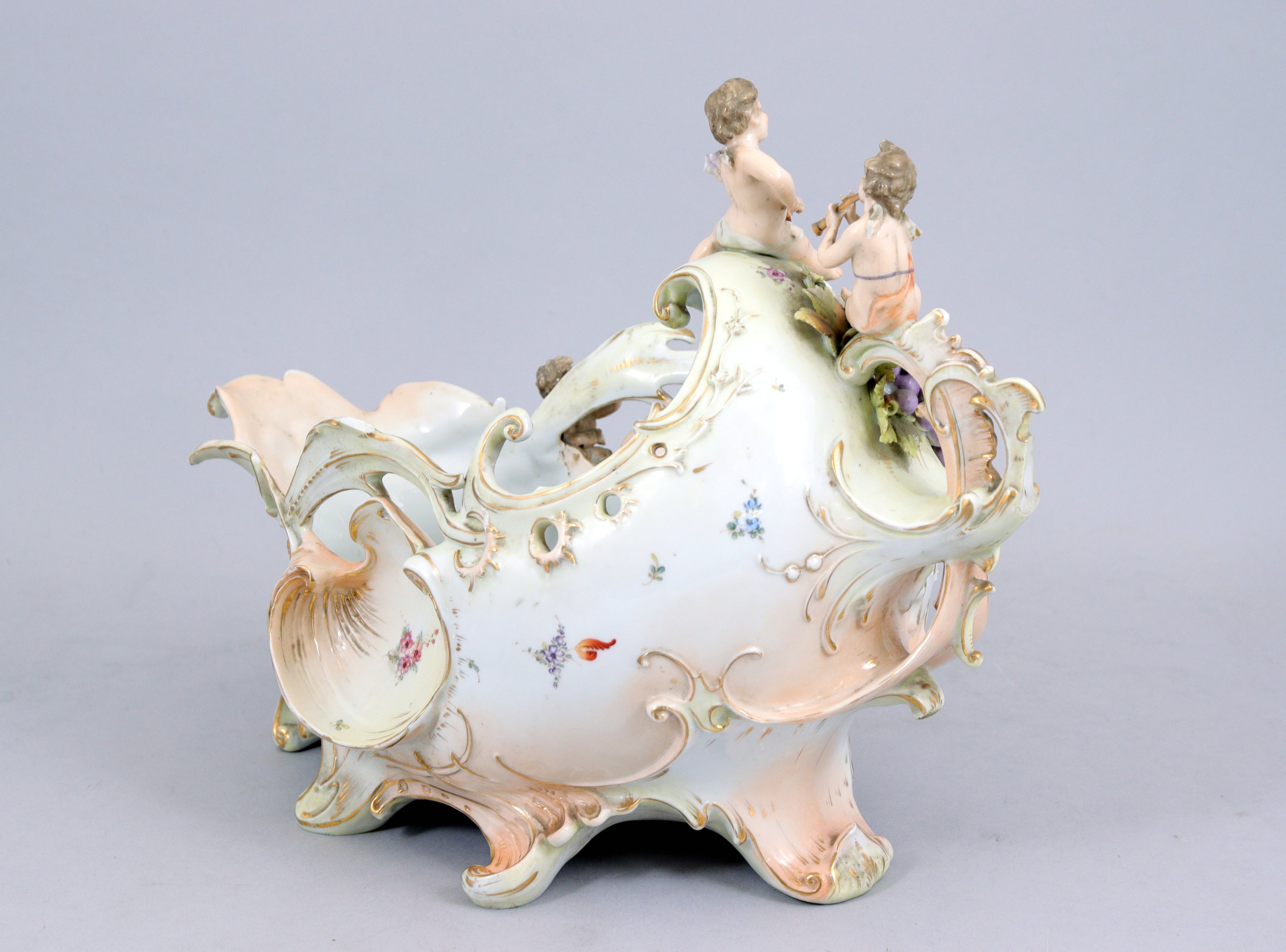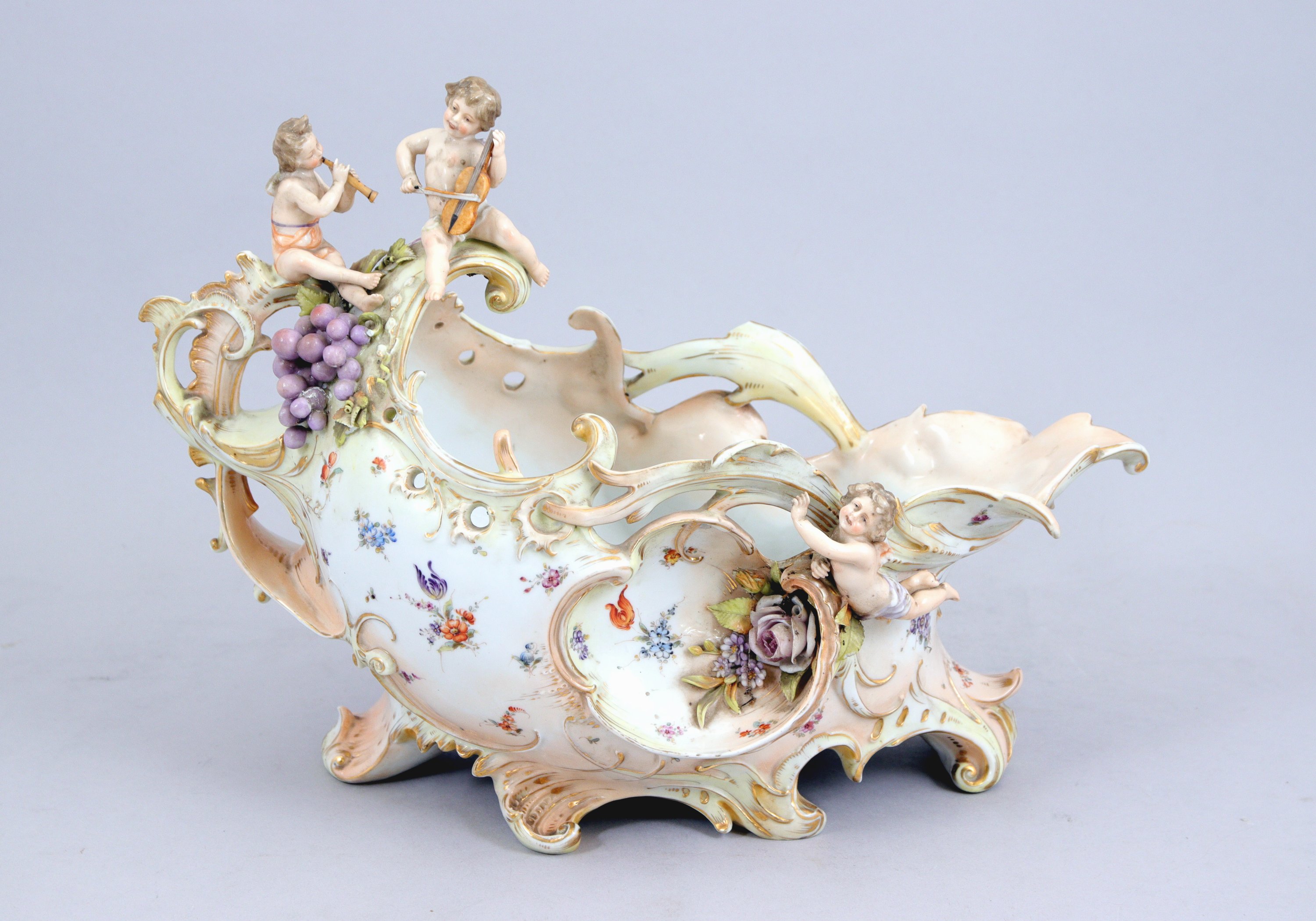 de forme mouvementée à décor ajouré et rehauts polychrome en relief, figurant des putti musiciens, fleurs et fruits.