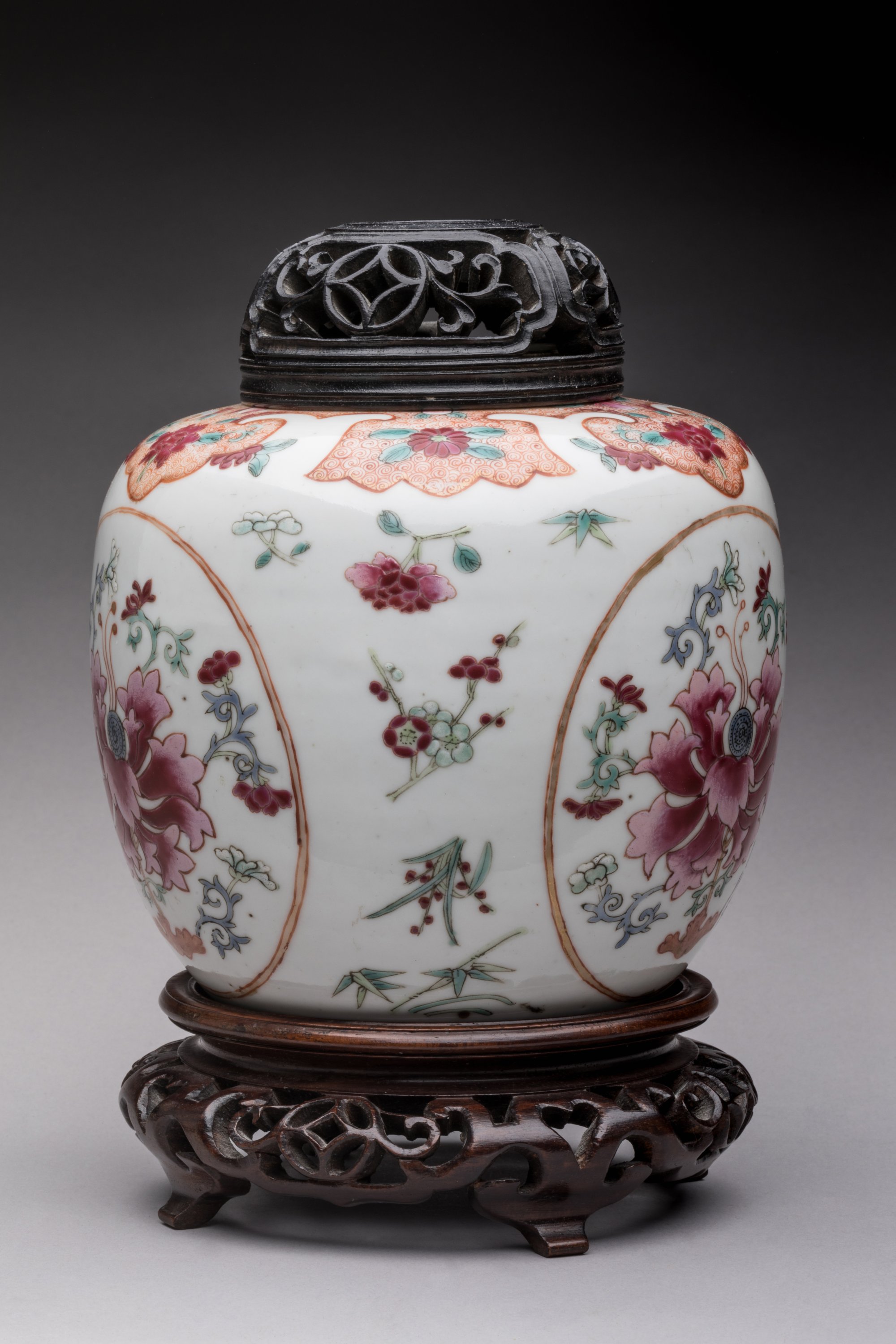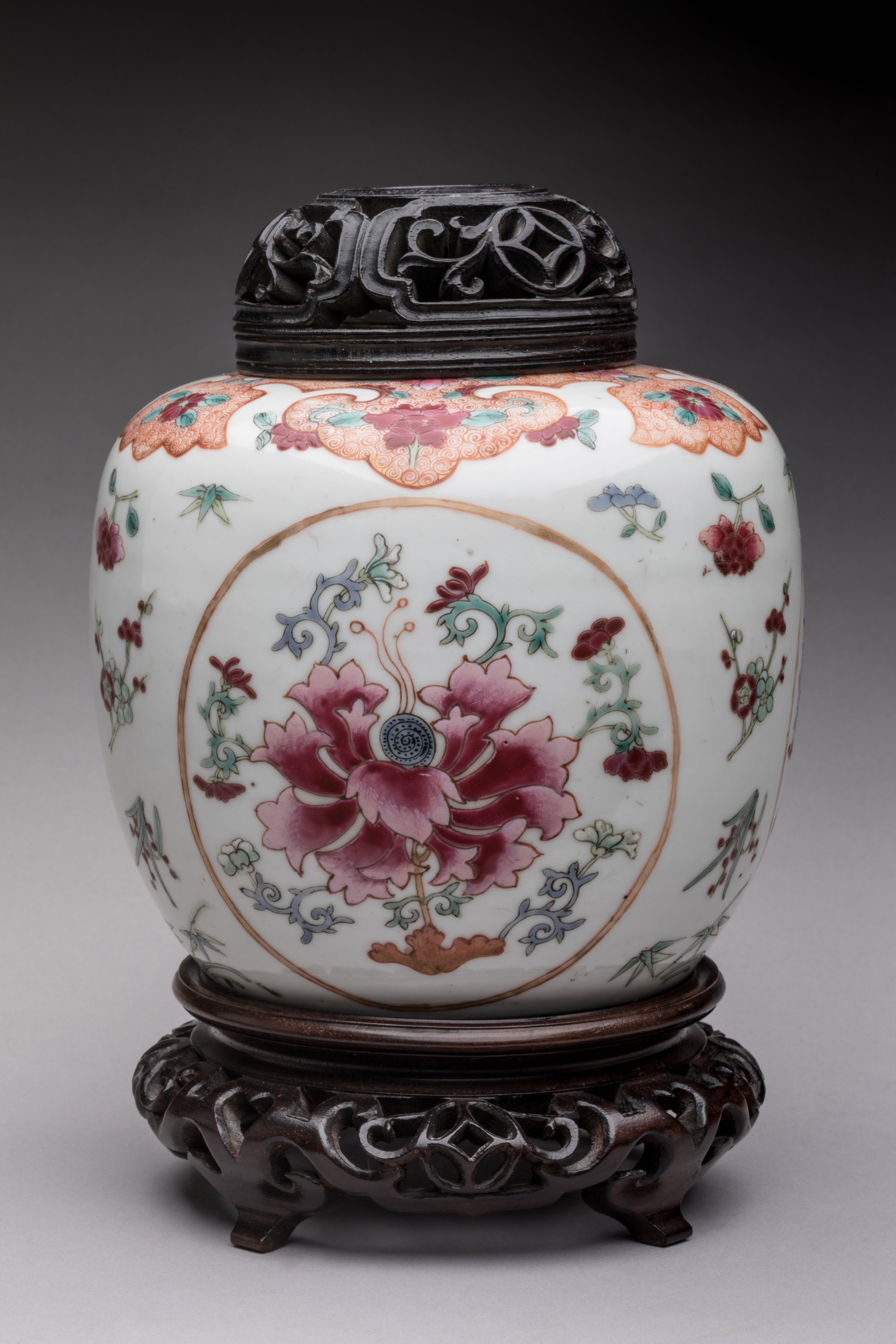 en porcelaine émaillée polychrome dans le style de la famille rose à décor de fleurs dans des médaillons, couvercle et socle en bois reposant sur quatre pieds.