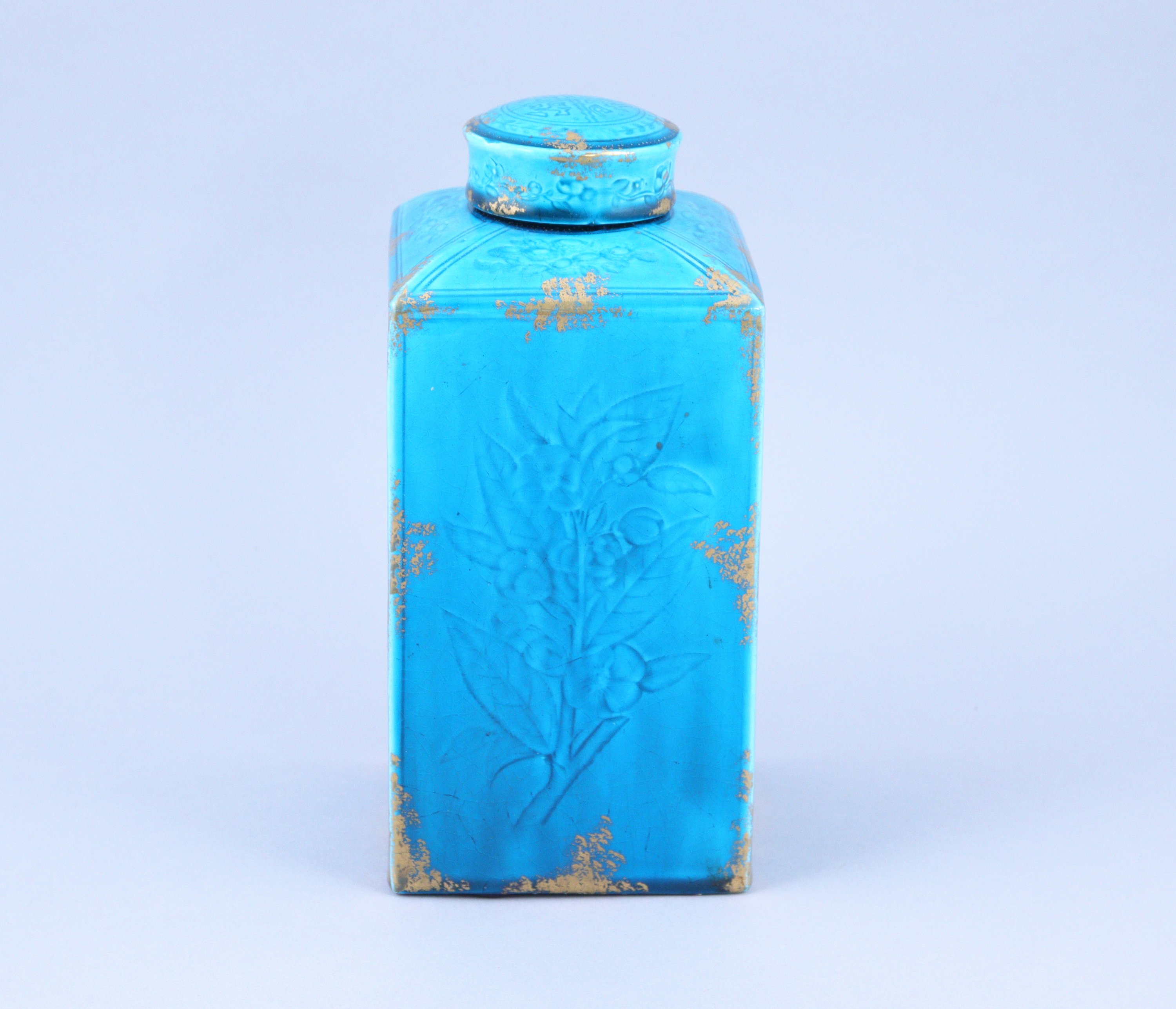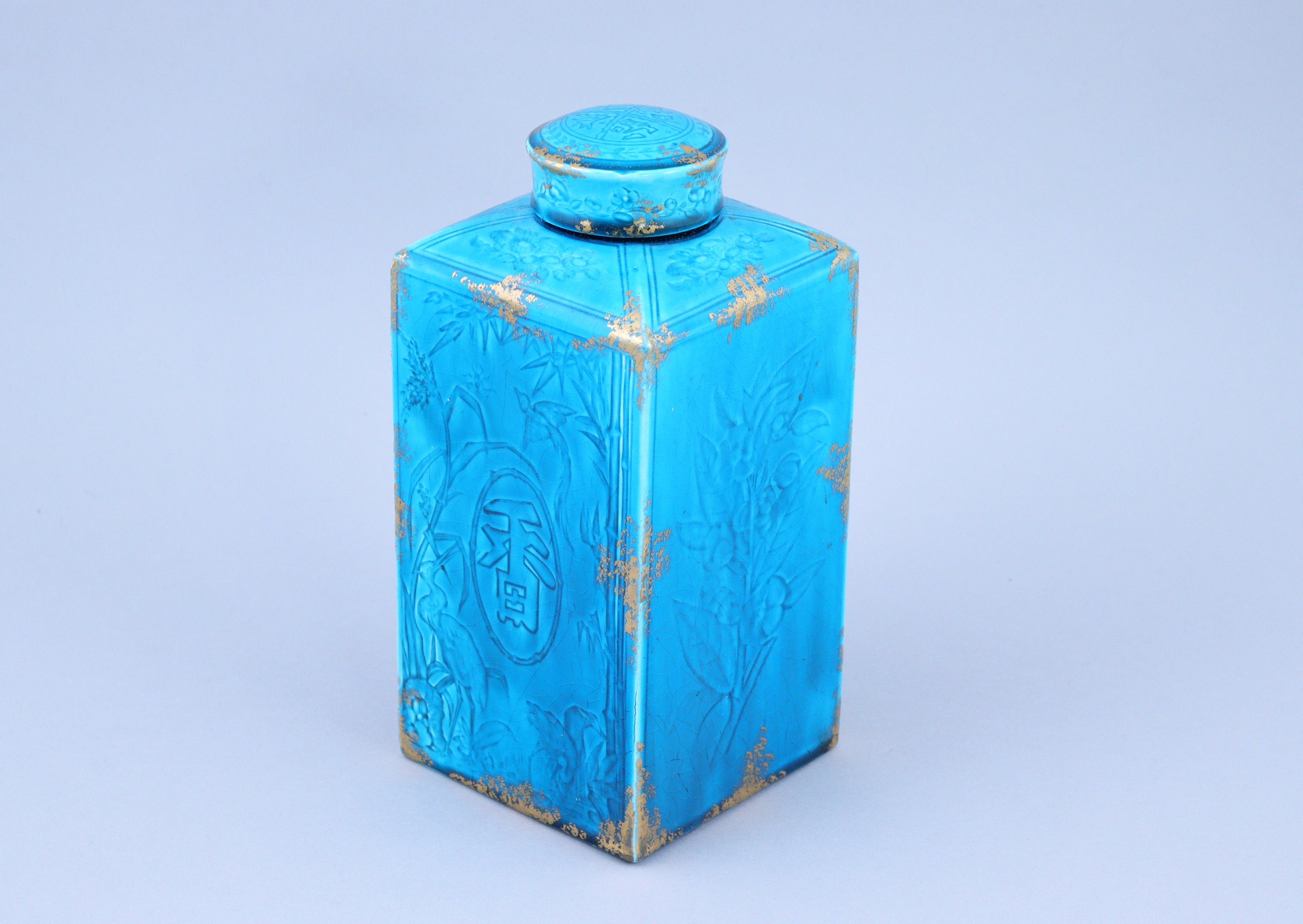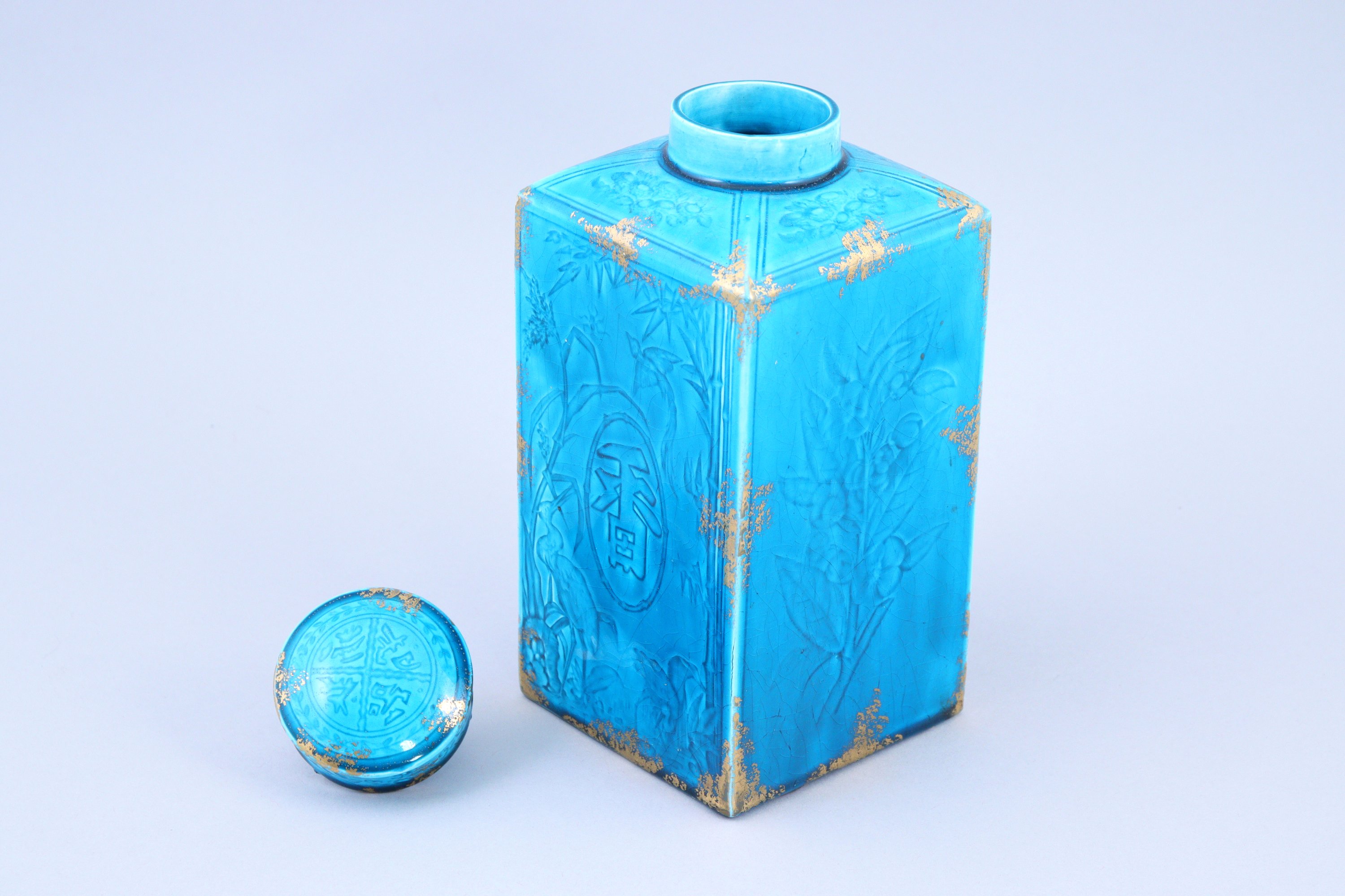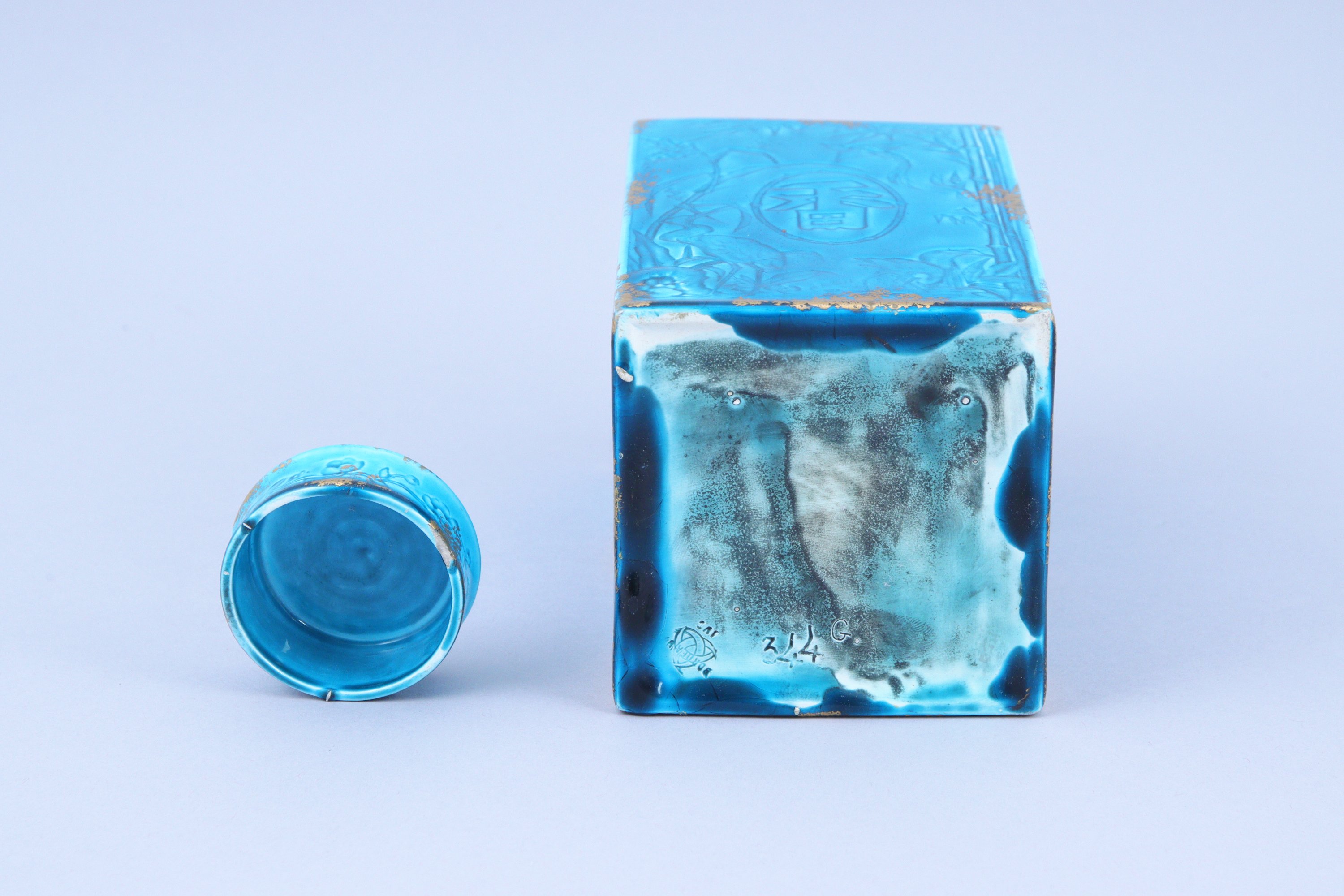 FLACON en faïence emmaillée turquoise avec son bouchon. Décor incisé aux motifs floraux et idéogrammes asiatiques. Traces d'or.
