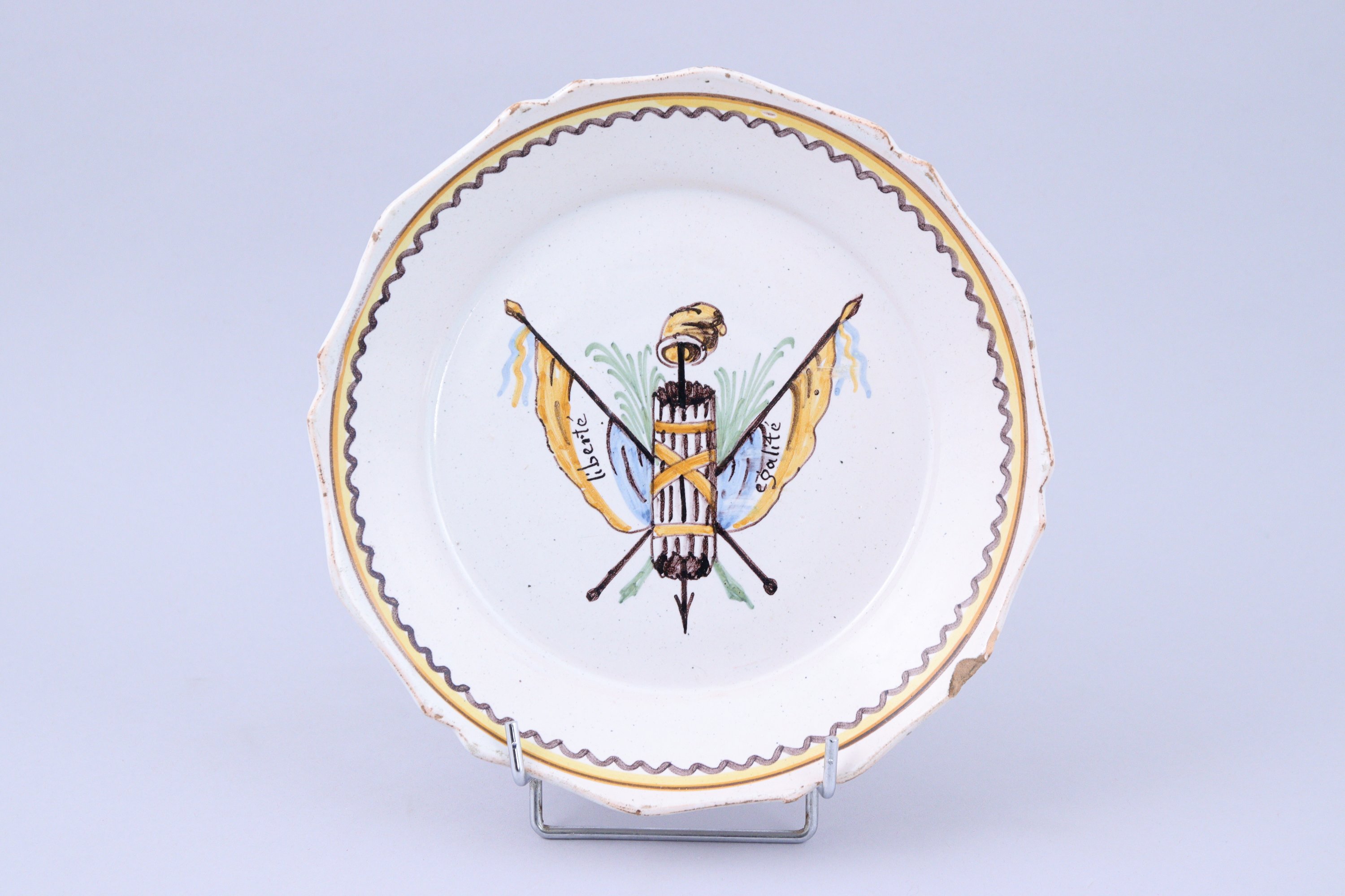 ASSIETTE RÉVOLUTIONNAIRE en faïence à décor de faisceau de licteur à bonnet phrygien, portant les inscriptions "liberté, égalité".