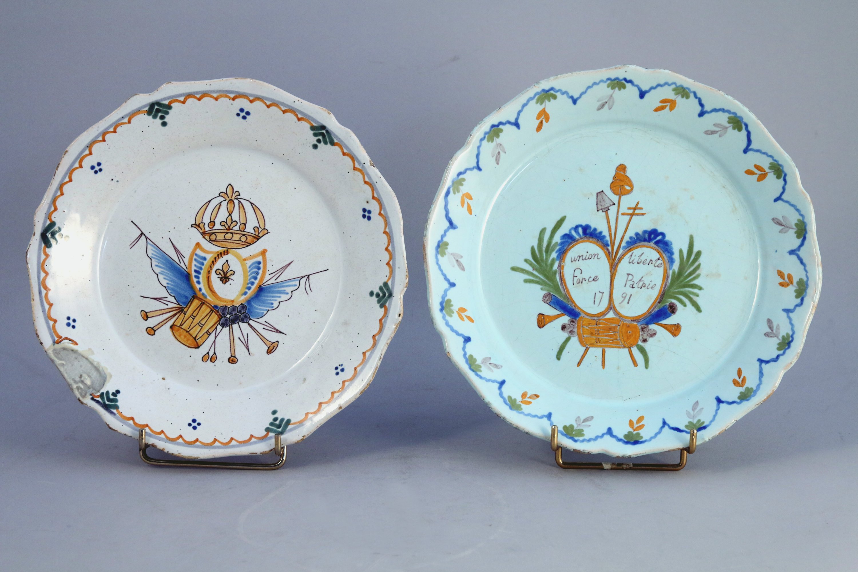 JOINT : ASSIETTE dans le goût de NEVERS, à bord contourné en faïence. Décor polychrome de grand feu de deux écussons encadrés de feuillage, portant une inscription "union liberte force Patrie 1791" au dessous, un trophée composé d'un tambour, deux canons, trompettes, boulets, surmonté d'une croix à double branches, d'une pelle et d'une pique sommée d'un bonnet phrygien. Copie du XIXe. Diam. 24 cm.