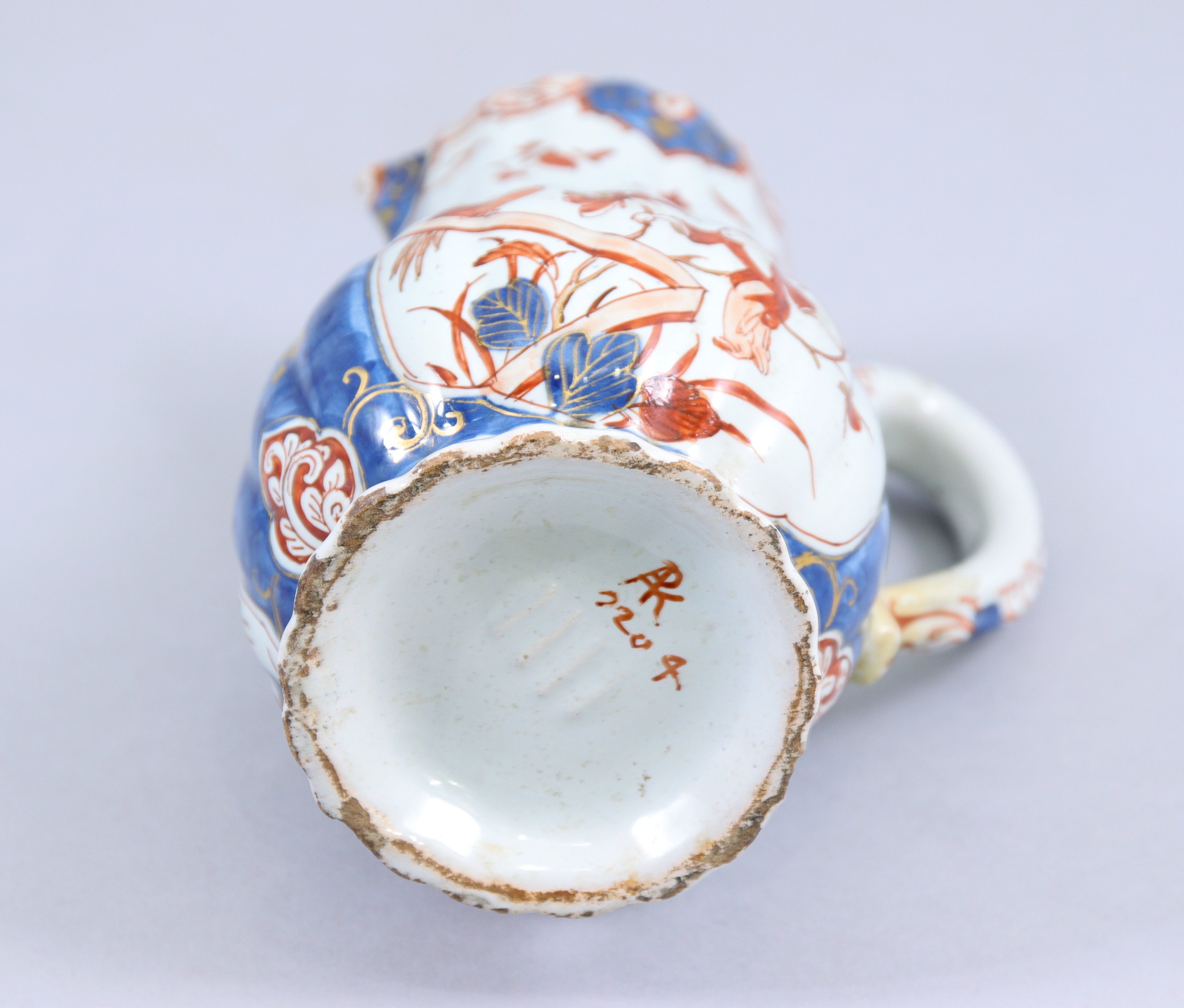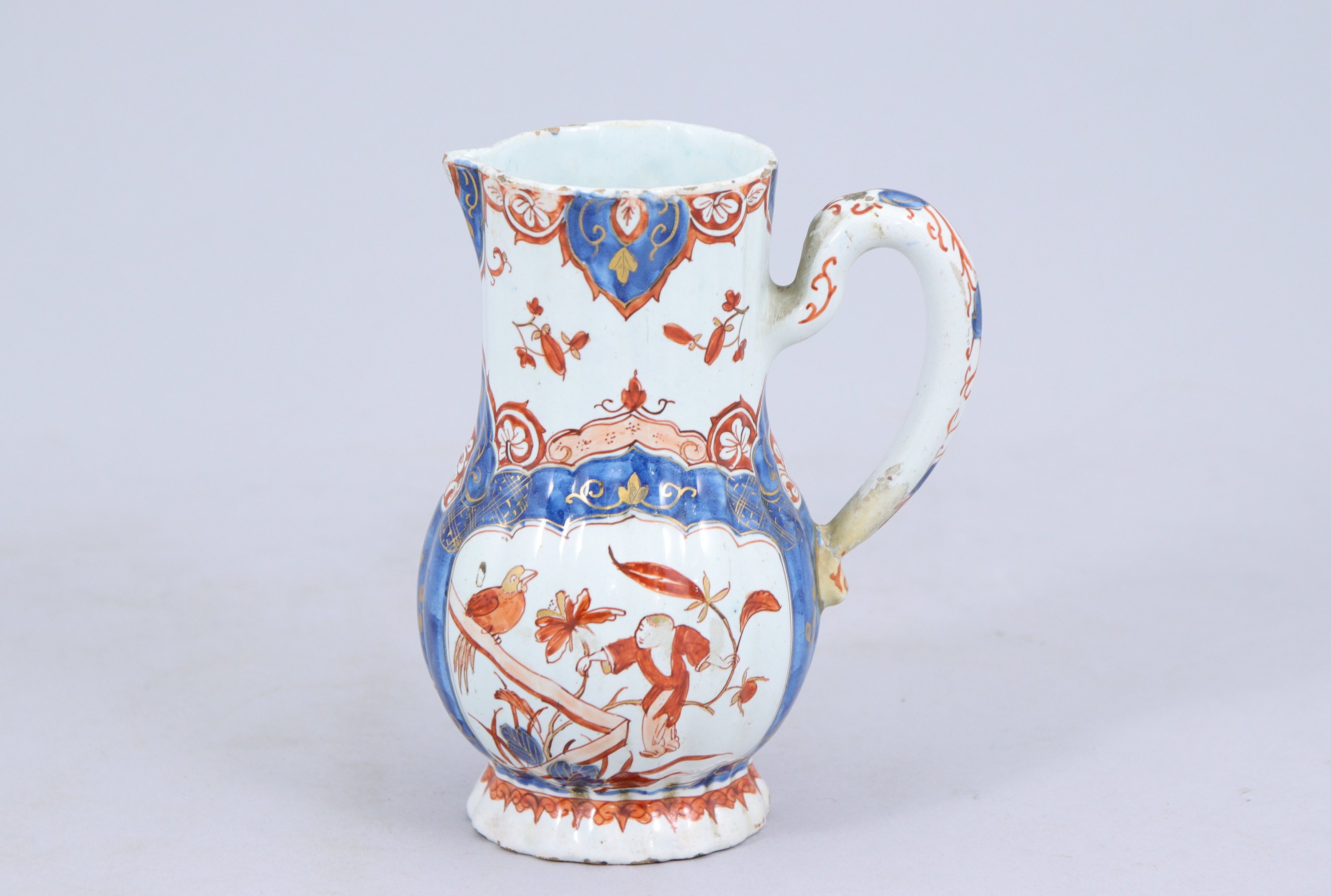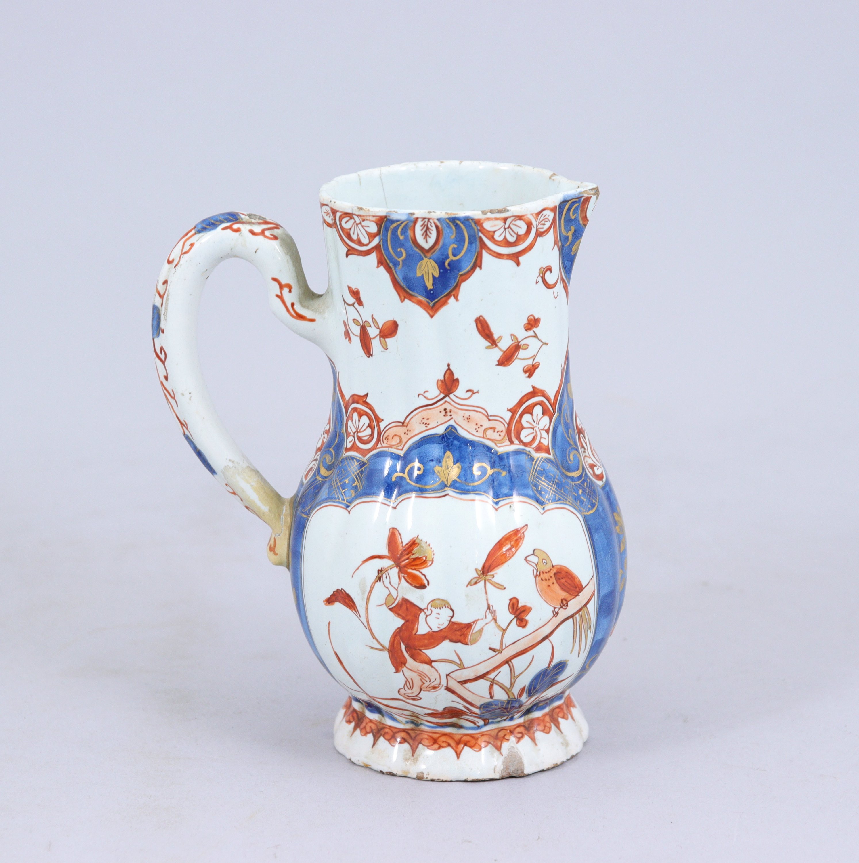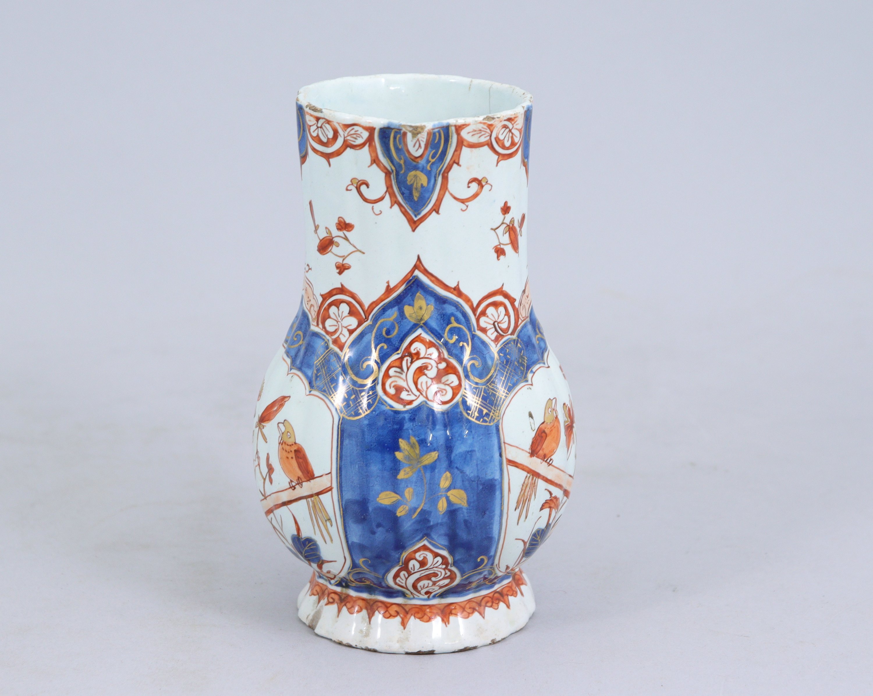 DELFT. VERSEUSE en faïence à décor bleu, rouge et or figurant un personnage et un oiseau perché.