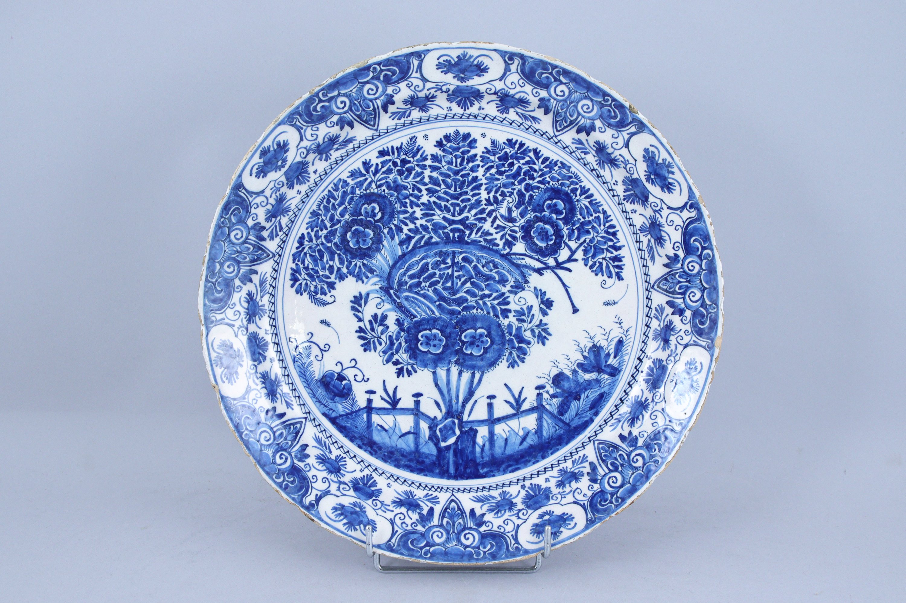 DELFT. PLAT circulaire à décor en camaïeu bleu d'un arbre fleuri (arbre à thé ?) derrière une clôture et de motifs de fleurs.