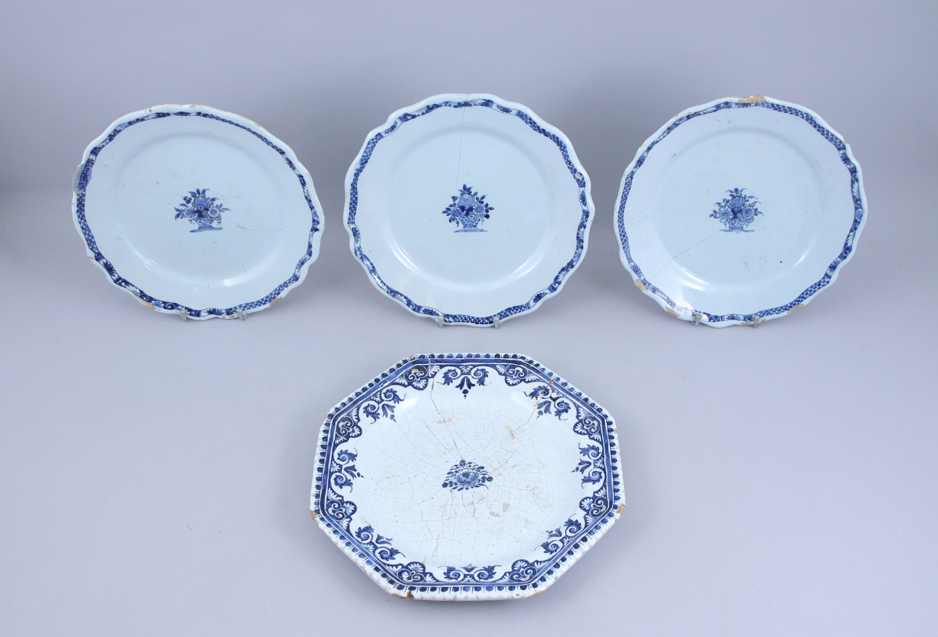 JOINTS : TROIS ASSIETTES et UN PLAT à décor de fleurs et rinceaux feuillagés en camaïeux de bleu sur fond blanc. Travail du XVIIIe. Diam. 25 et 28,5 cm. (accidents)