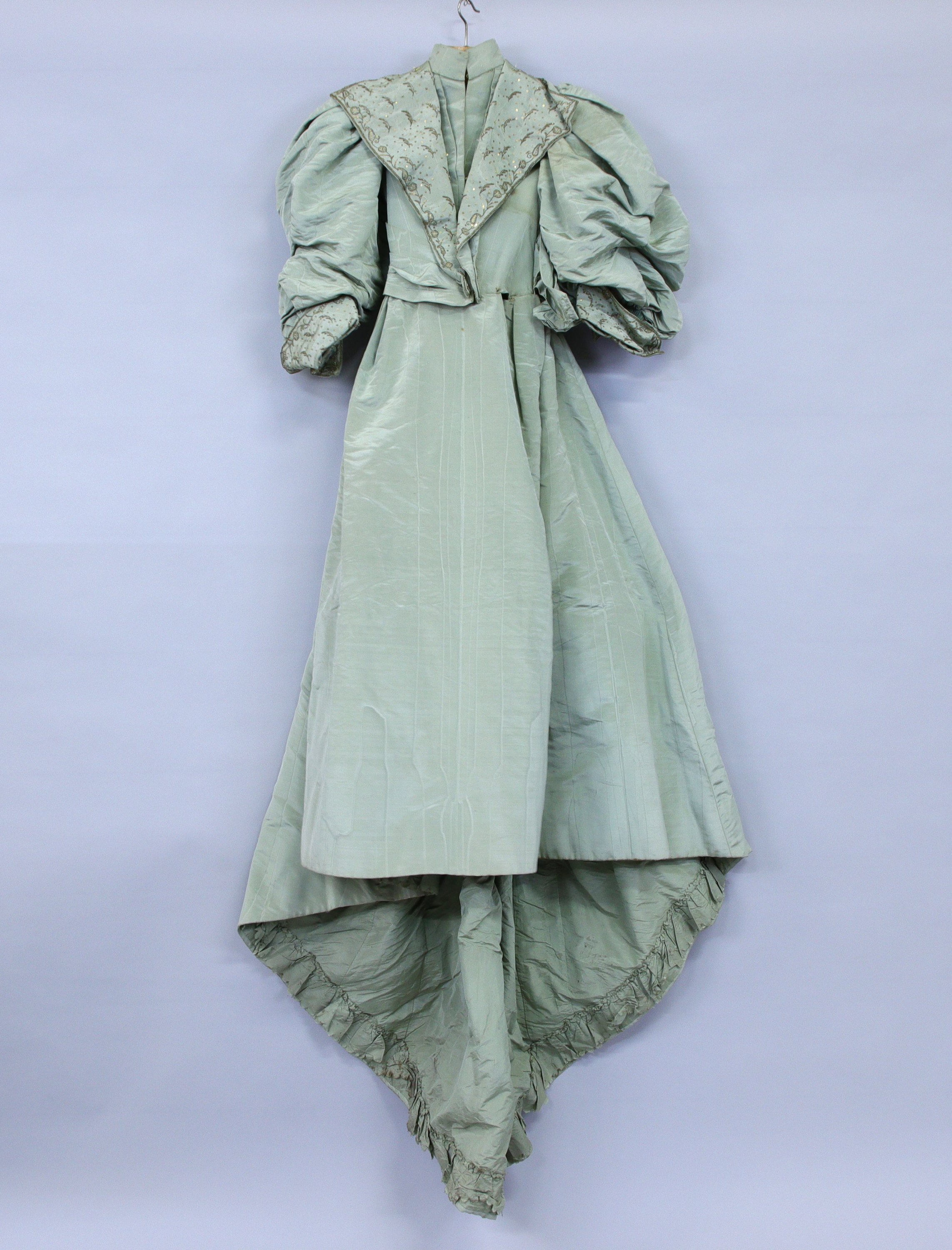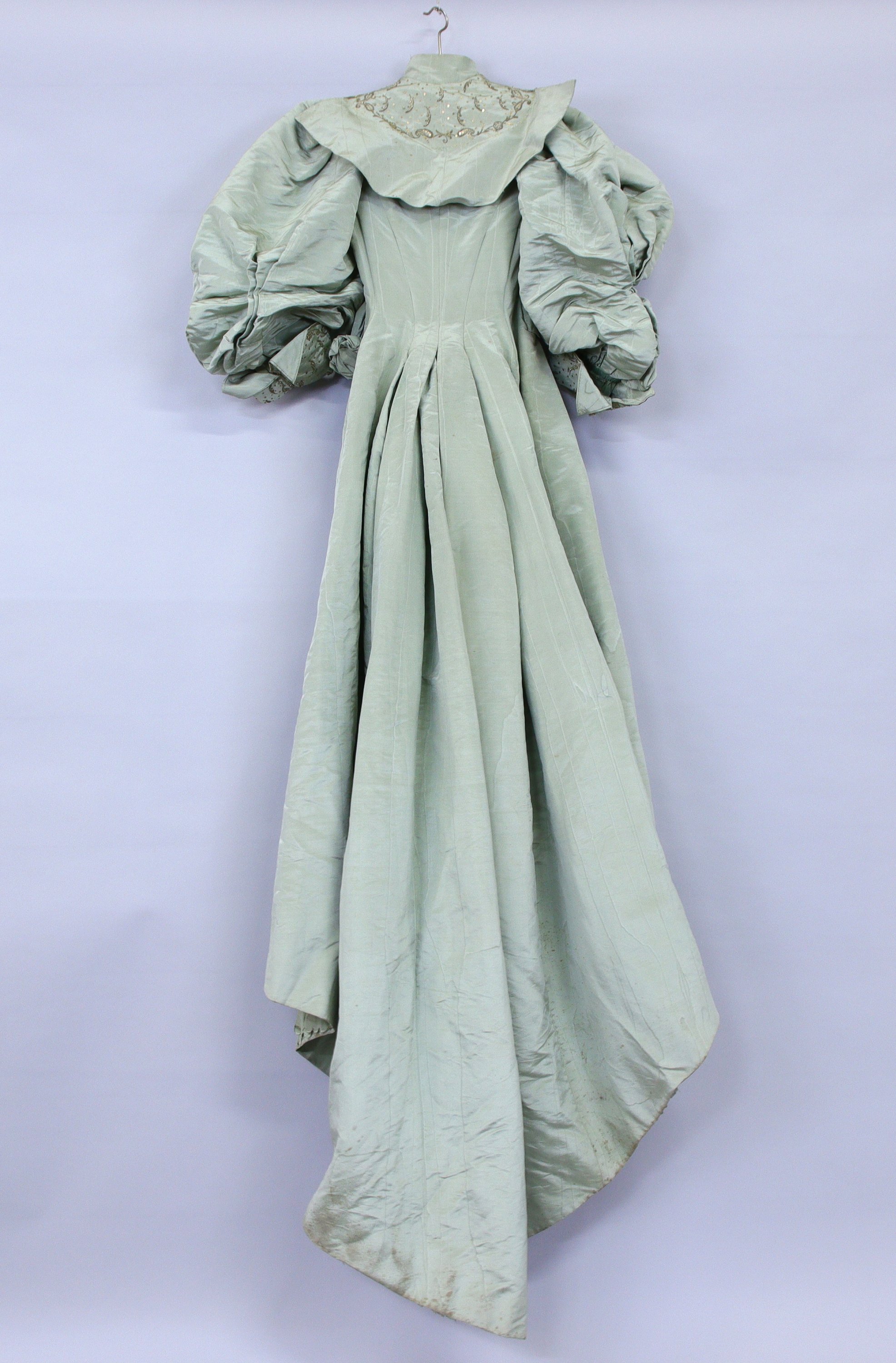 ROBE À TOURNURE moire et taffetas vert tilleul, à manches gigot, large col et manches brodées de perles de verre et paillerons de fleurs et palmes.