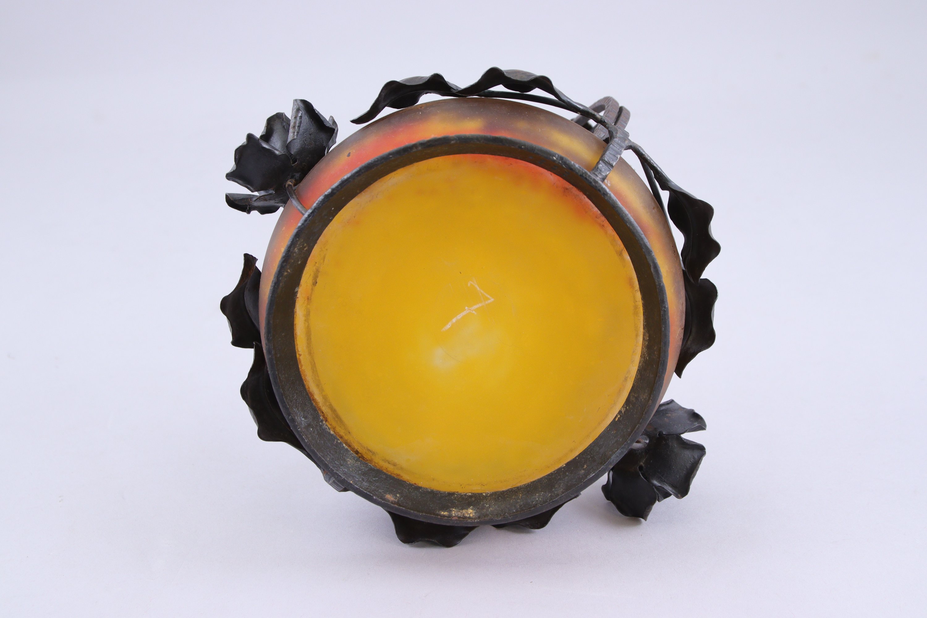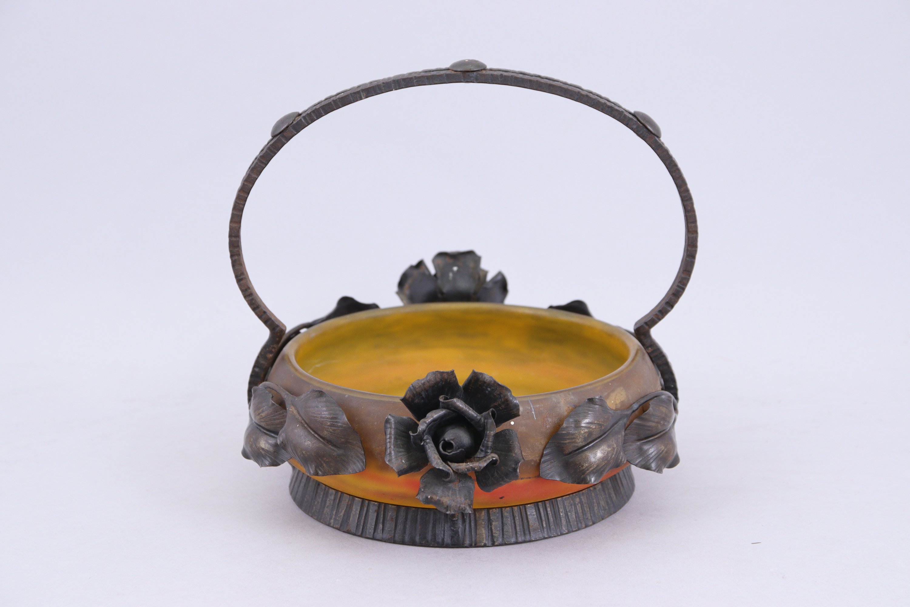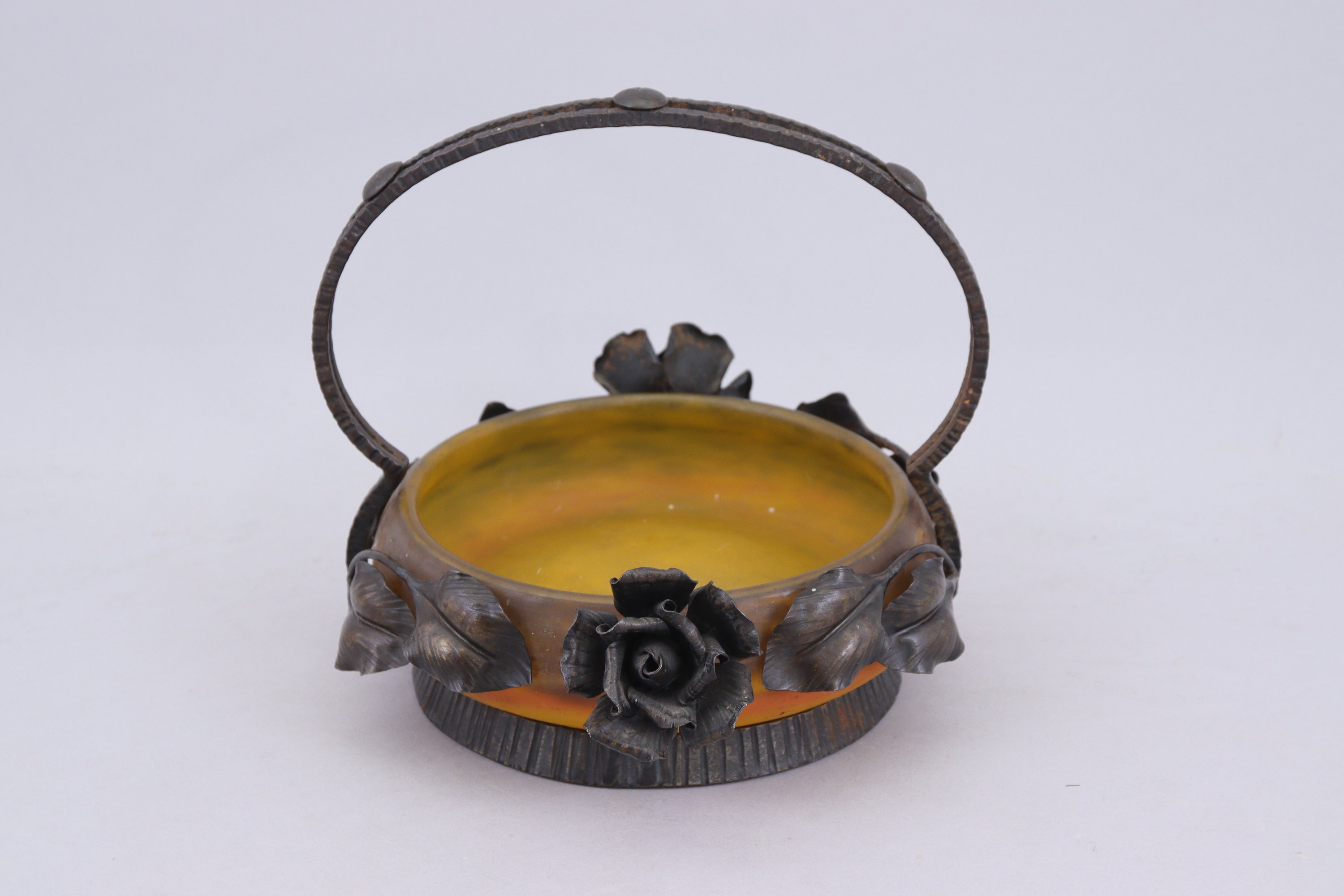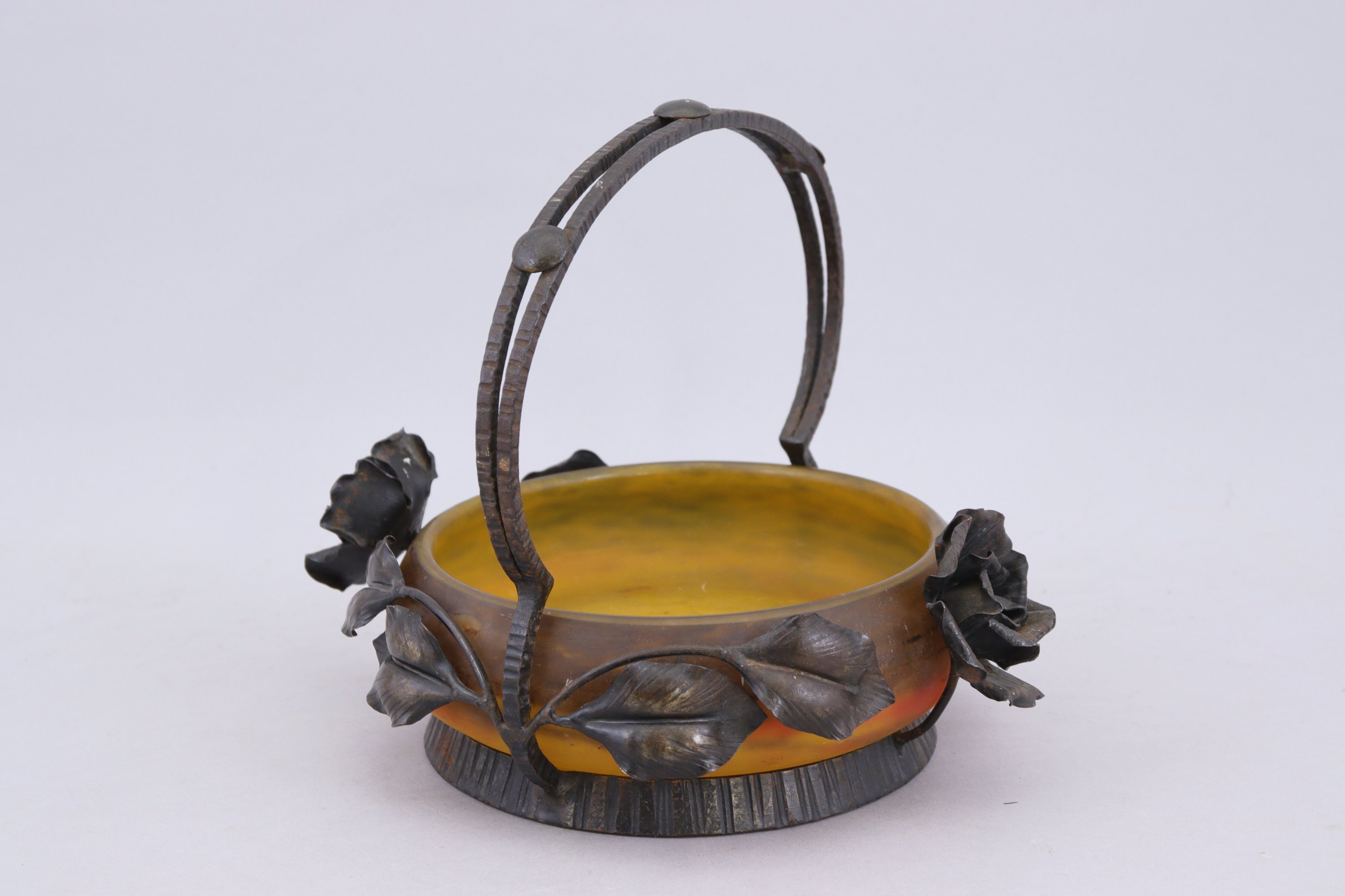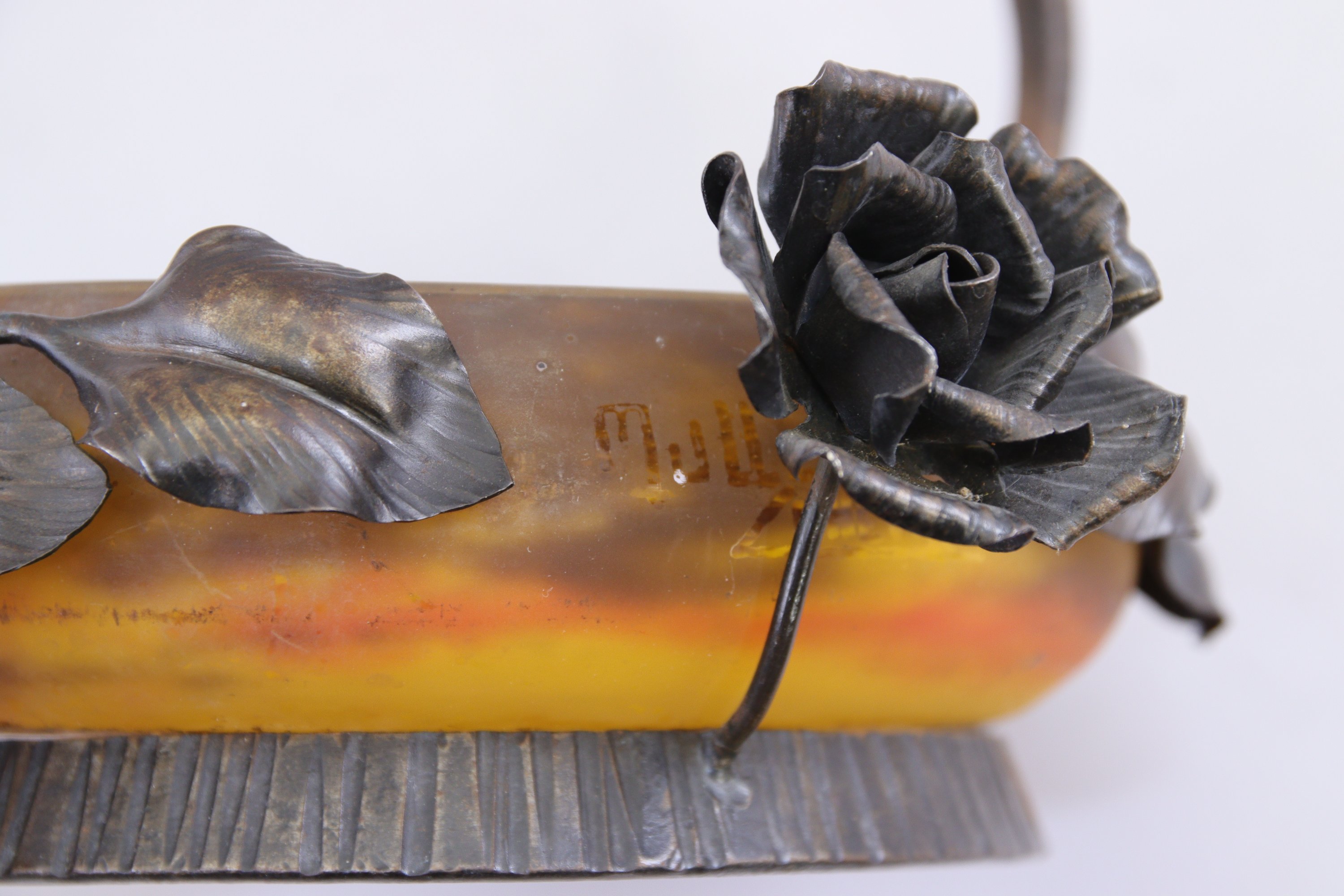 MULLER Frères Lunéville. PANIER en verre marmoréen et fer forgé ou battu aux boutons de roses. Signé.
