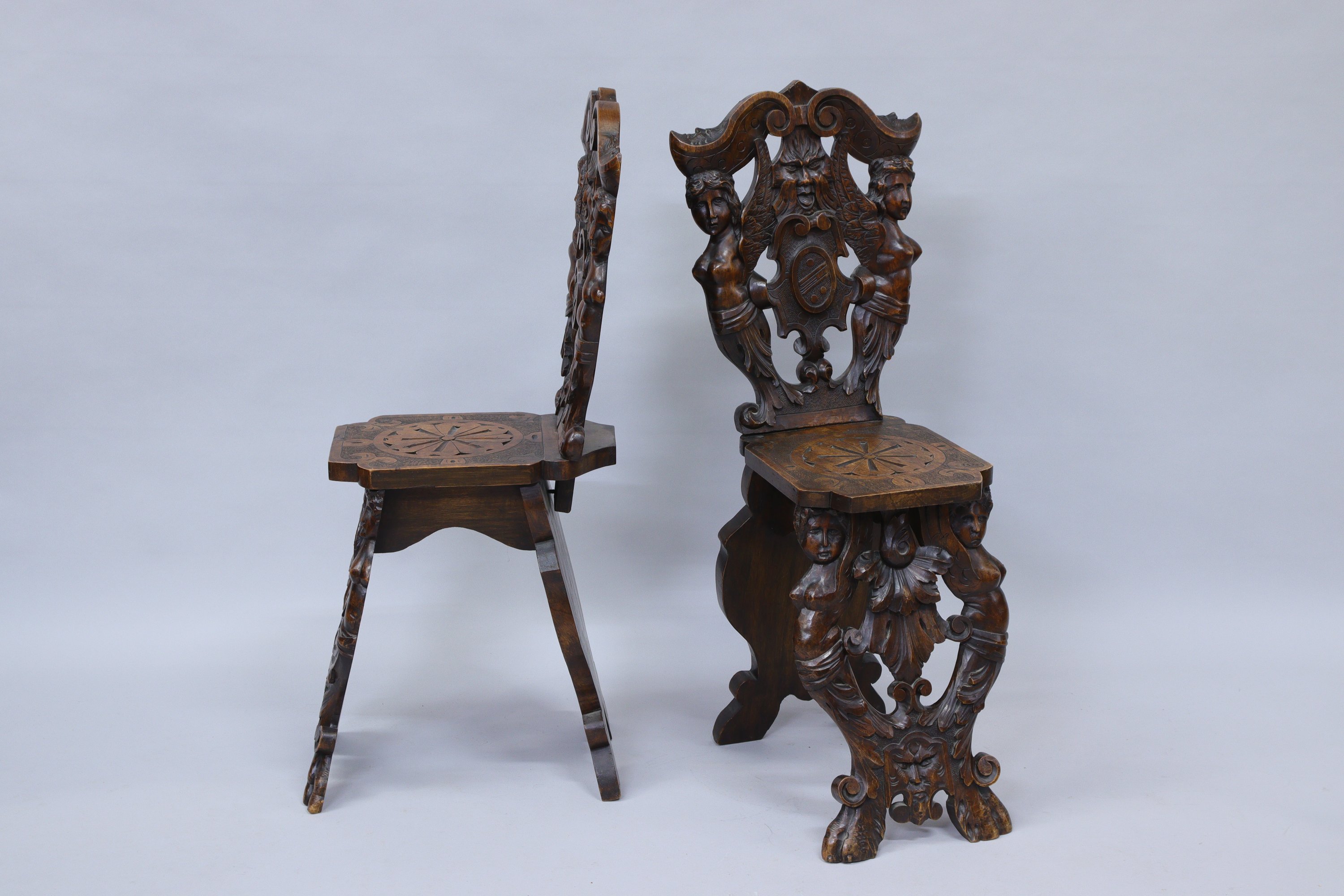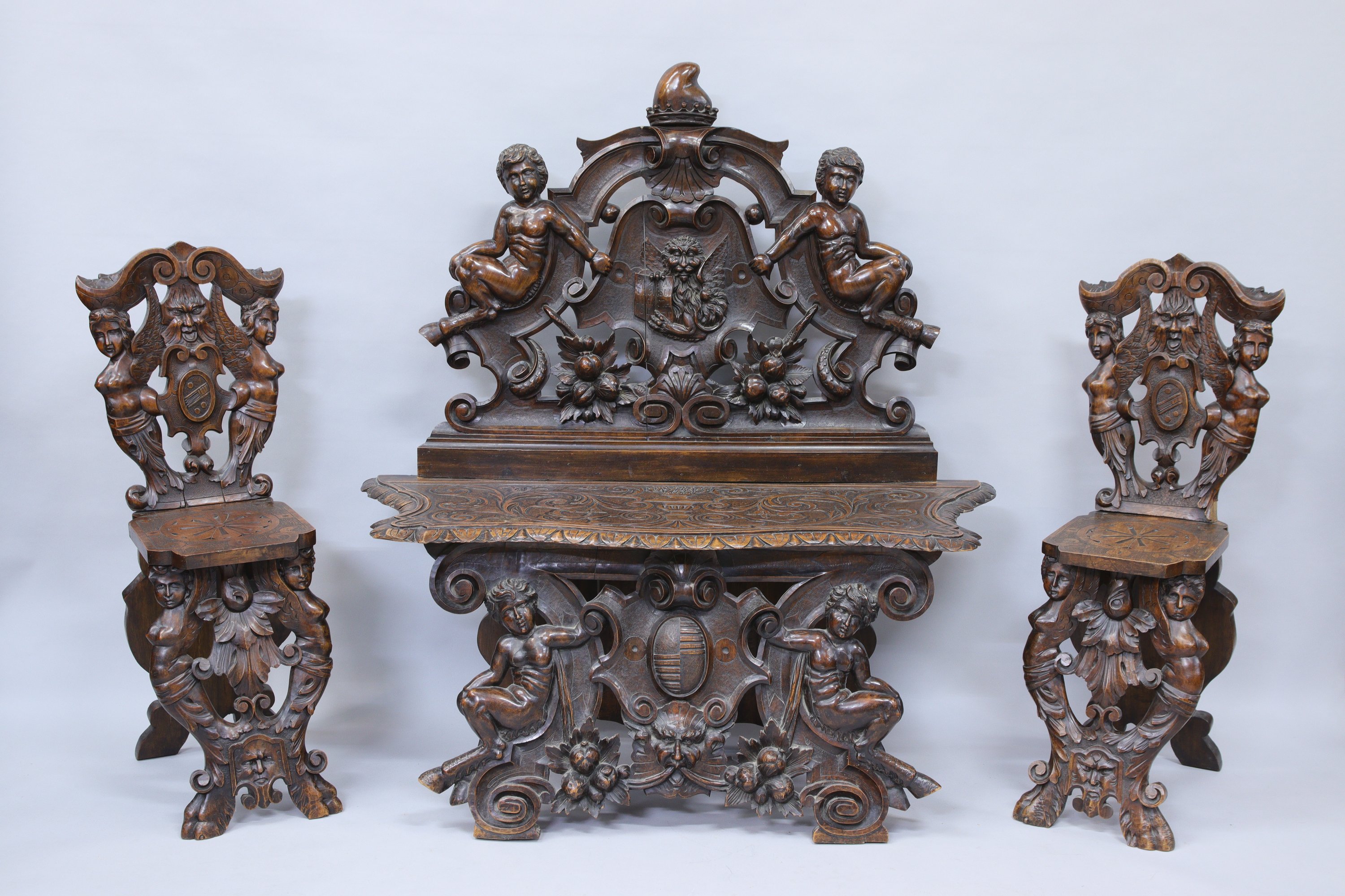Les chaises à dossiers droits surmontés de visages lunaires présentent des chimères adossées à un blason armorié, le piètement du même motif.