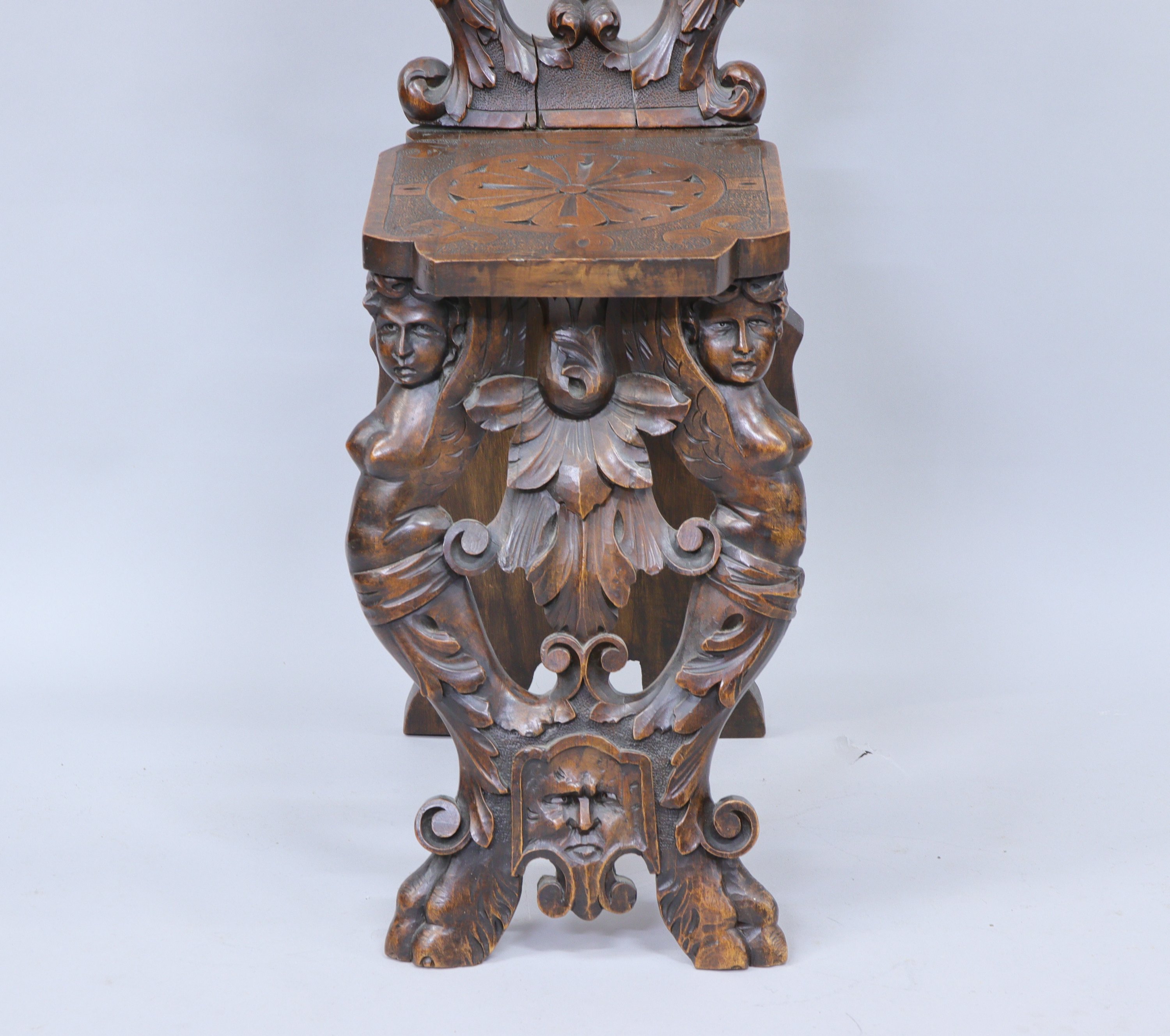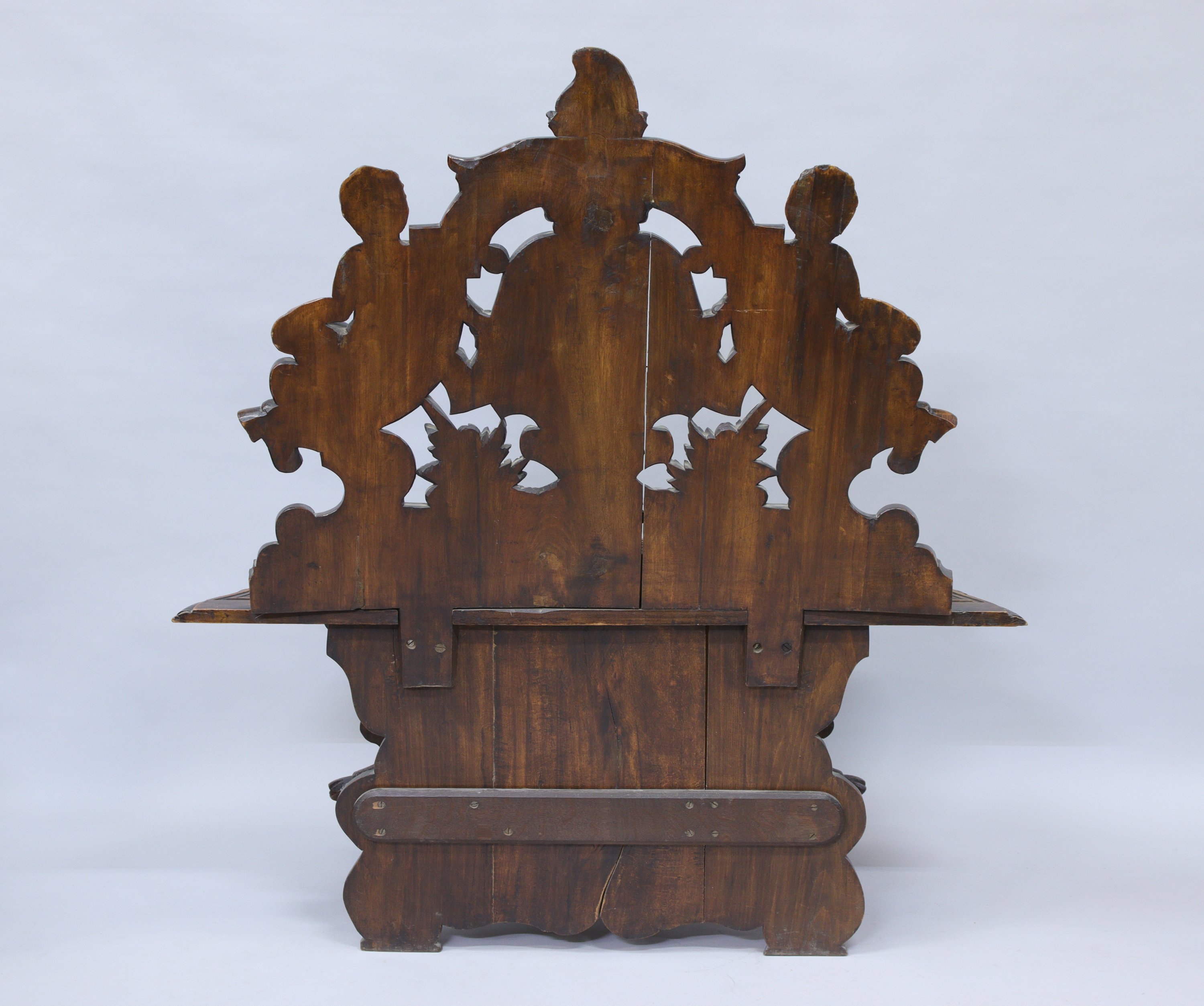 Le dossier du banc orné de deux putti bachiques entourant le lion de Saint Marc surmonté du bonnet des doges de Venise. L'assise gravée d'un vase et d'entrelacs, le piétement avec aux mêmes putti tenant des armoiries dans un enroulement de cuir.