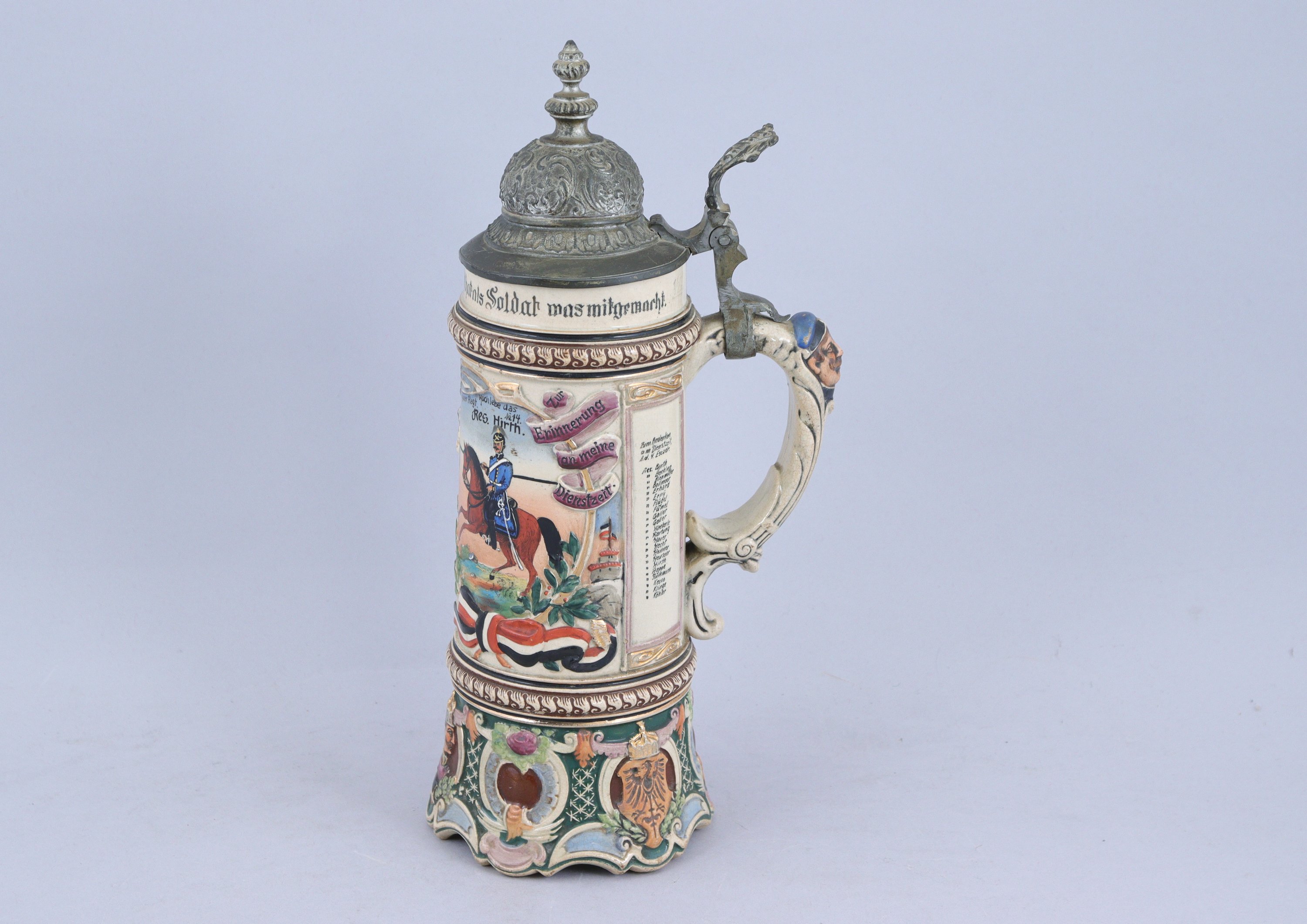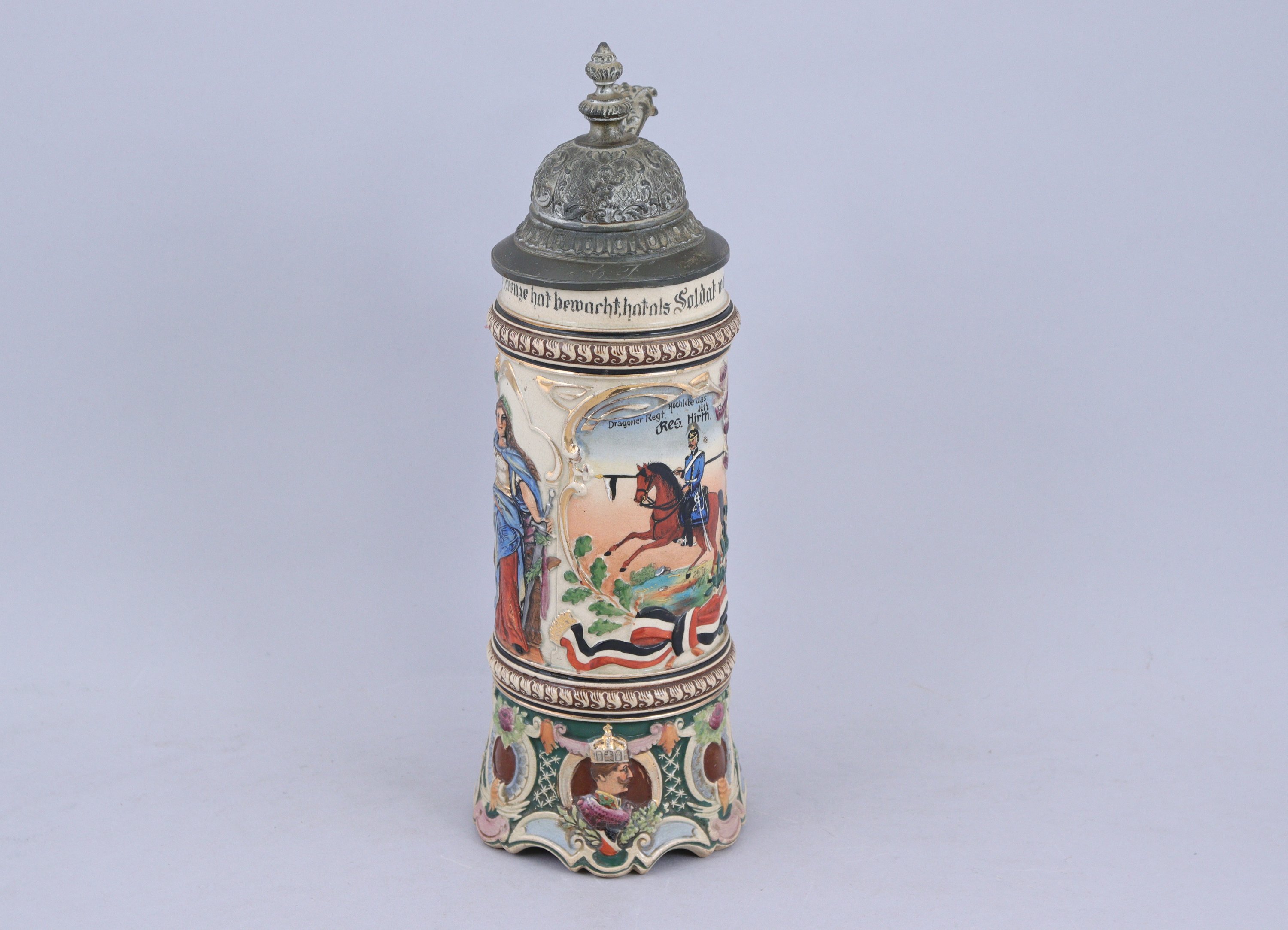 ALLEMAGNE. Belle CHOPE DU RÉSERVISTE HIRTH du 16e régiment de dragons de "Collmar", 1906-1909. Couvercle en étain orné d'arabesques. Le corps en céramique à décor polychrome du dragon à cheval et d'une allégorie de l'Allemagne avec les noms de la réserve. La base à décor d'armoiries et du Kaiser dans des treillages.