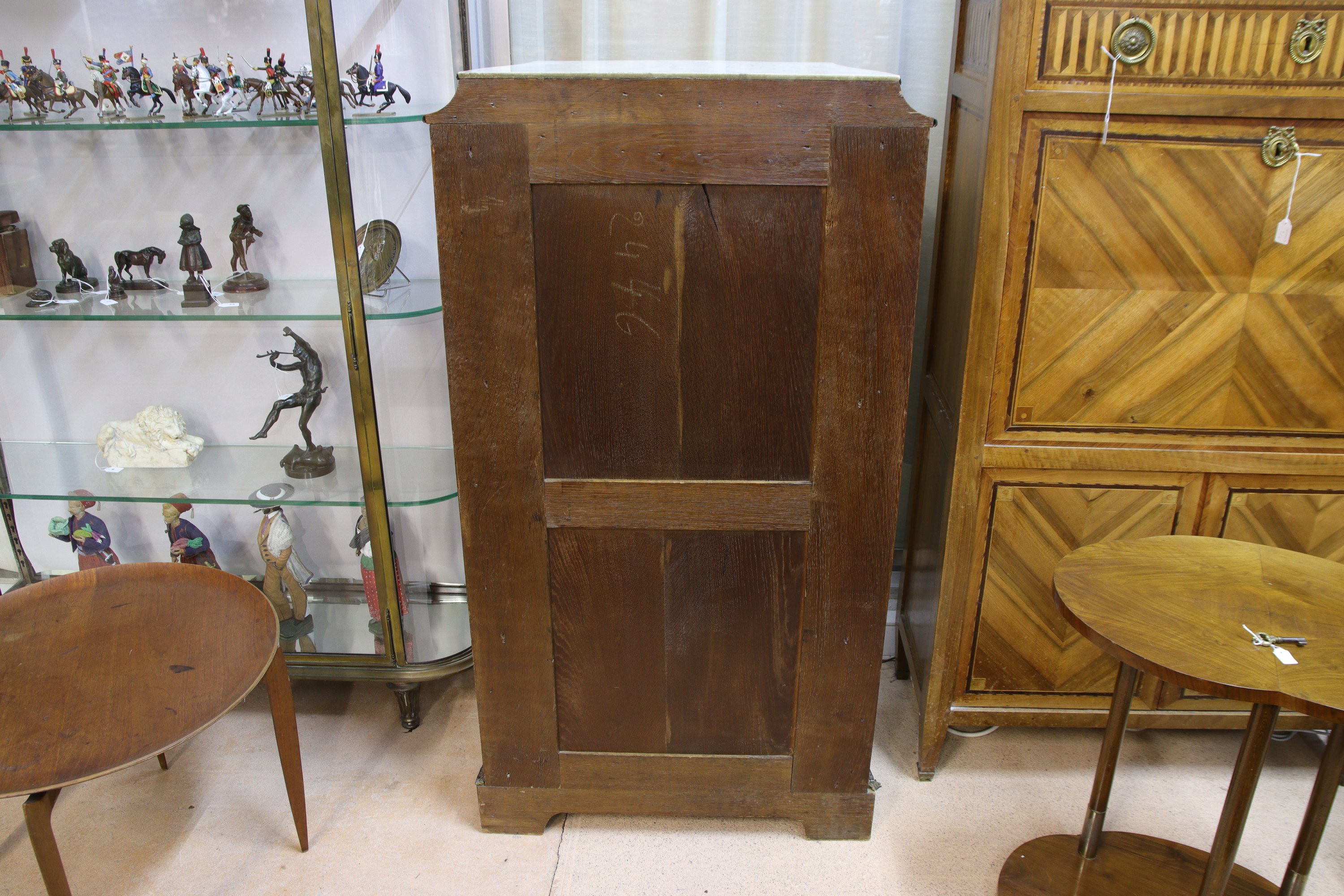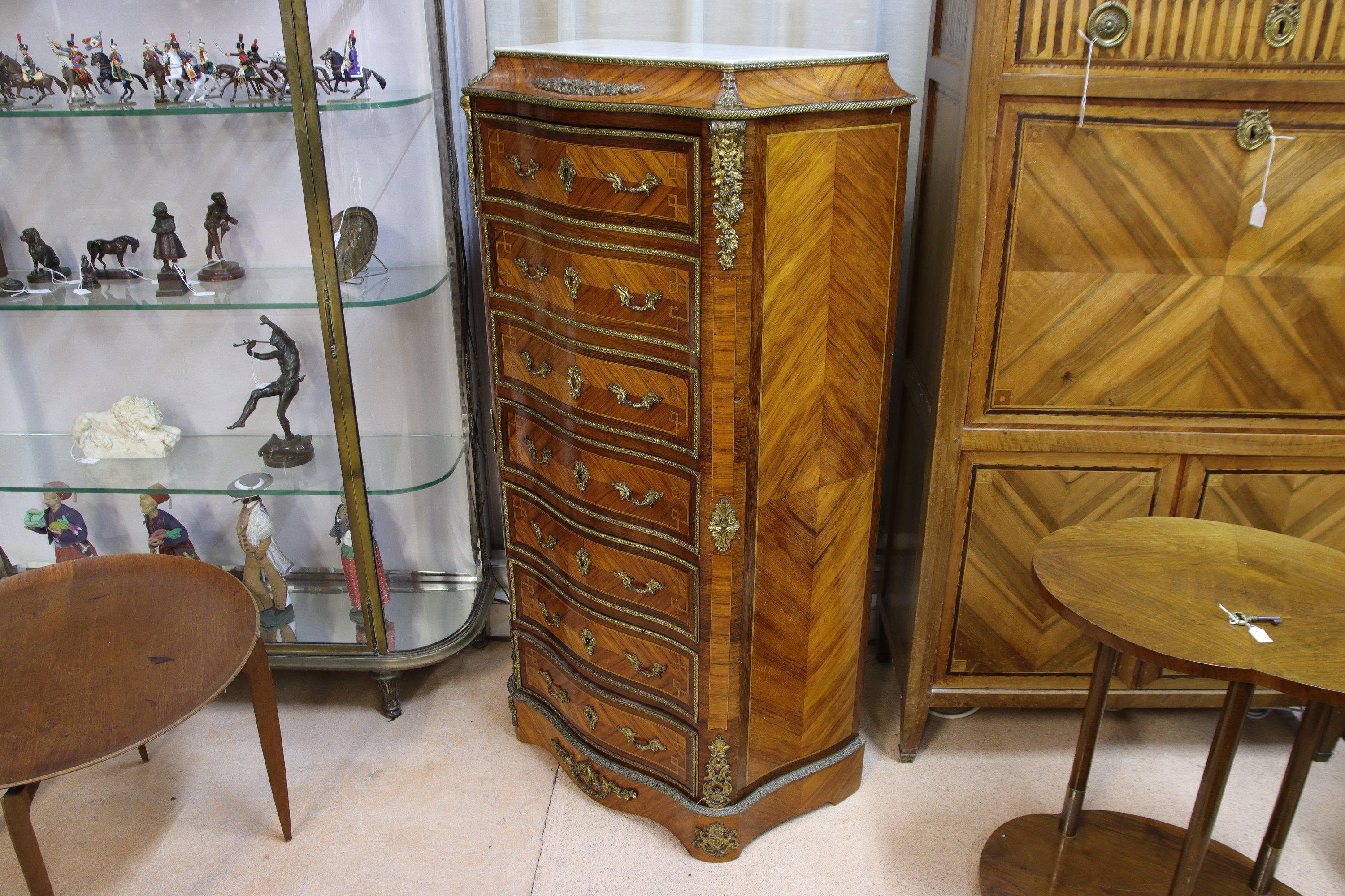 SECRÉTAIRE DROIT en forme de SEMAINIER en bois de placage à la façade ouvrant par un abatant et quatre tiroirs dissimulé par une façade de sept tiroir. Dessus de marbre blanc et ornementation de bronze doré.