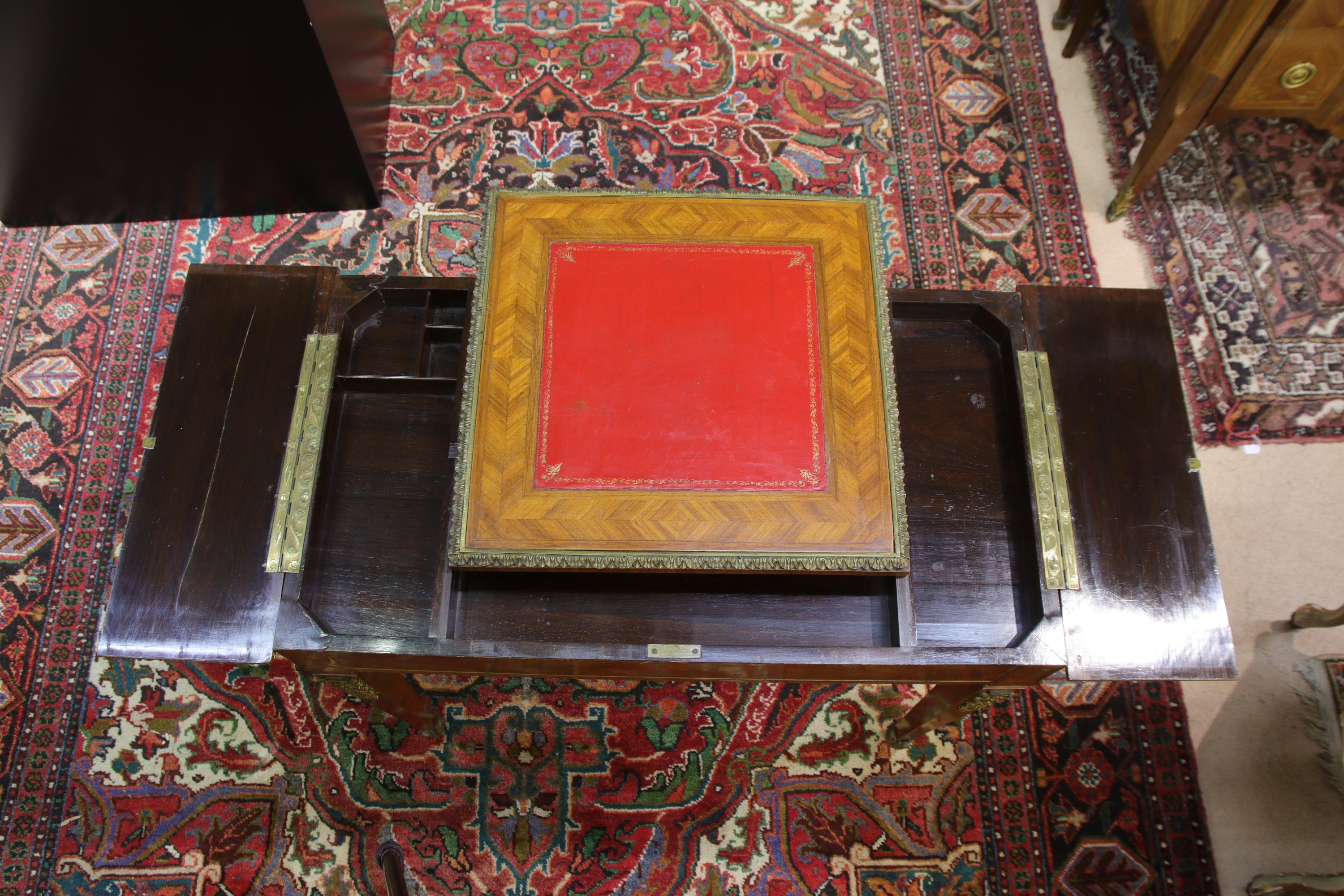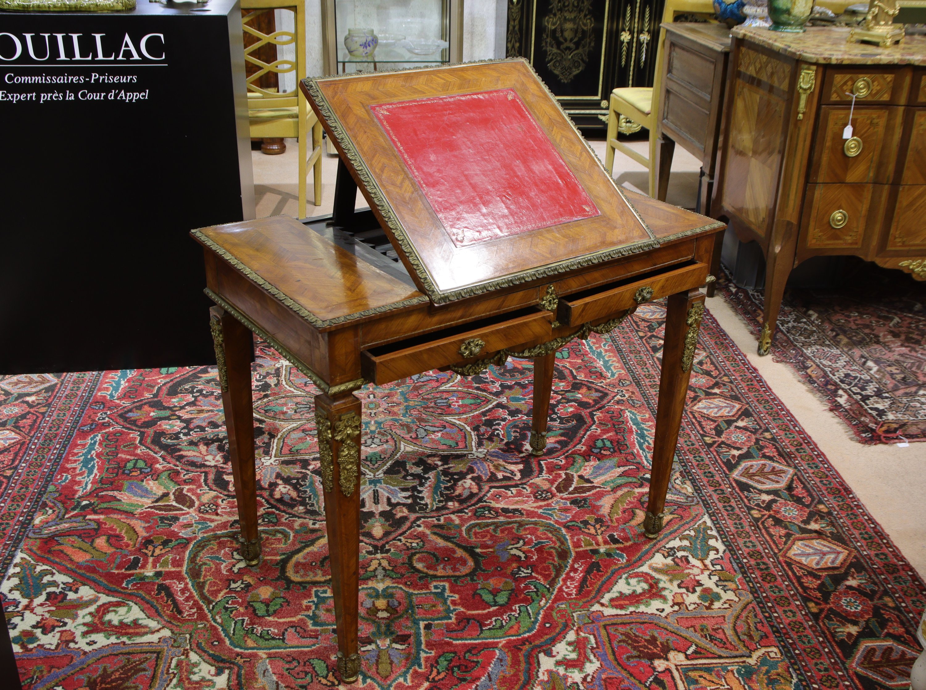 Petit BUREAU formant PUPITRE en bois de placage de forme rectangulaire reposant sur quatre pieds gaine au plateau ouvrant par un pupitre gainé de cuir bordeaux et deux casiers. Riche ornementation en bronze doré.
