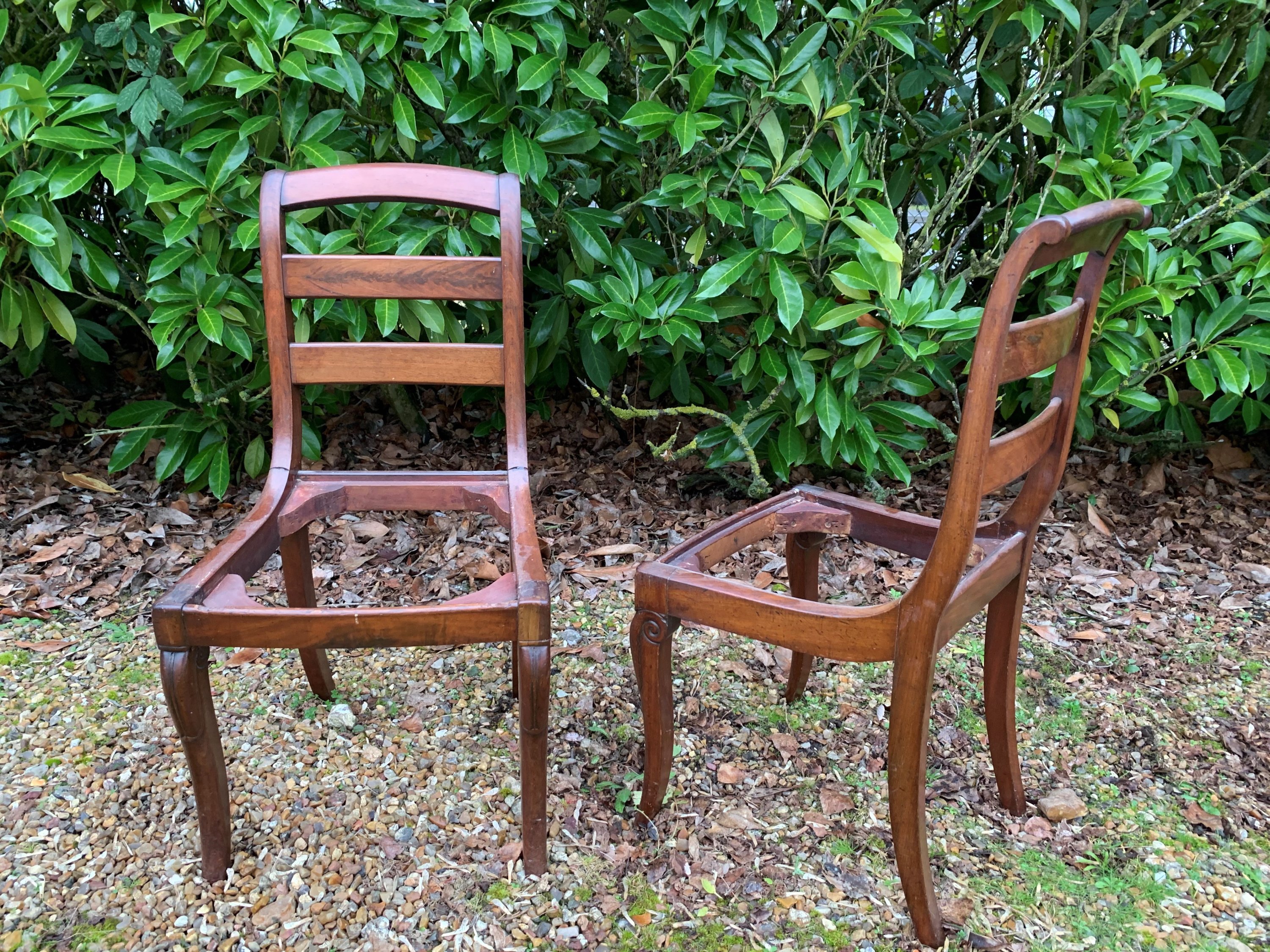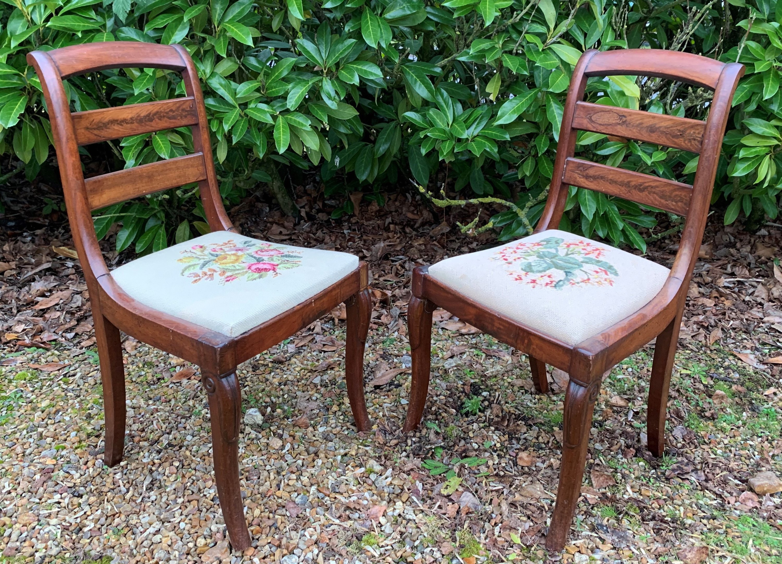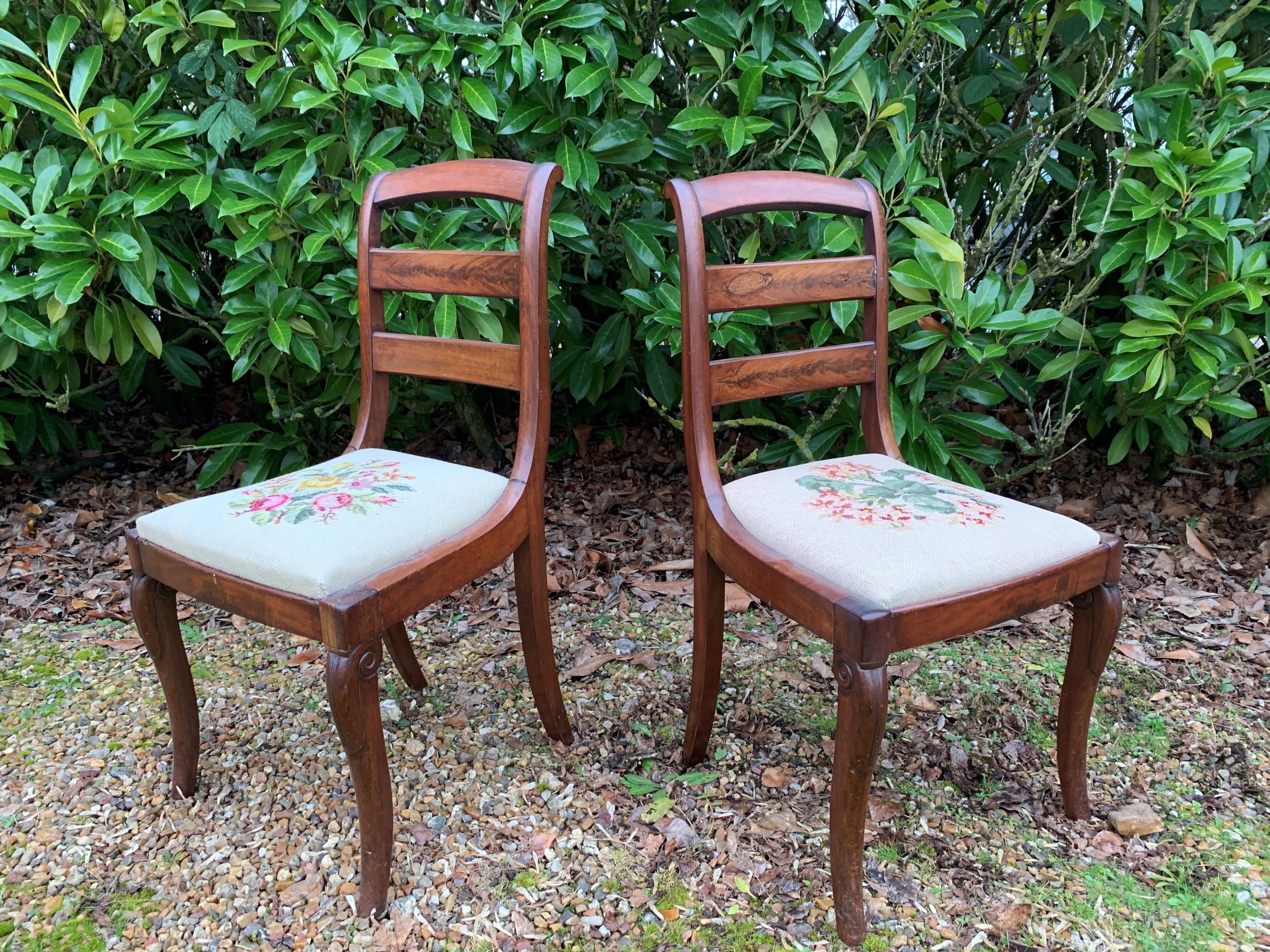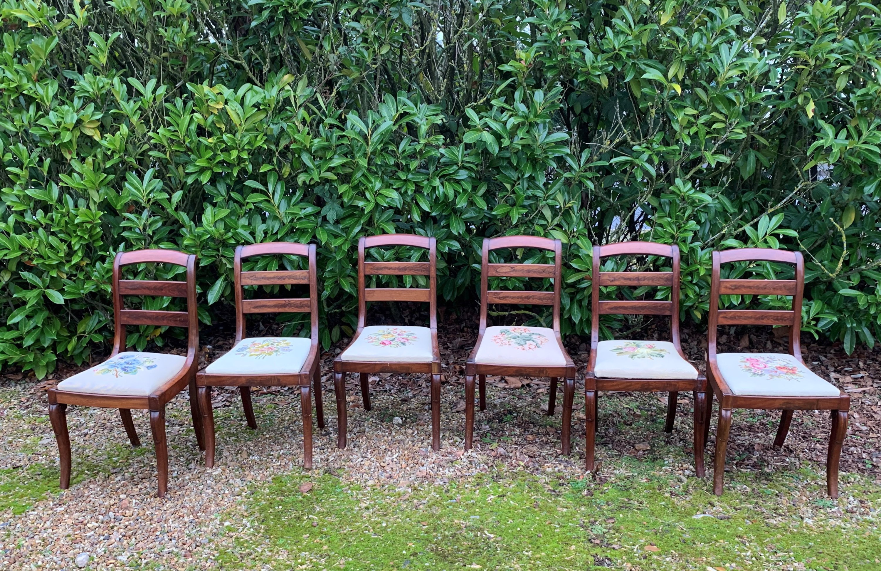 Six CHAISES en acajou. Dossier à léger enroulement. Assise crème brodée de fleurs. Piétement antérieur cambré débutant en volute en et piétement postérieur en sabre.