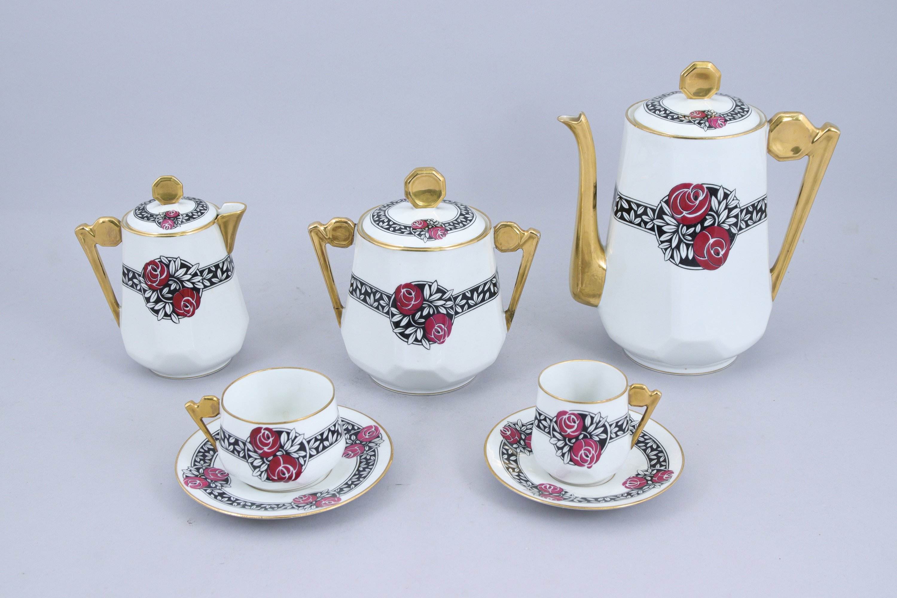LIMOGES. CHABROL et POIRIER. SERVICE à THÉ-CAFÉ en porcelaine polychrome. 47 pièces : une cafetière, un sucrier, un pot à lait, 10 tasses à café et leurs soucoupes (+2) et 12 tasses à thé et leurs soucoupes (+ 2). Décor de feuilles et roses stylisées, noir, rouge et or.
