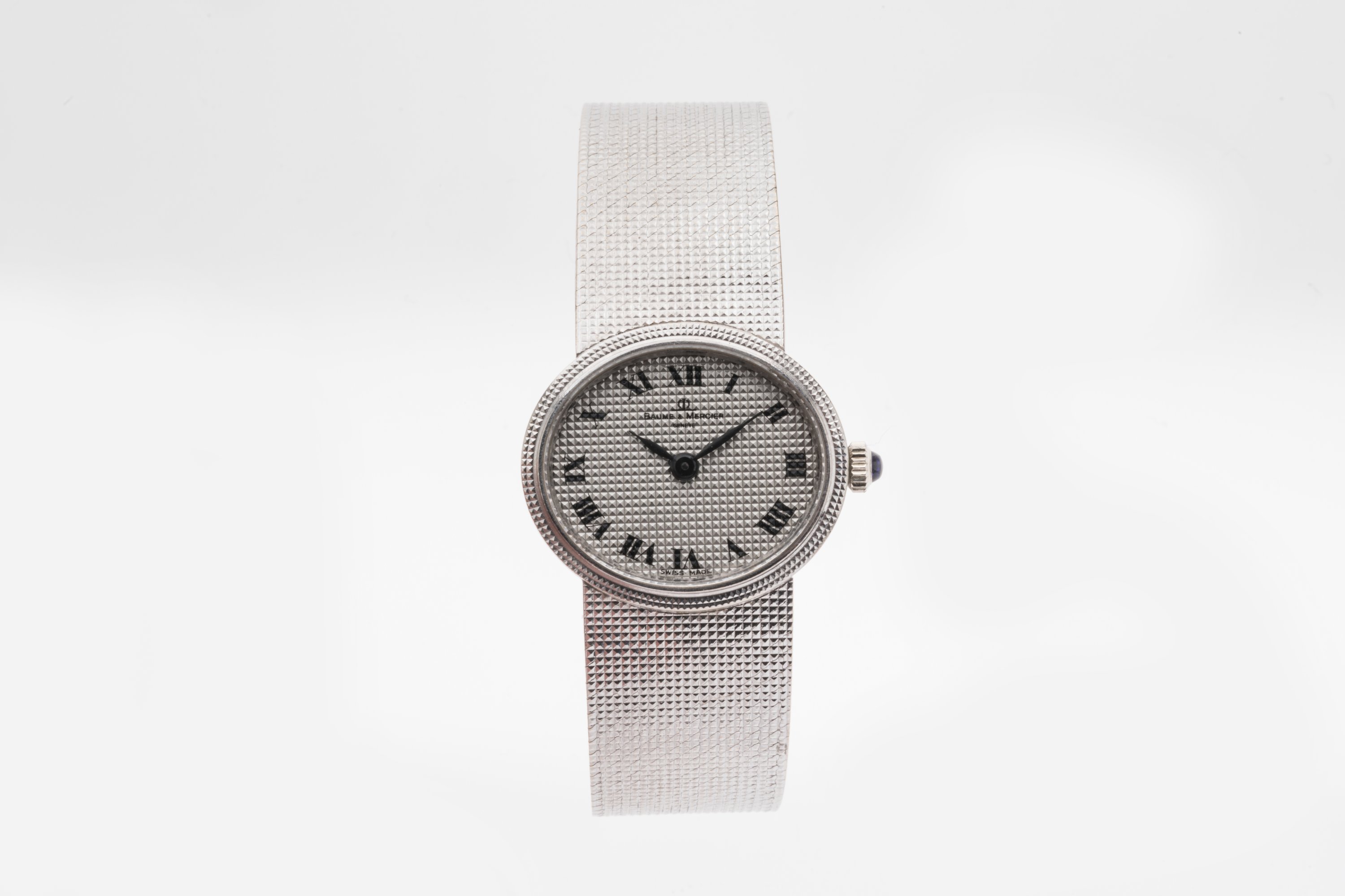 BAUME ET MERCIER. MONTRE BRACELET DE DAME en platine et or blanc. Cadran ovale avec les heures en chiffres romains et remontoir orné d'une pierre bleue à trois heures. Mouvement mécanique.