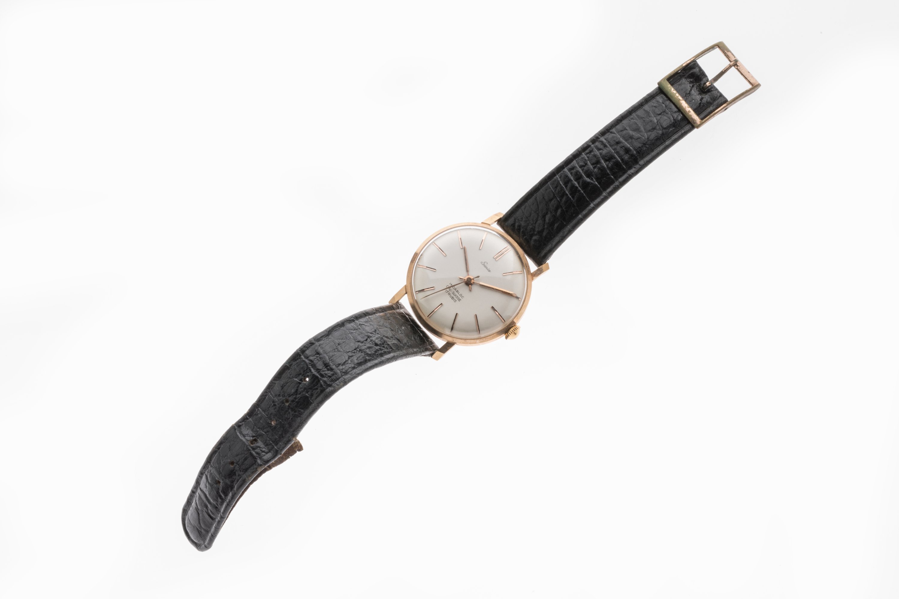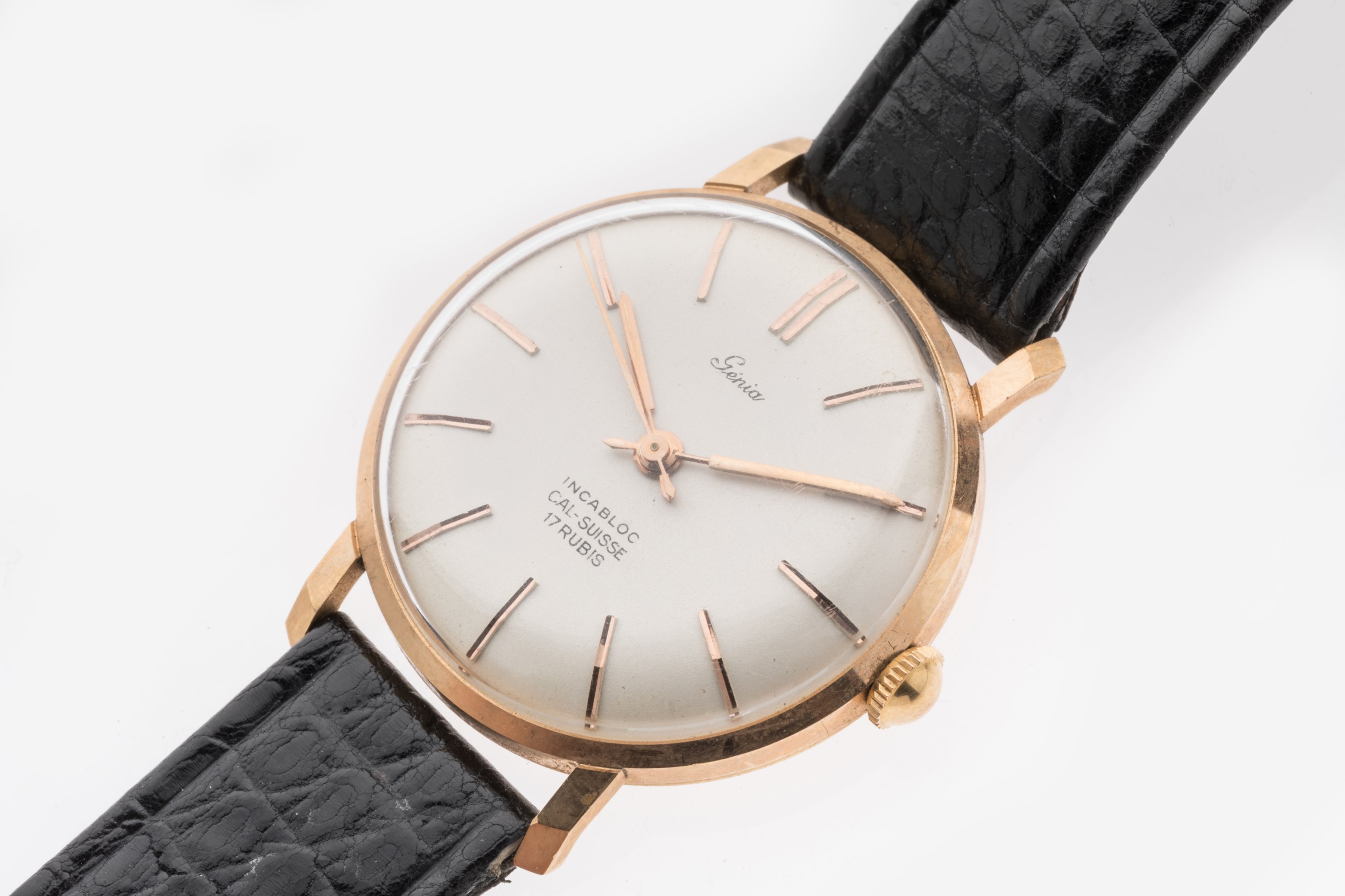 GÉNIA. MONTRE BRACELET en or jaune 750 millièmes figurant les heures par des index. Mouvement à remontage manuel 17 RUBIS. Ardillon en métal doré.