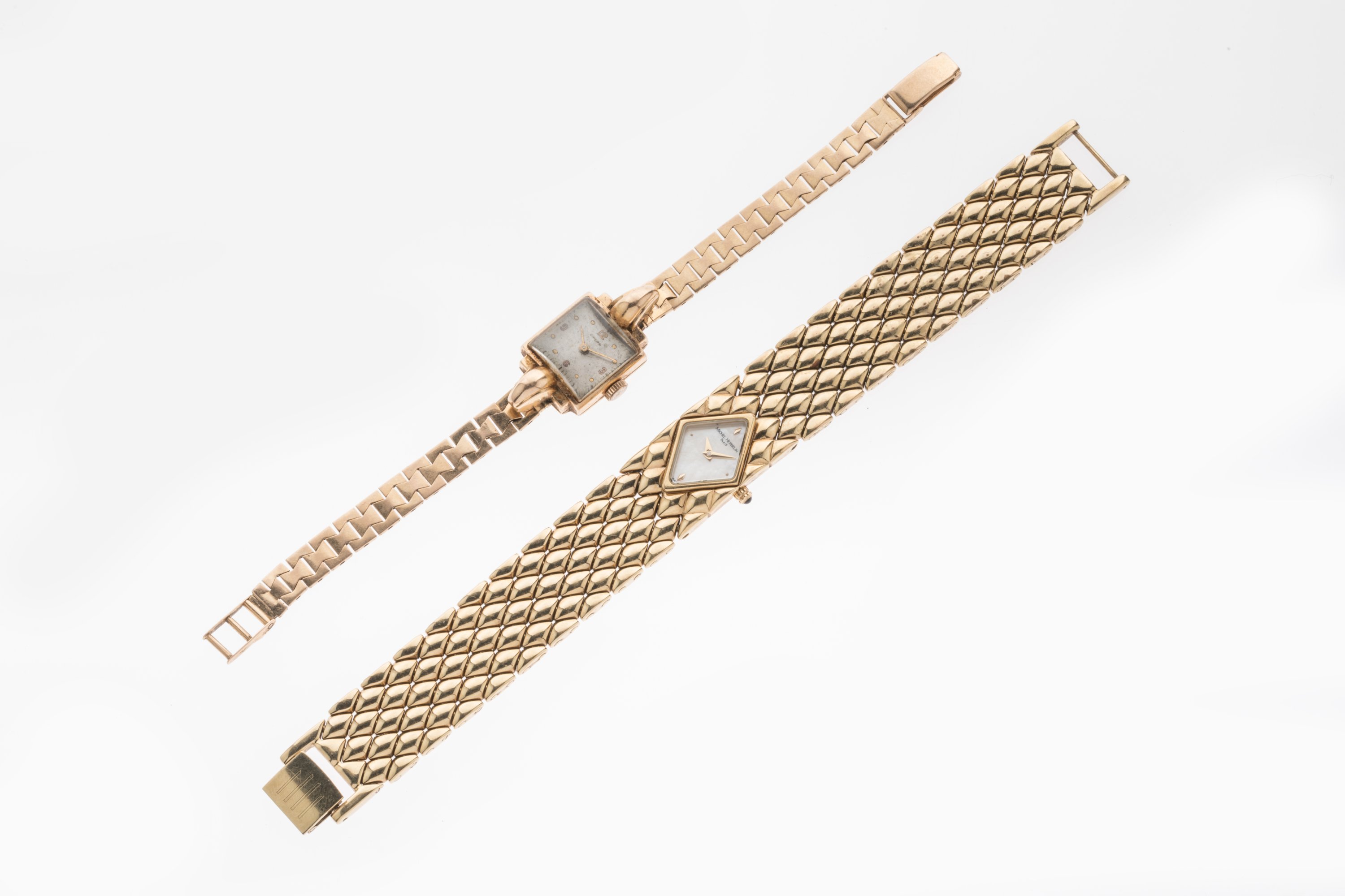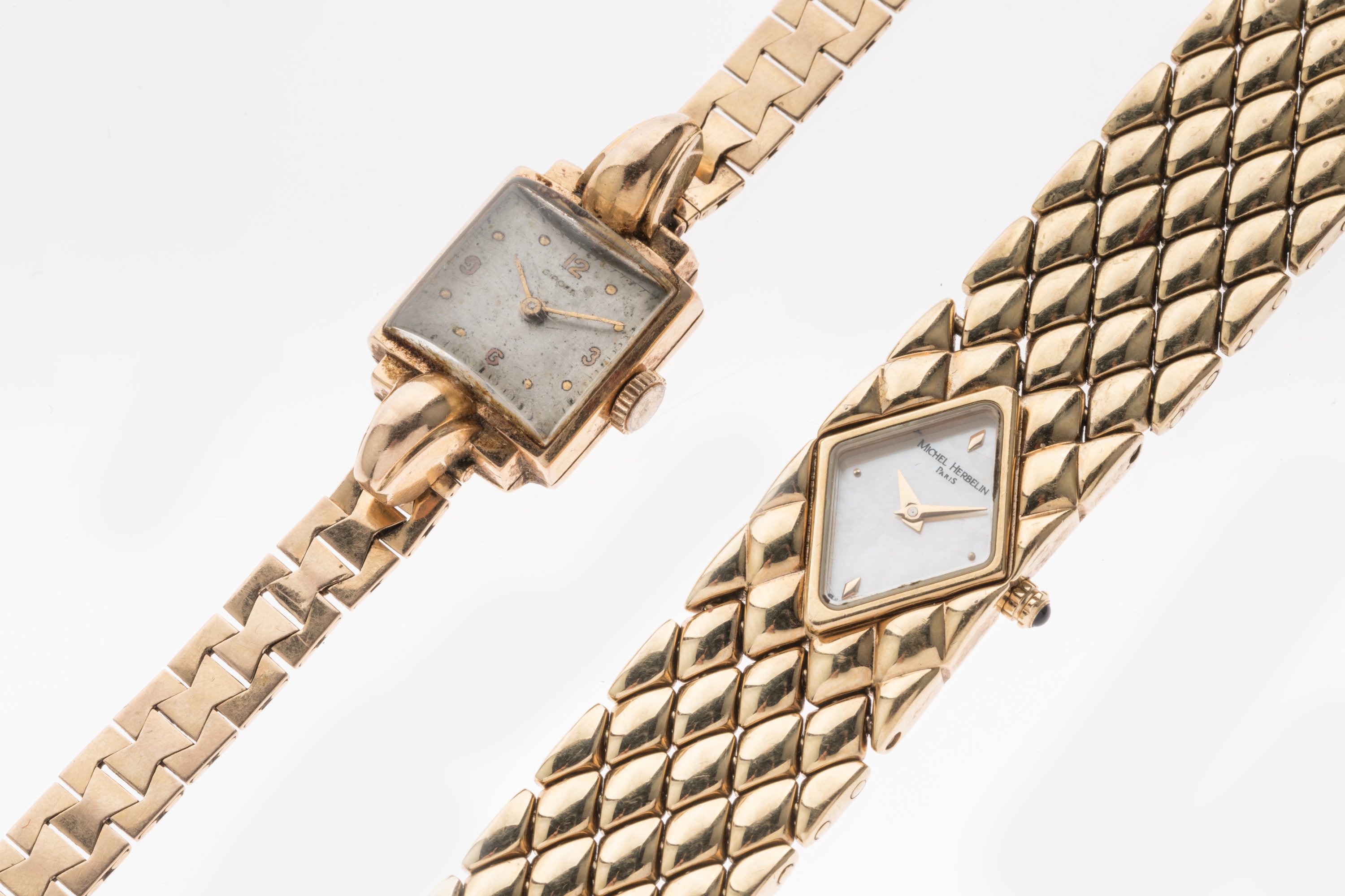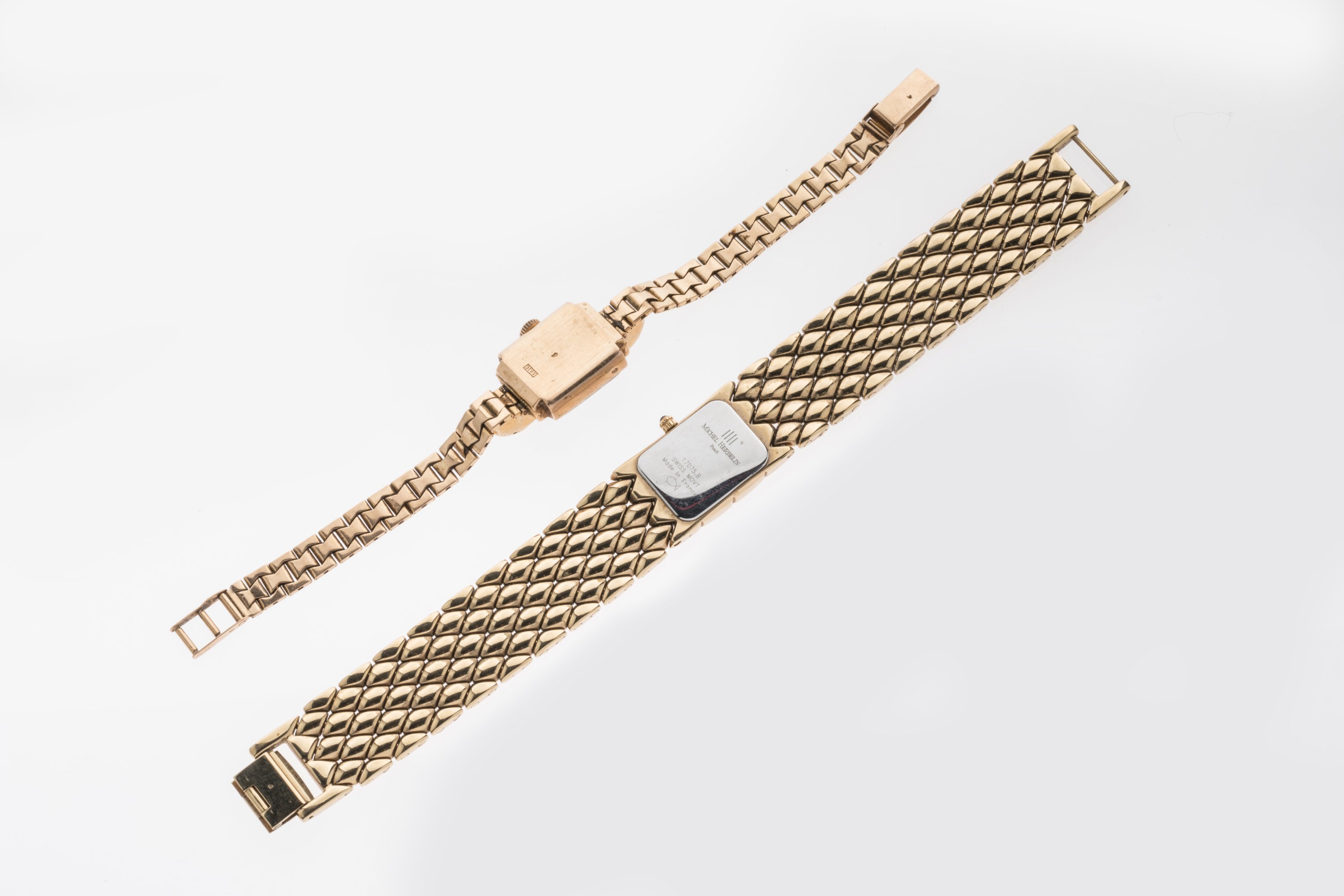 JOINT. Michel HERBELIN, MONTRE DE DAME en métal doré. Le cadran nacré est en forme de losange. Les index indiquent 3, 6, 9 et douze heures. Le remontoir est à 3 heures. Le poignet est à mailles carrées bombées donnant un effet matelassé à l'ensemble.