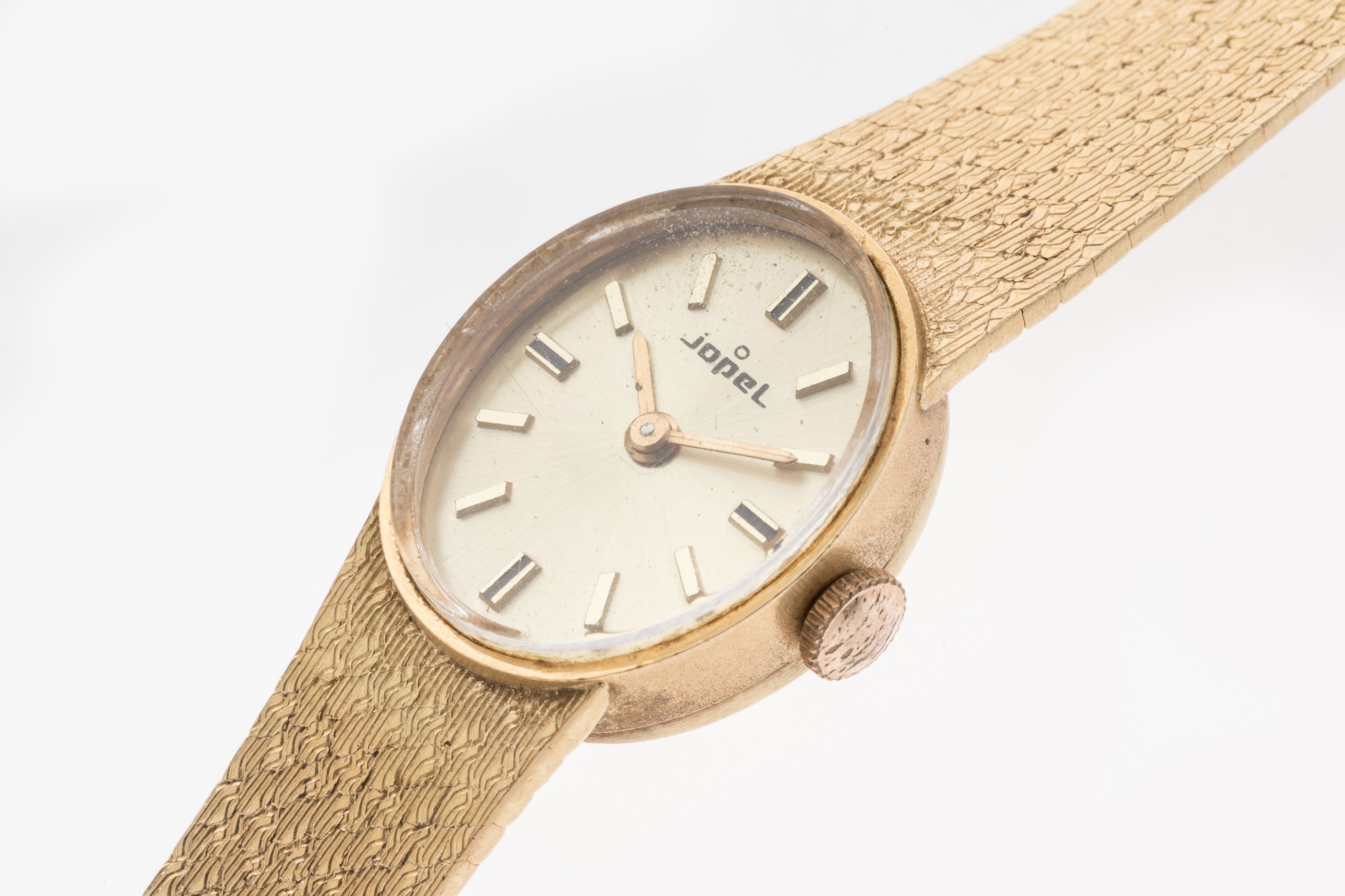 JOPEL. MONTRE DE DAME en or jaune 750 millièmes, le cadran ovale à fond doré figurant les heures par des index. Bracelet articulé en or.