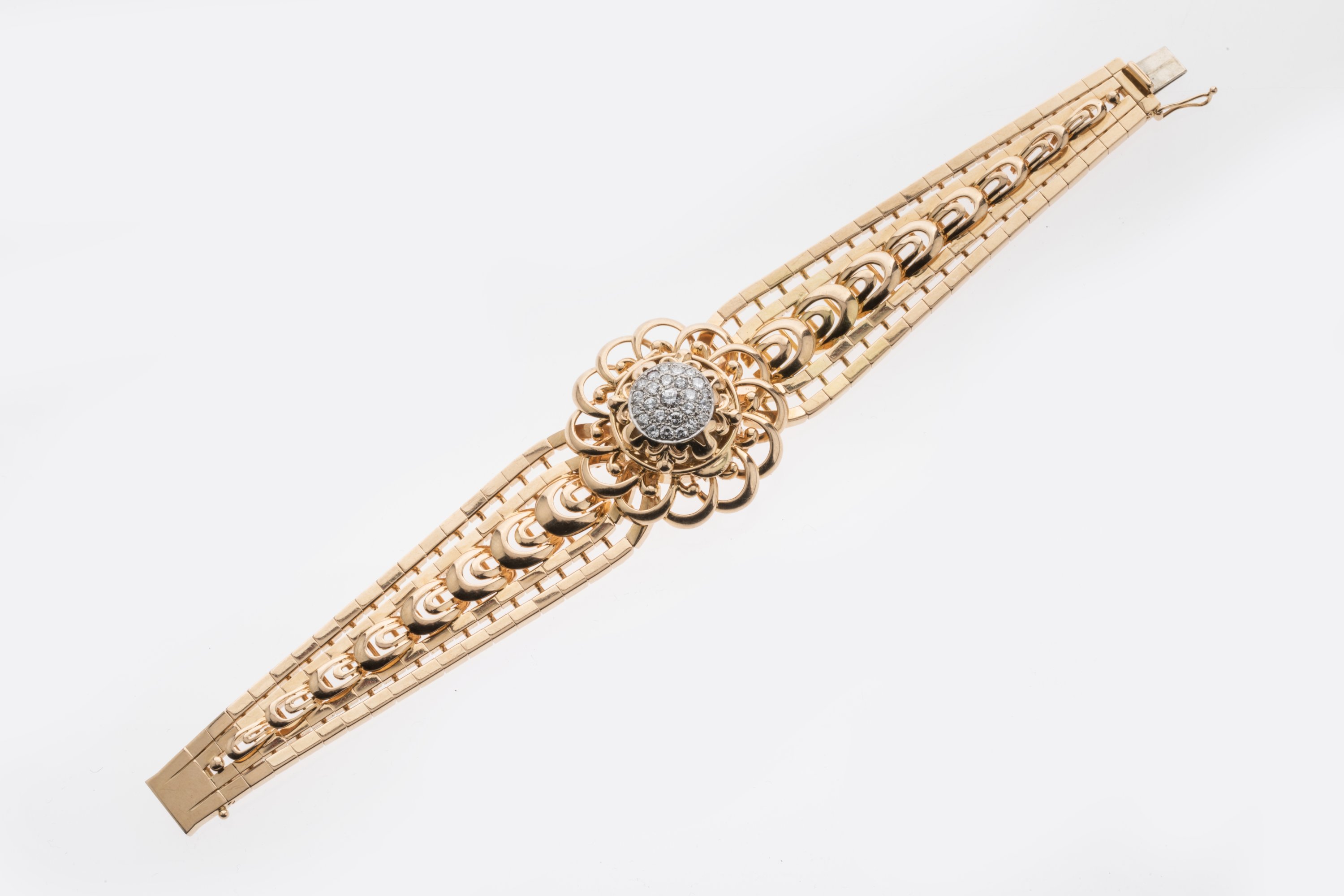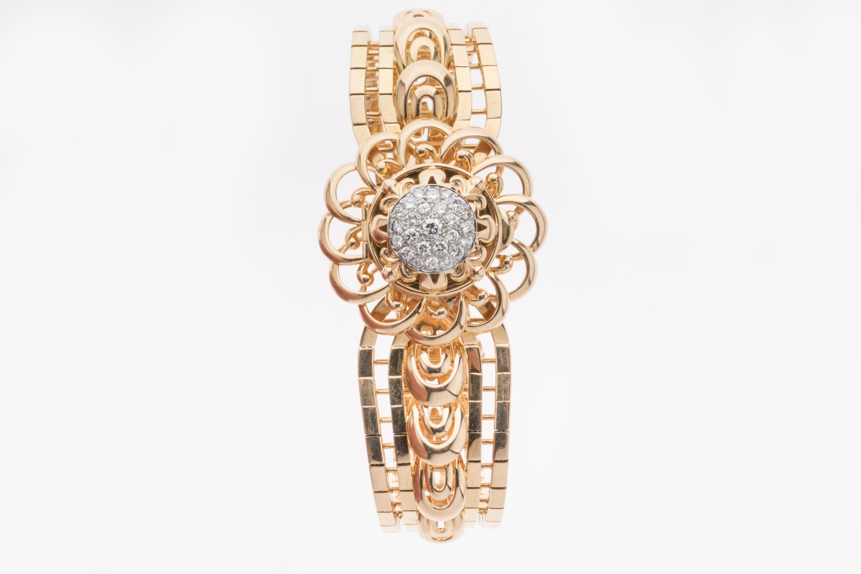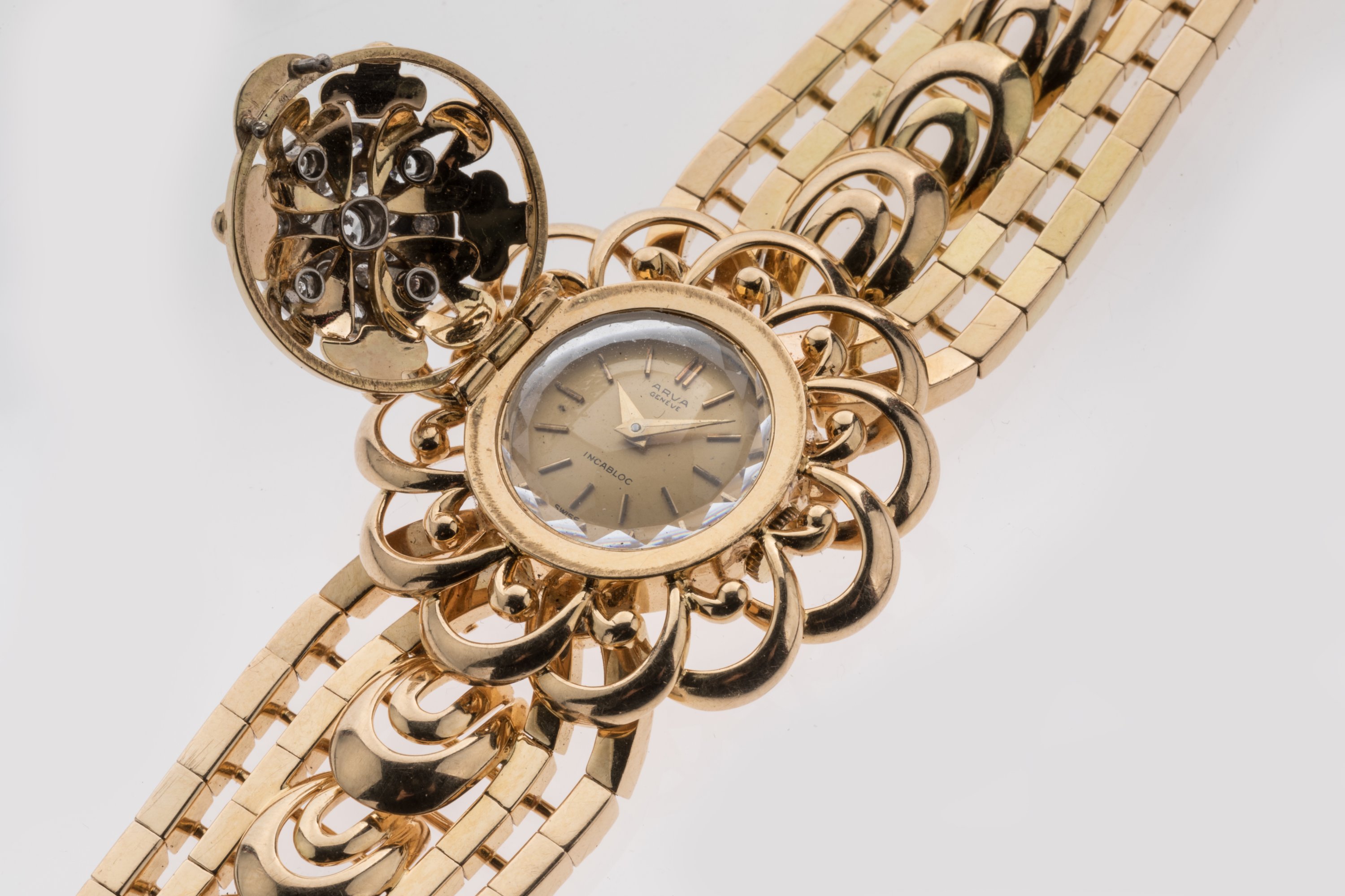ARYA. MONTRE BRACELET de DAME en or jaune 750 millièmes. Le bracelet en maille articulée. Le cadran recouvert d'une fleur sertie de diamants. Le cadran en or jaune figurant les heures par des bâtonnets, signé Arva. Le mouvement à remontage manuel.